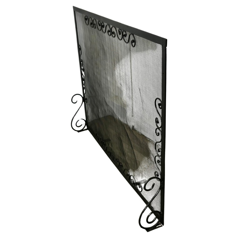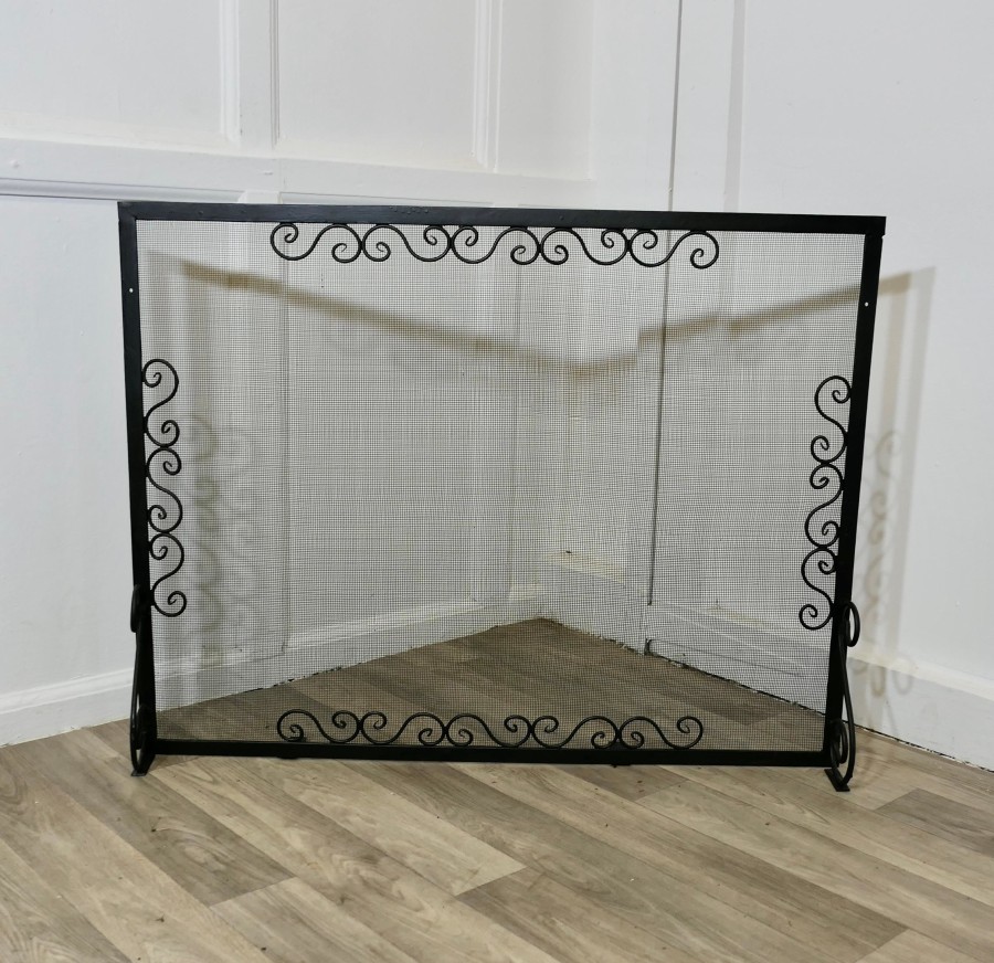 Large Old Wrought Iron Fire Screen This is a very useful piece, with a fine mesh spark guard and decorative iron work In good sound used condition and a very attractive addition to any Fire Place The screen, is 33” wide, 26” tall and 7” deep at the floor TZX31 Manufacture Date : 19th century Materials : Iron