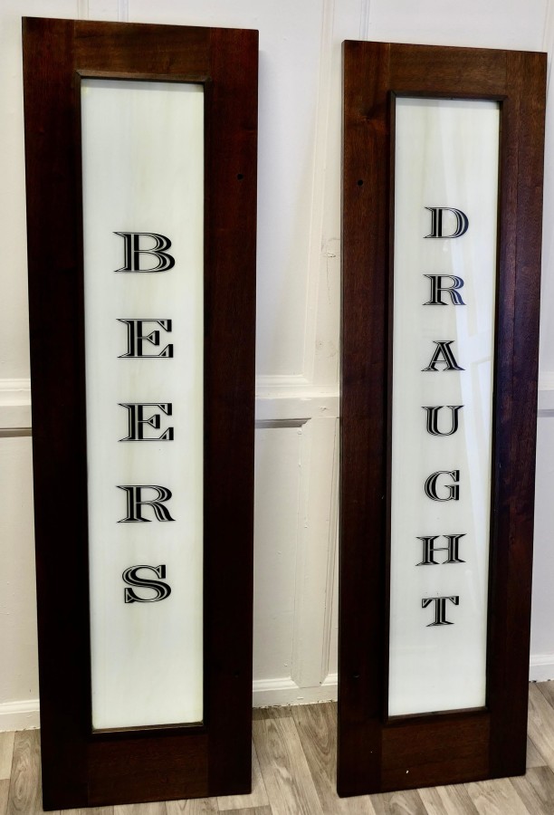 Large Opaline Glass Pub Signs “Draught Beers” Saved During Refurbishment, these very good quality signs are framed in solid Walnut, the signs “DRAUGHT” %26 “BEERS” are on very attractive Opaline glass which has waves in pale blue and cream We have more of these Beverage Signs available, all different The Signs are 57” tall, 16” wide and 1” thick each TNG156 Manufacture Date : 1960 Materials : Art-glass