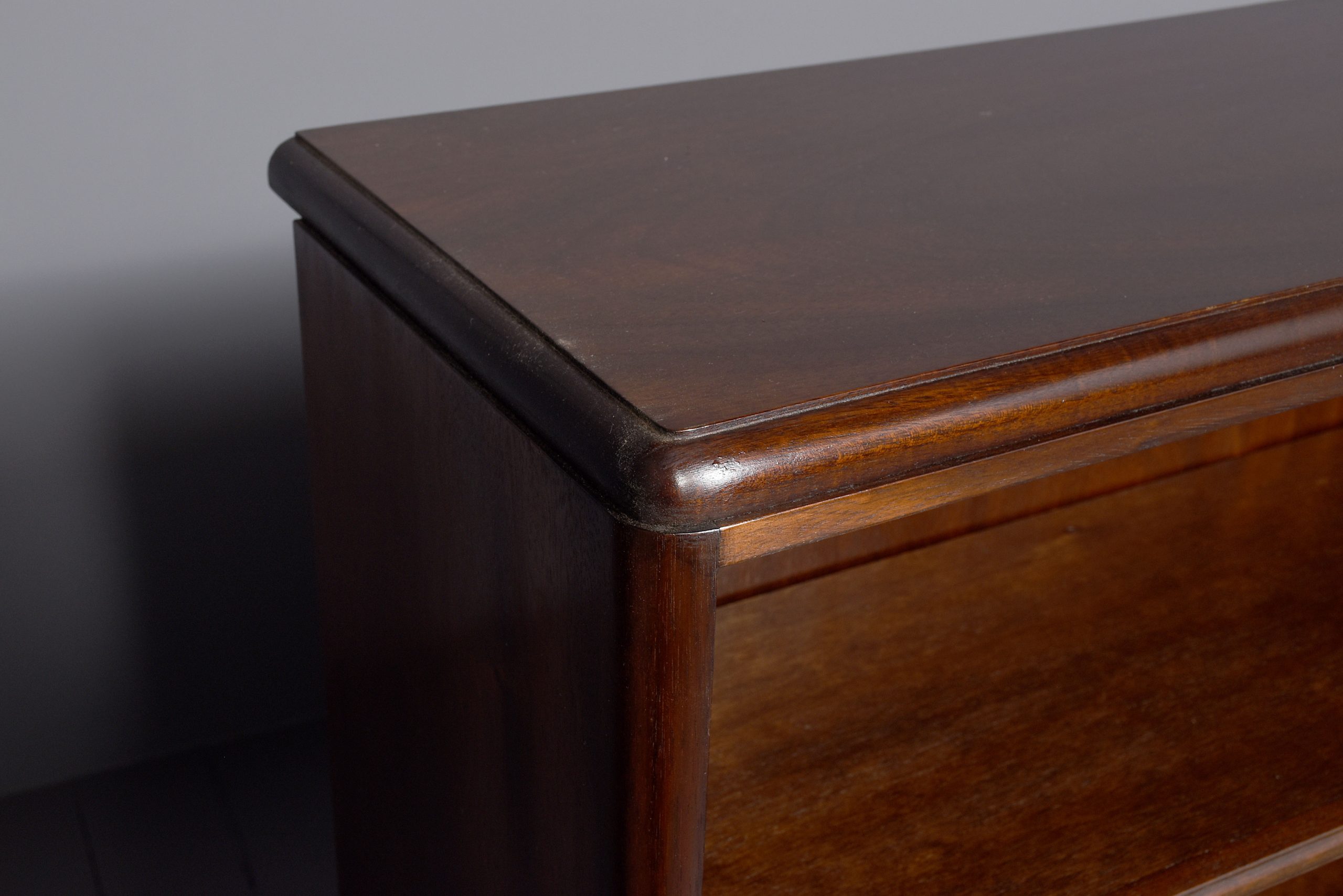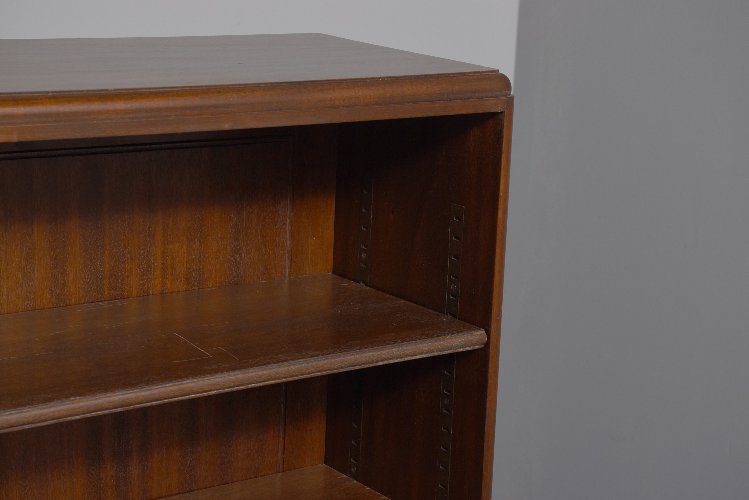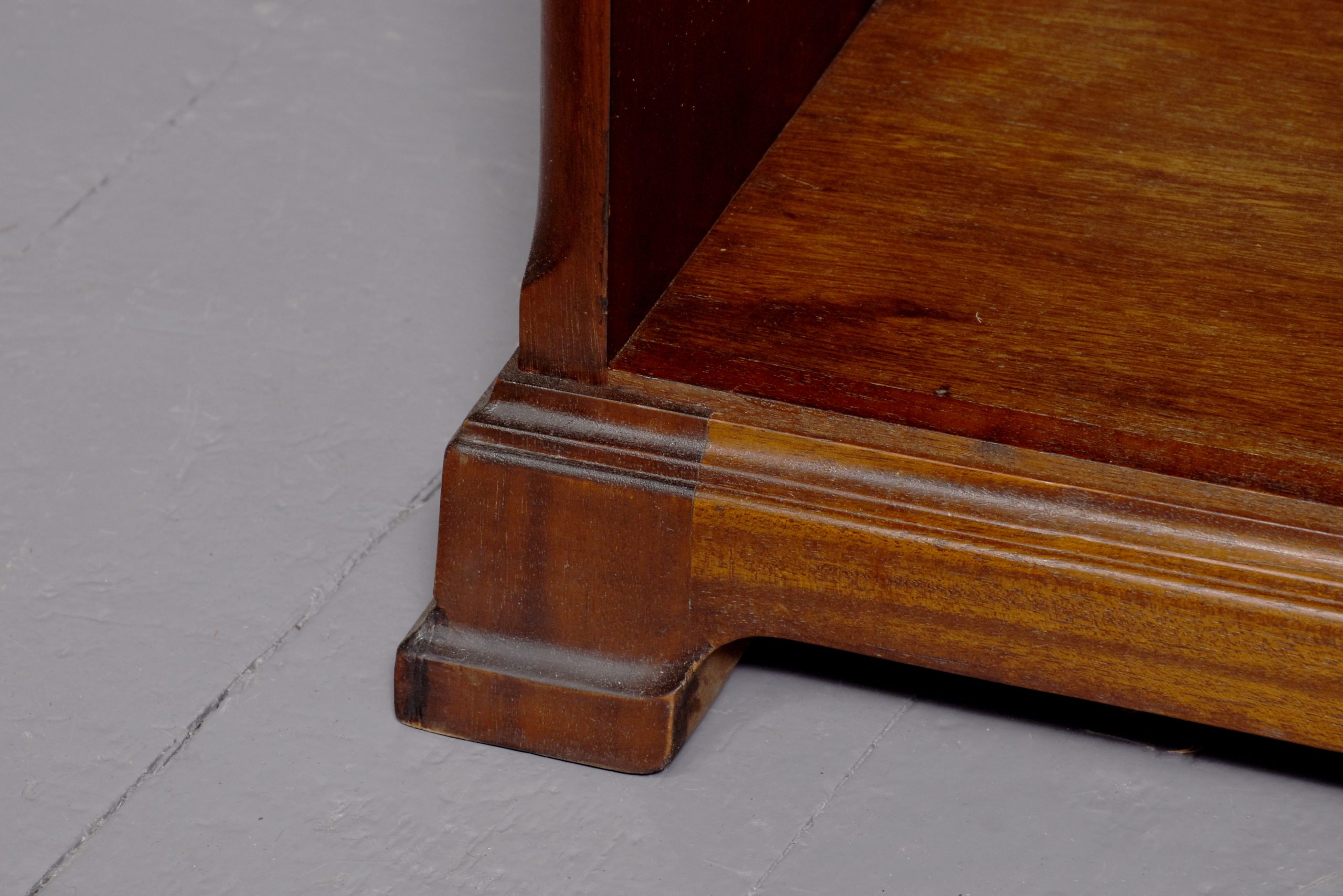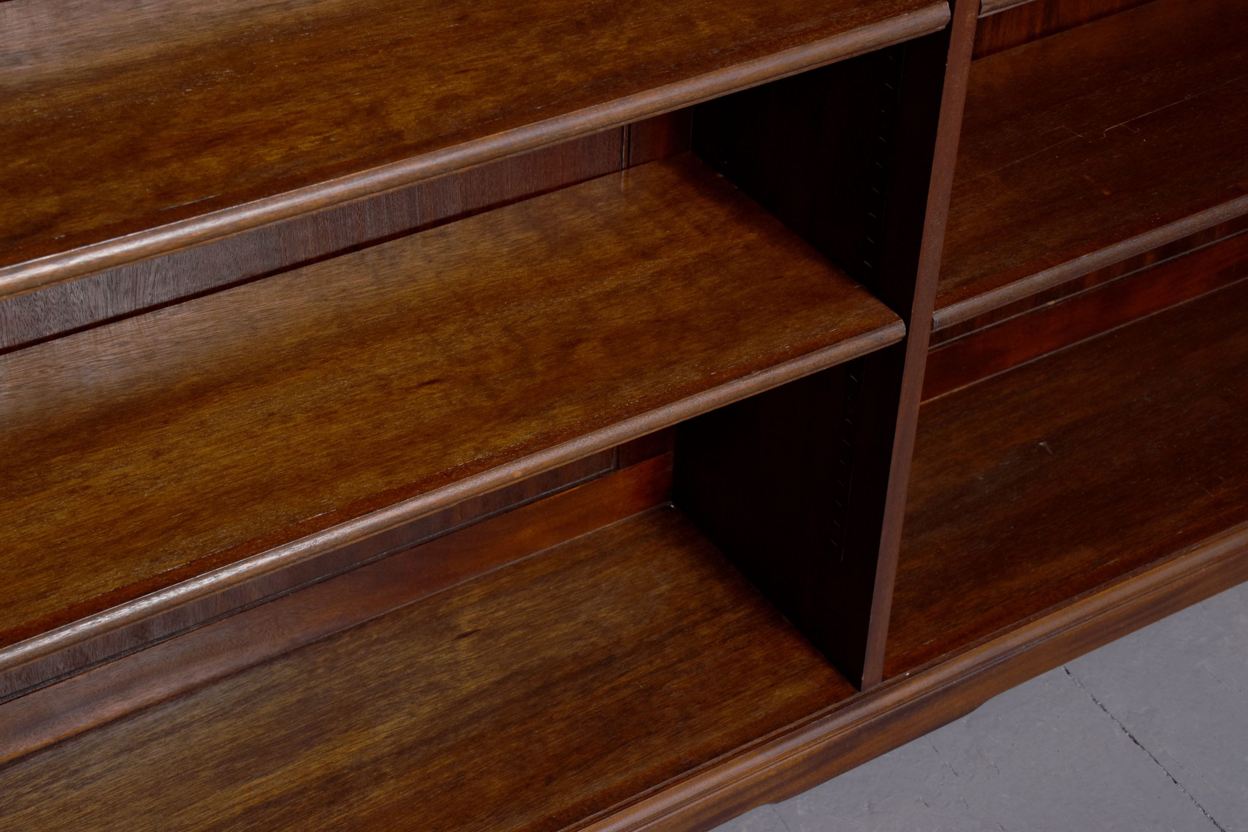 Circa 1930s. A large mahogany double fronted open bookcase by ‘Whytock & Reid of Edinburgh,’ the solid top with rounded corner and simple moulding, the front with two sections, polished on the inside, each with three adjustable shelves, beneath the bottom drawer there is a simple moulding and frieze all resting on four classic ‘Whytock & Reid’ feet.