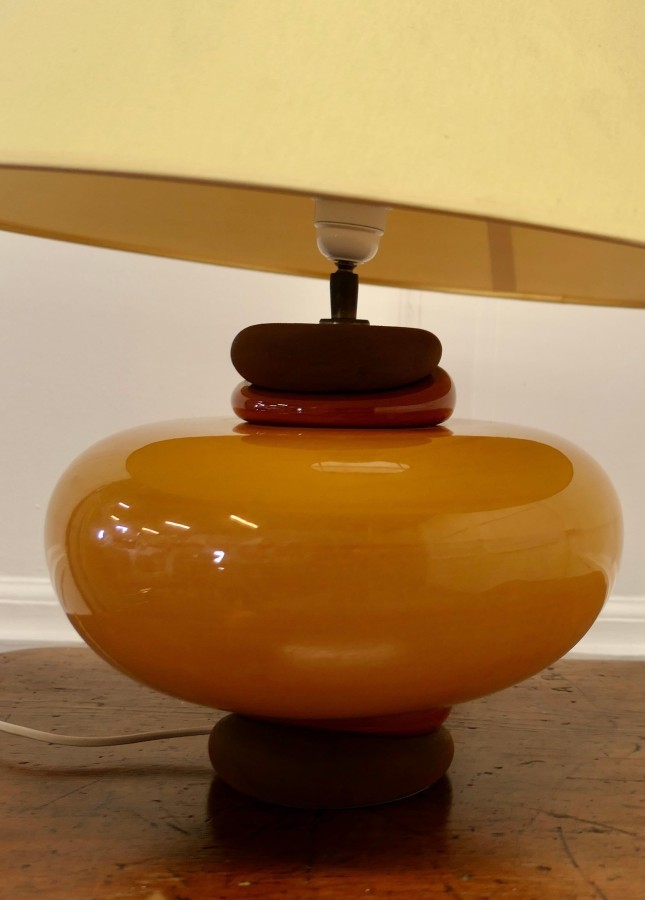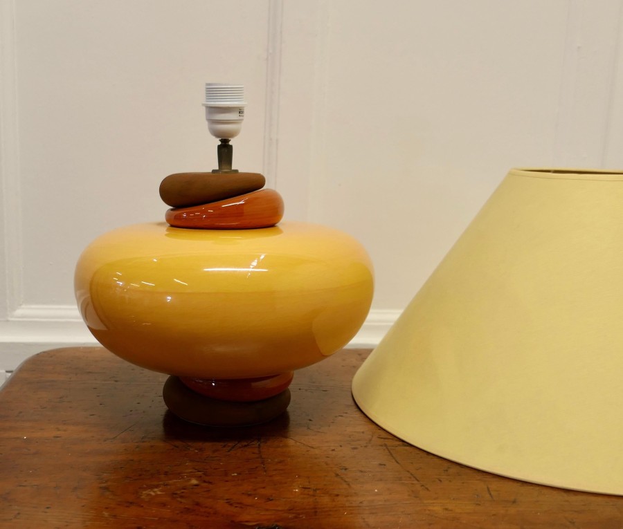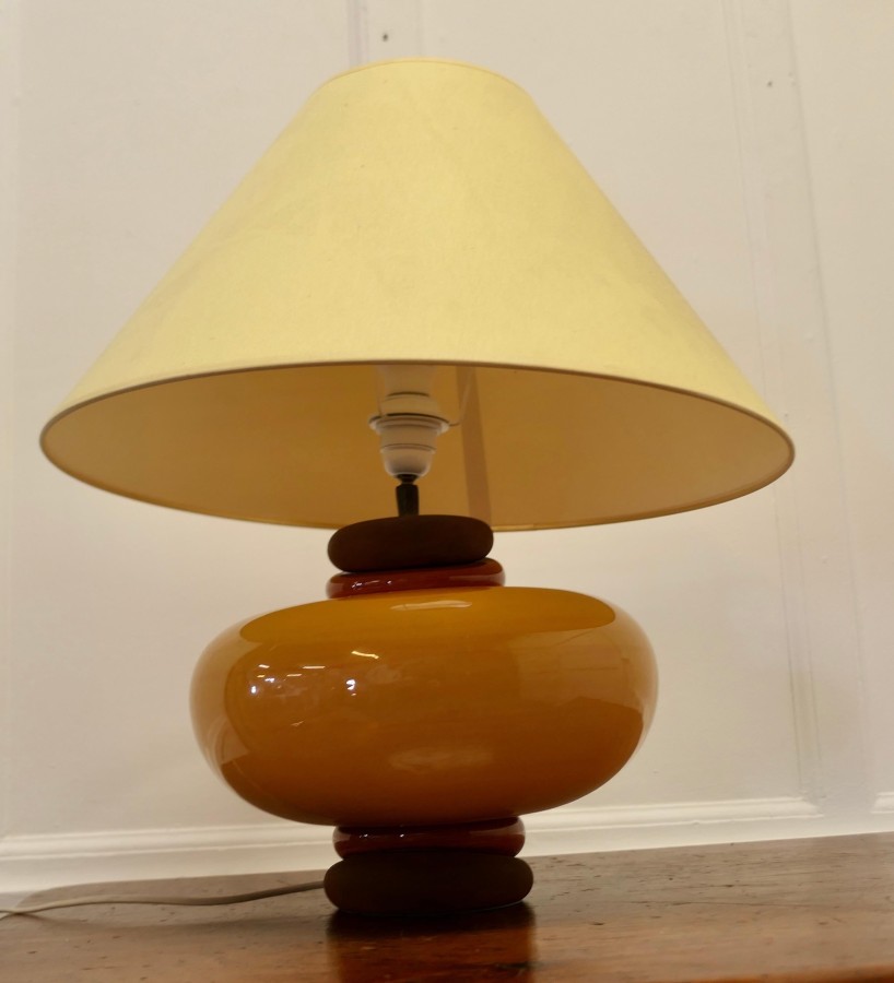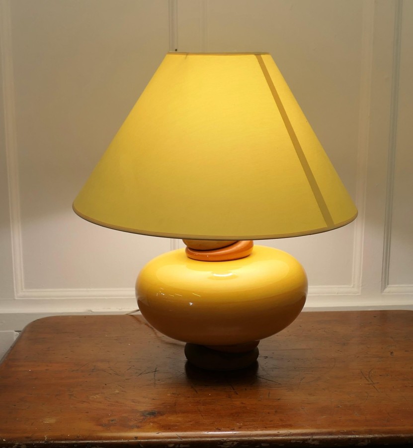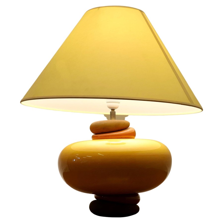 A Large Pebble and Rich Yellow Glass Sideboard Lamp A Large French piece with layers of Glass and Pebble, the lamp is in bright Summer Colours and has a yellow Coolie Lampshade All working and a great looker The lamp is 22” tall, and 13” in diameter, 20” across at the shade MS105. Manufacture Date : 1970s Materials : Ceramic