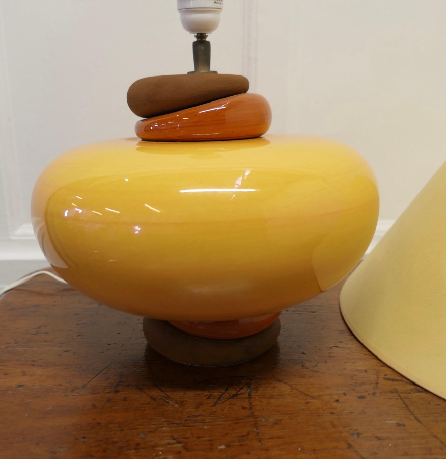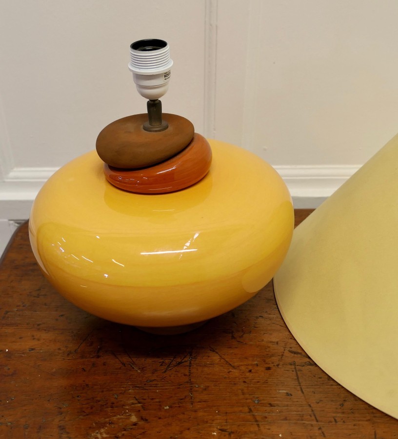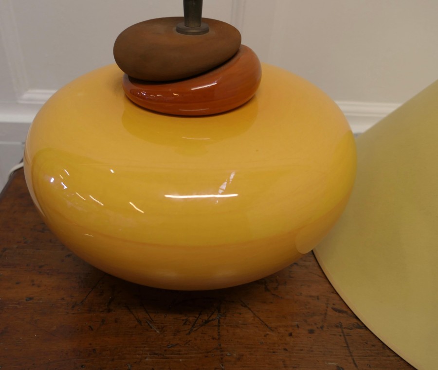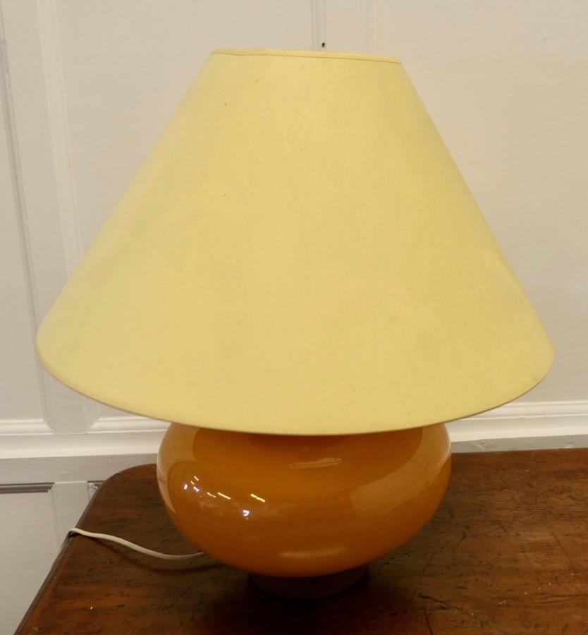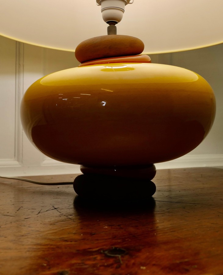 A Large Pebble and Rich Yellow Glass Sideboard Lamp A Large French piece with layers of Glass and Pebble, the lamp is in bright Summer Colours and has a yellow Coolie Lampshade All working and a great looker The lamp is 22” tall, and 13” in diameter, 20” across at the shade MS105. Manufacture Date : 1970s Materials : Ceramic