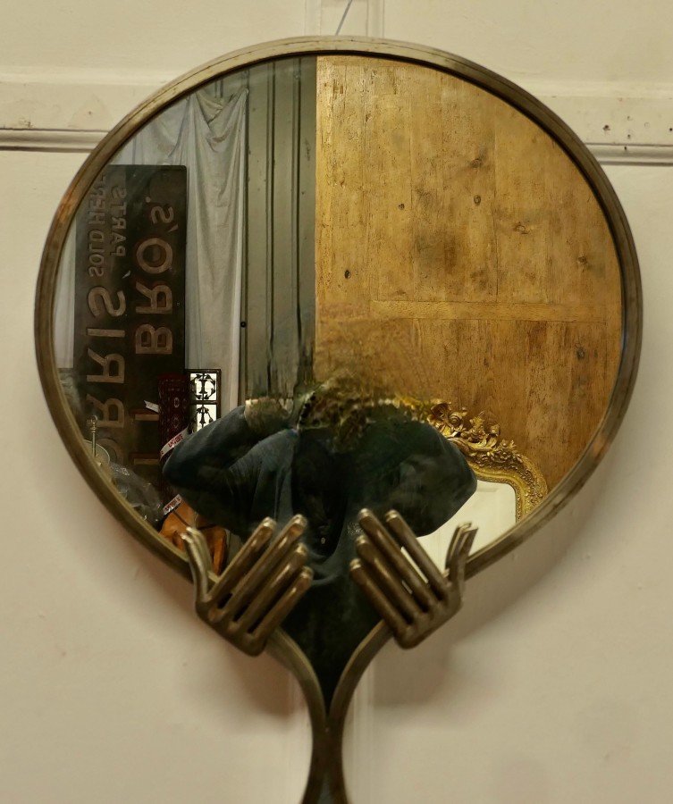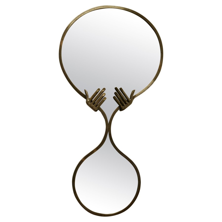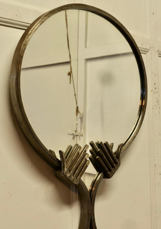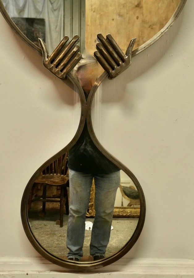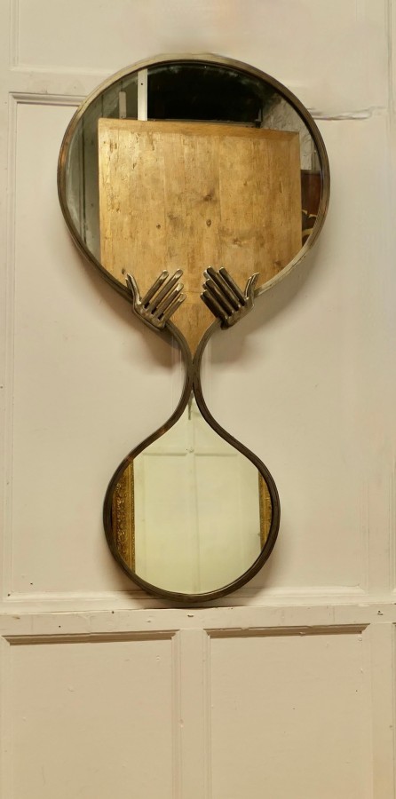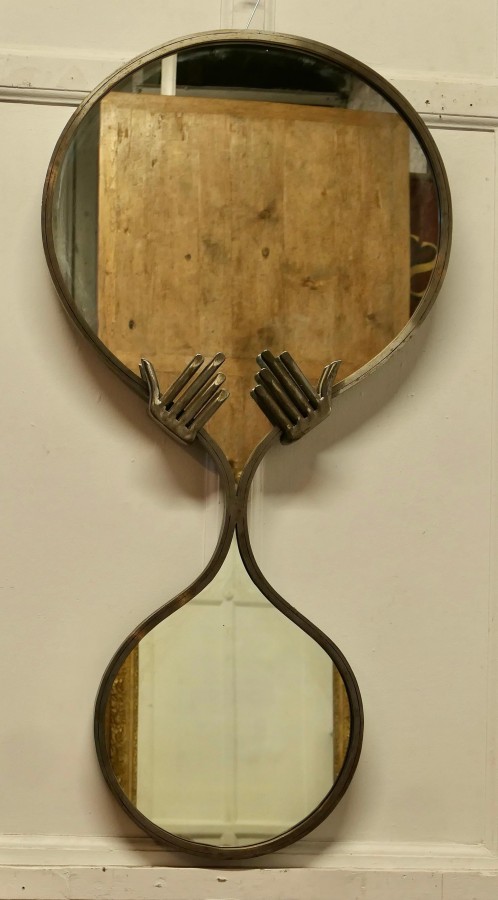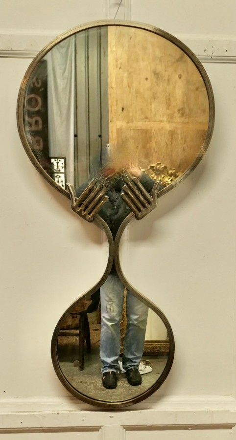 Large Quirky Mid Century One Off Designer Wall Mirror A figure of 8 frame set with hands, the mirror is a one off design, it is made in metal, it is in good used condition The mirror is 48” tall, and 24” wide TCS28 Manufacture Date : 1960 Materials : Steel