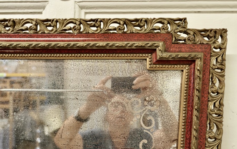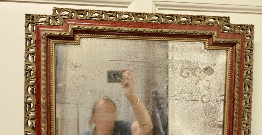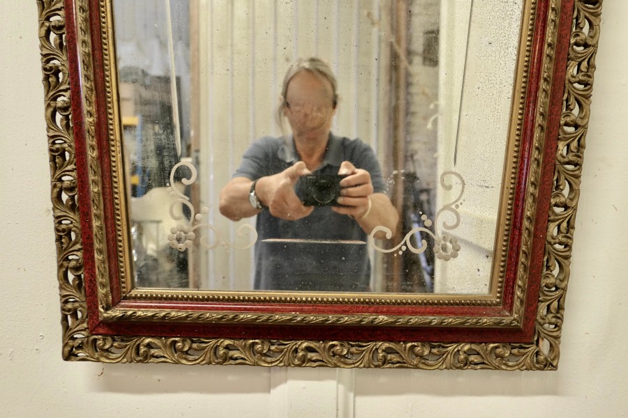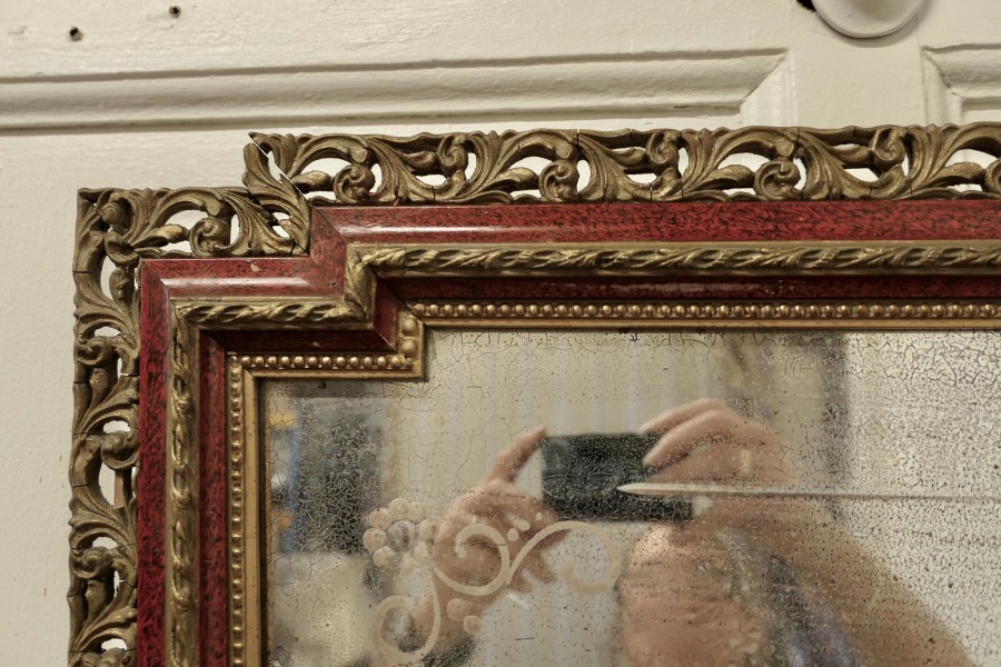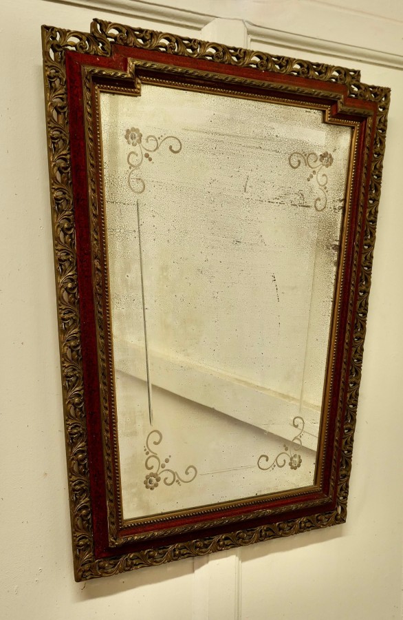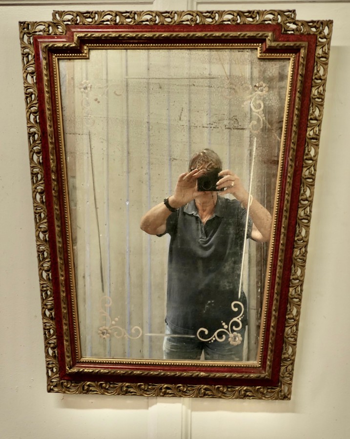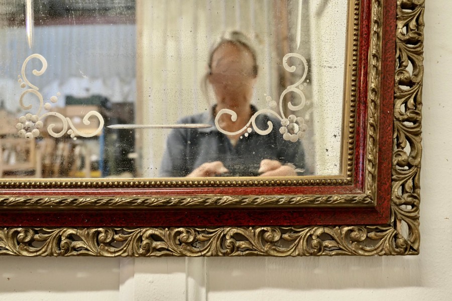 Large V Shaped Venetian wall mirror in the Oriental Art Deco Style This is a very unusual piece, the sides have a V shaped slant, the top is odeon stepped and the 3” frame is in Red Lacquer with elaborate pierced giltwood edging, the mirror itself is etched in the Venetian style The Looking glass has an etched border with enchanting aged appearance to the glass, this has happened slowly over the years The Mirror is in good sound condition it is 29” tall and 23” wide THM143. Manufacture Date : 1910 Materials : Lacquer