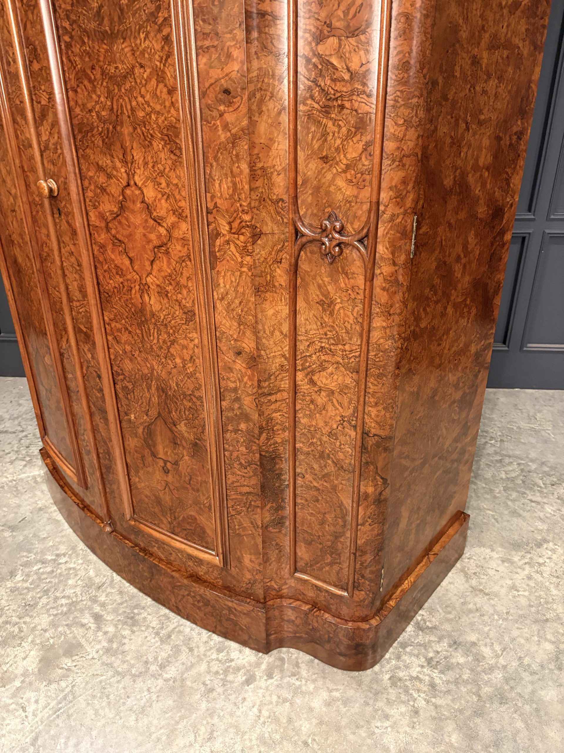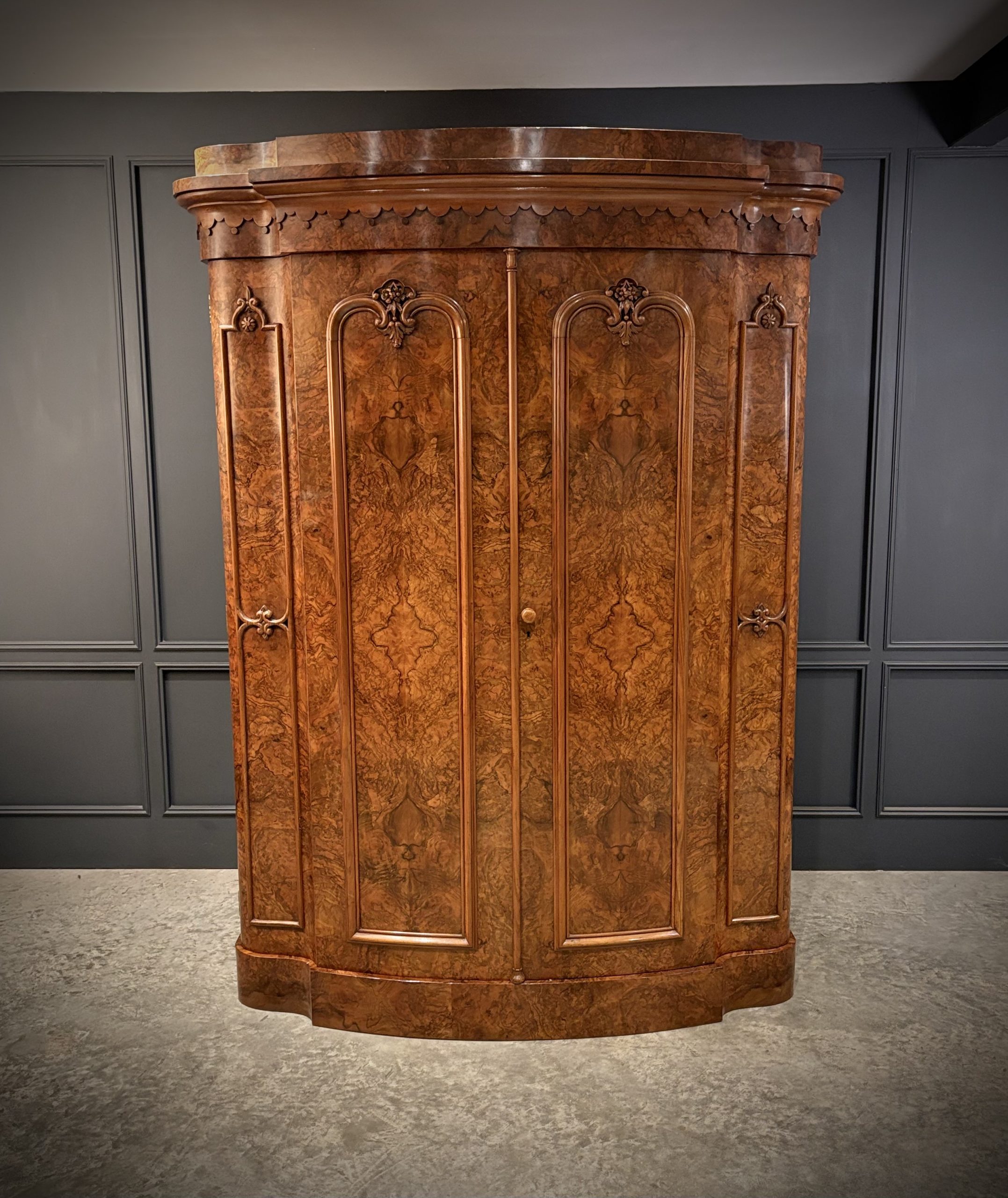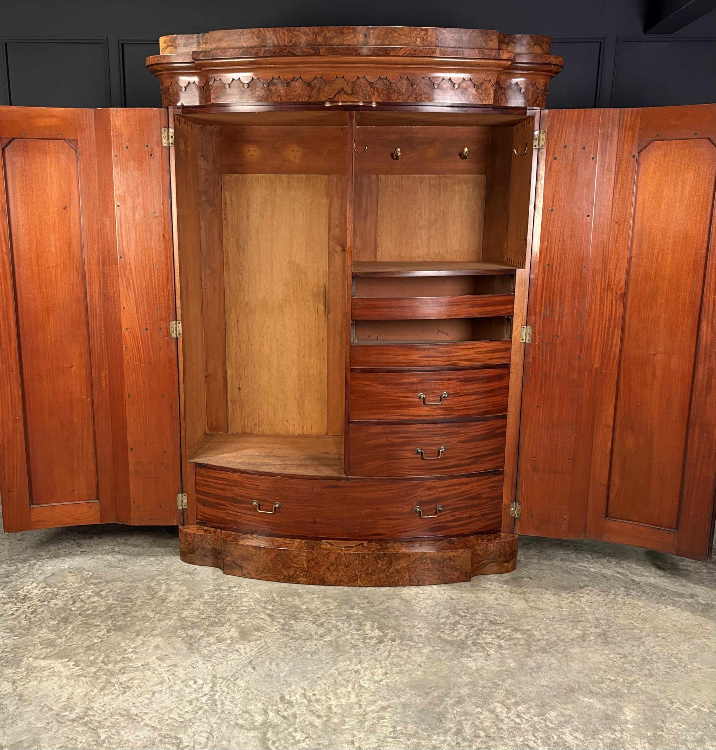 A striking and exceptionally large Victorian bow-front wardrobe, crafted in beautifully figured burr walnut with a rich, warm tone and elegant polished finish.