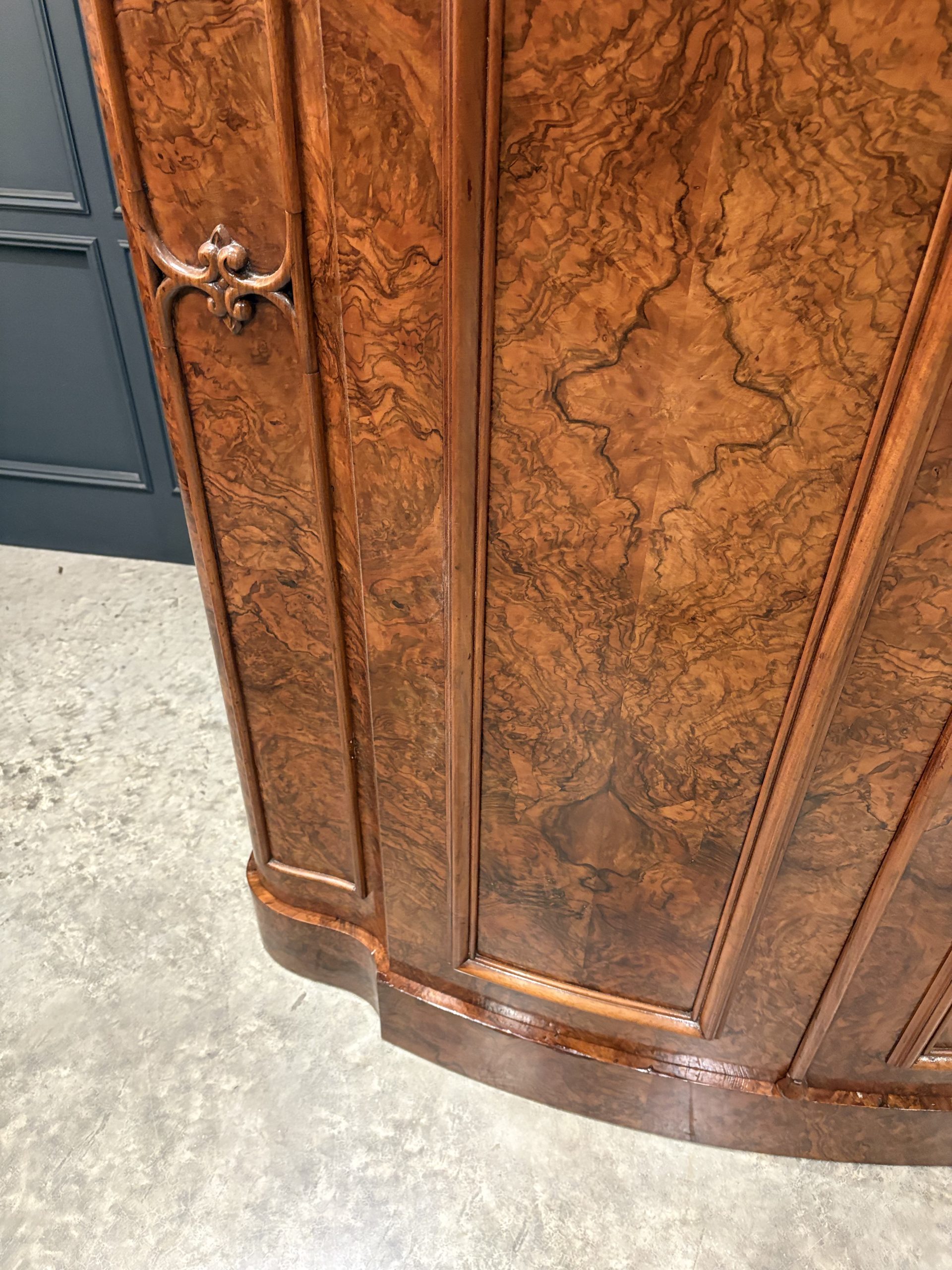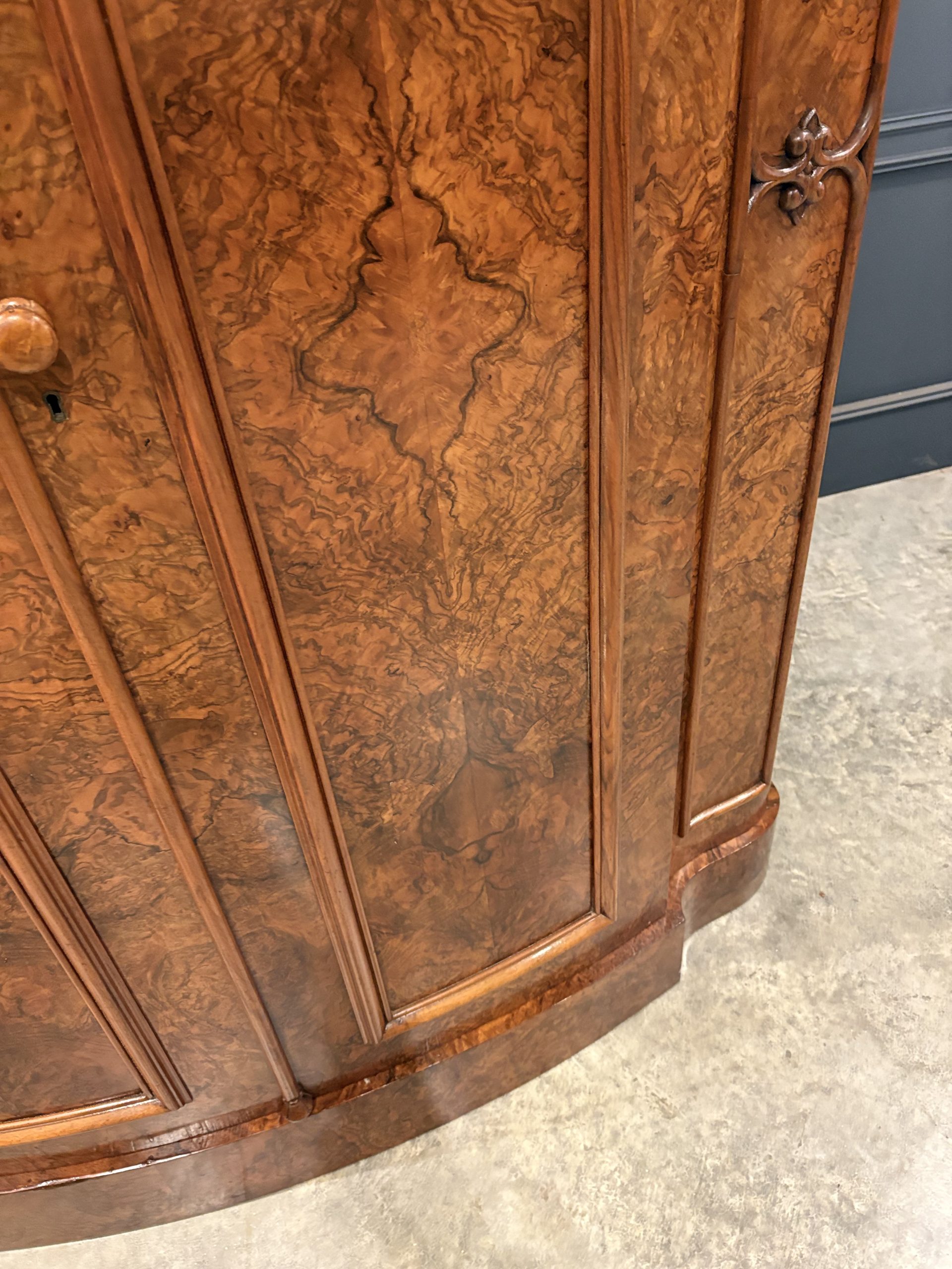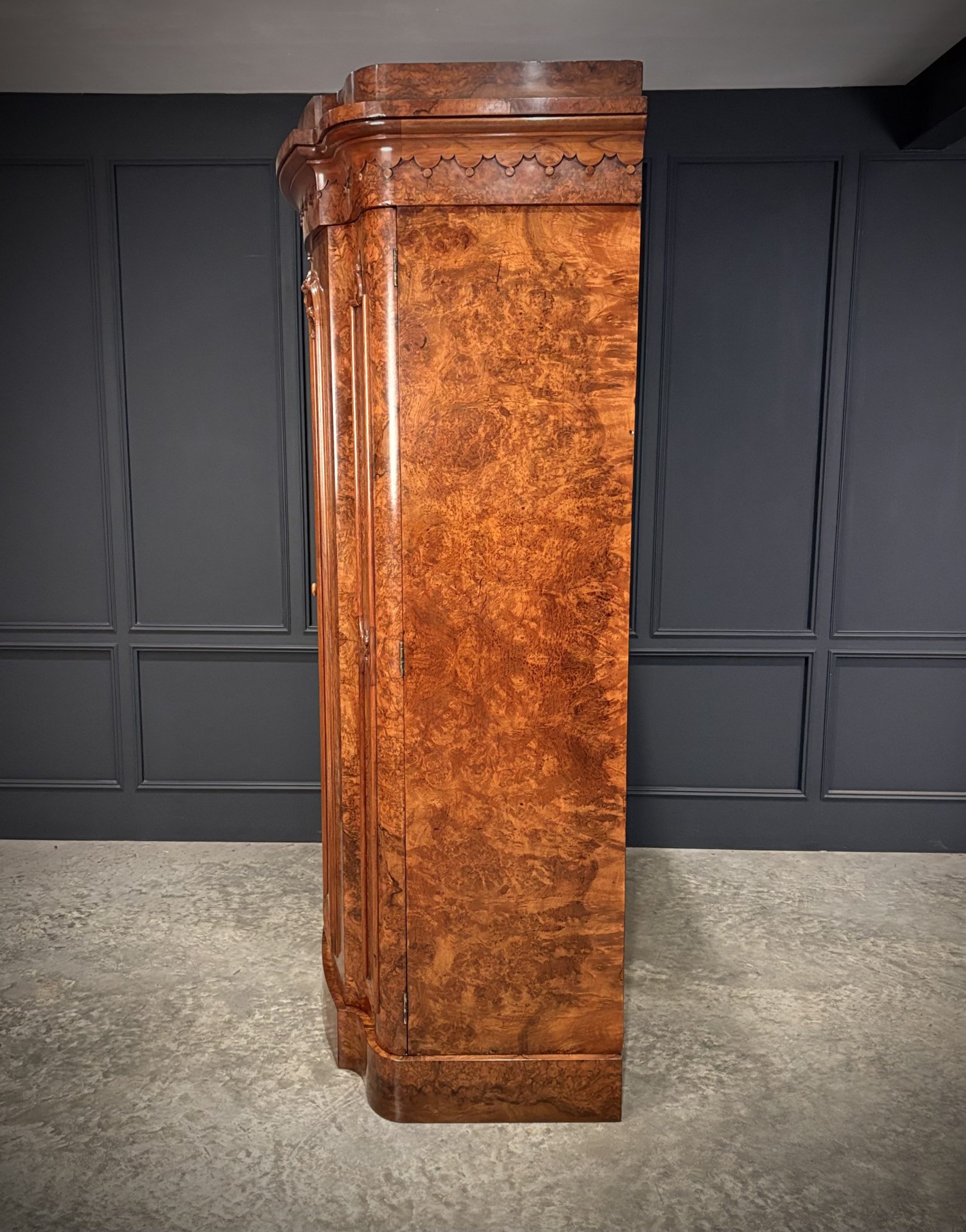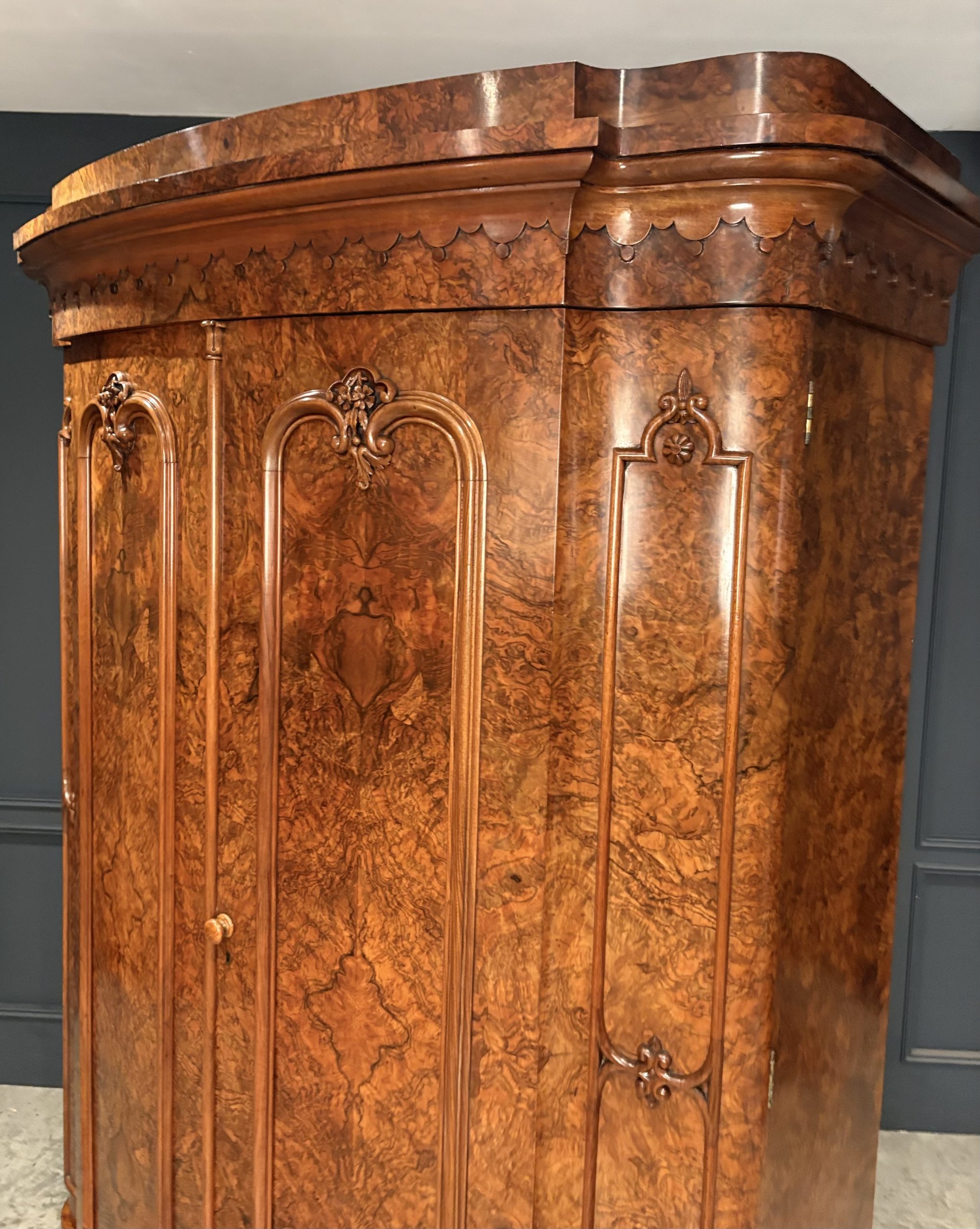 A striking and exceptionally large Victorian bow-front wardrobe, crafted in beautifully figured burr walnut with a rich, warm tone and elegant polished finish.