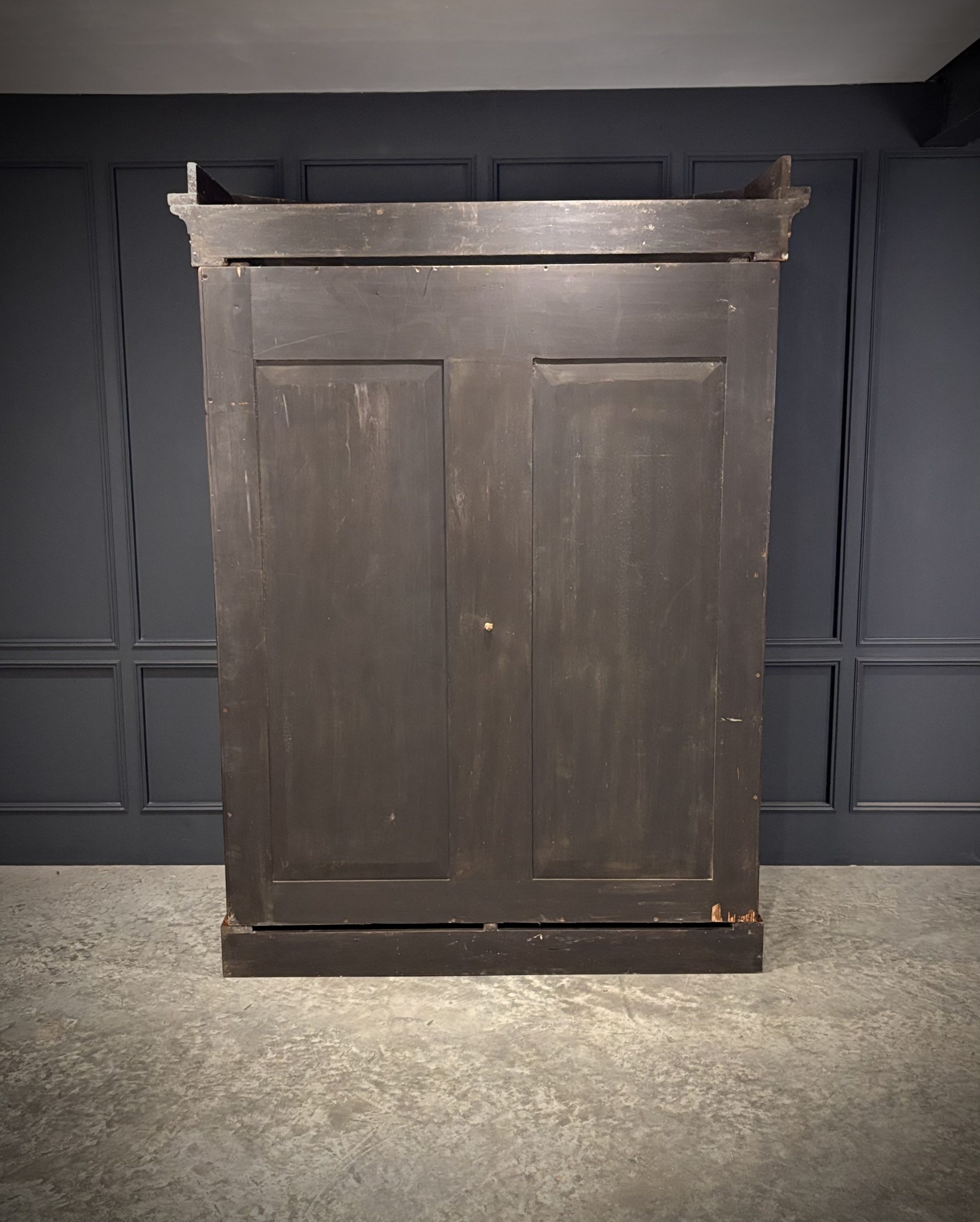 The wardrobe breaks down into three sections for ease of transport: a removable top cornice, the main body, and a plinth base. Inside, it offers excellent storage with two sliding trays and three drawers, ideal for organising clothing and accessories.