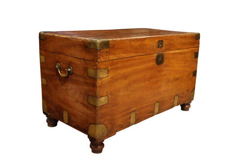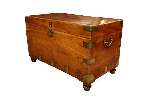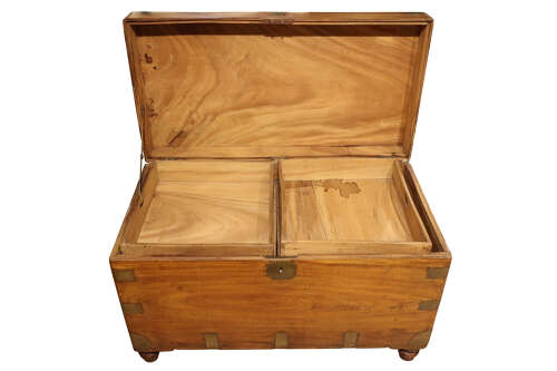 A substantial Victorian campaign trunk constructed in solid camphor wood and reinforced throughout with brass mounts, including robust corner plates and brass strapping. The hinged lid opens to a generously proportioned interior, fitted with two removable lift-out trays over a deep storage compartment, retaining its characteristic camphor aroma and providing excellent storage. Fitted with recessed brass side handles for ease of movement and raised on later turned feet, allowing it to be used comfortably in a domestic interior.