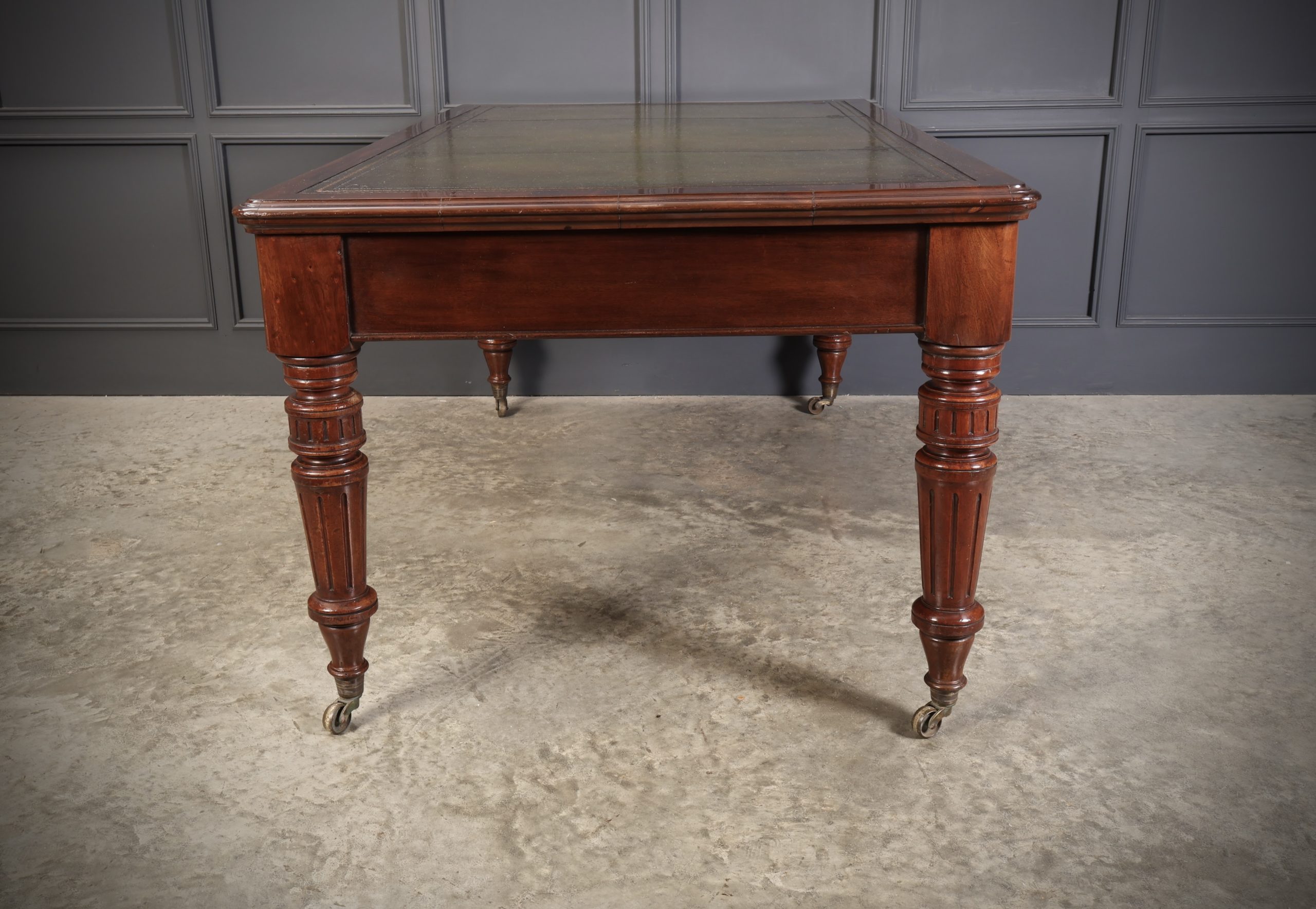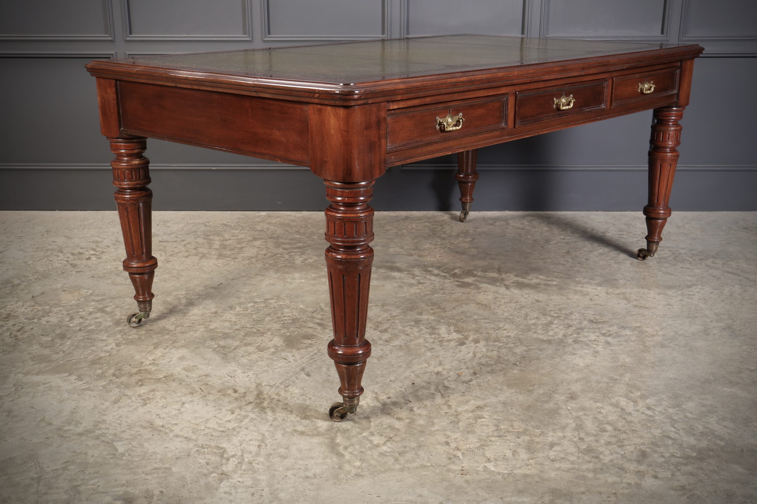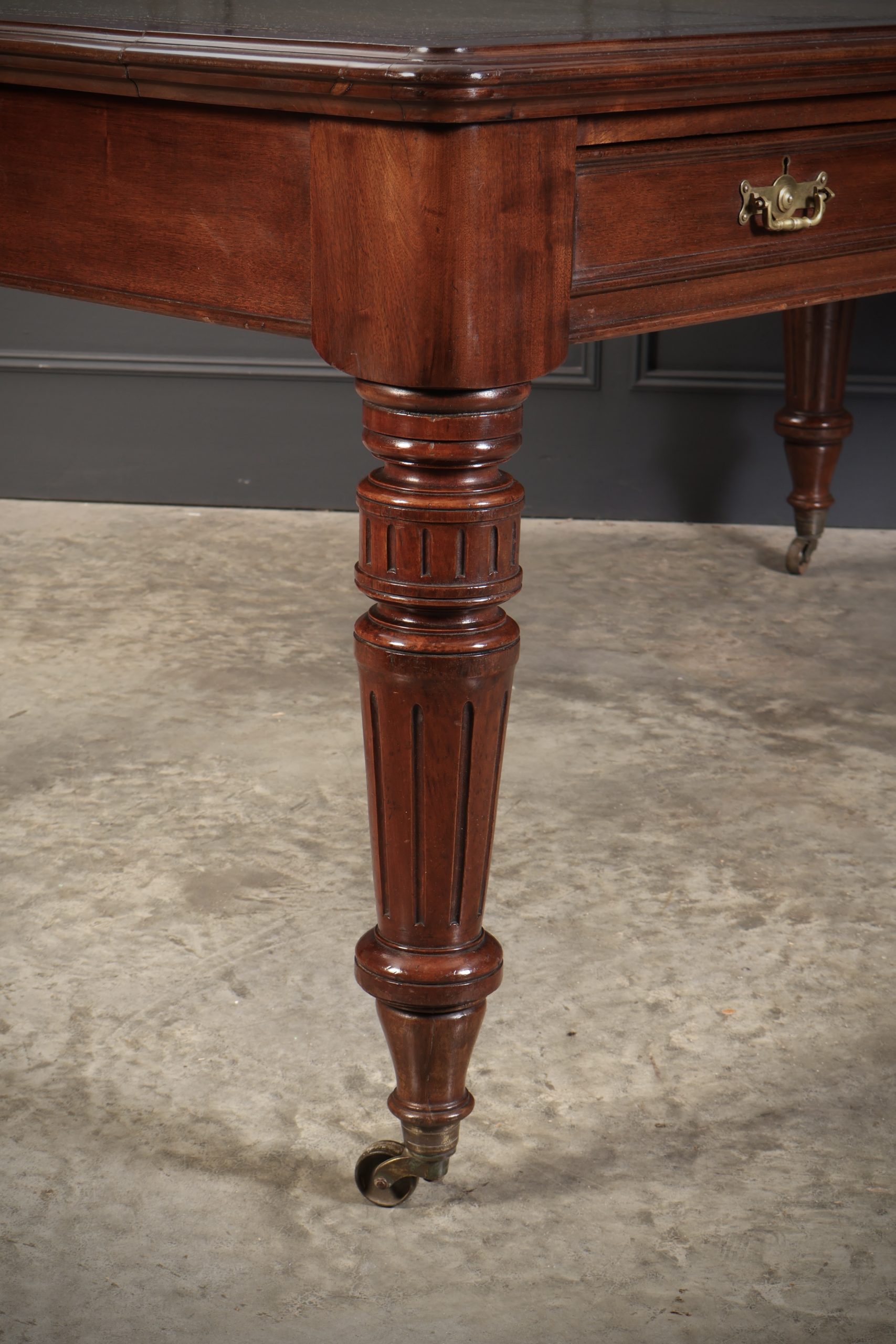 On large turned fluted legs with brass casters.