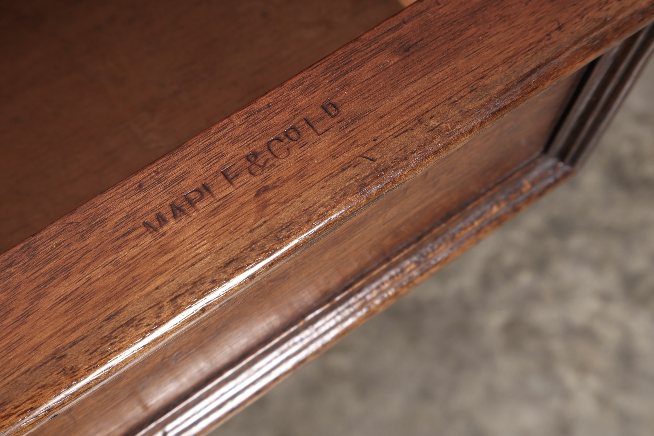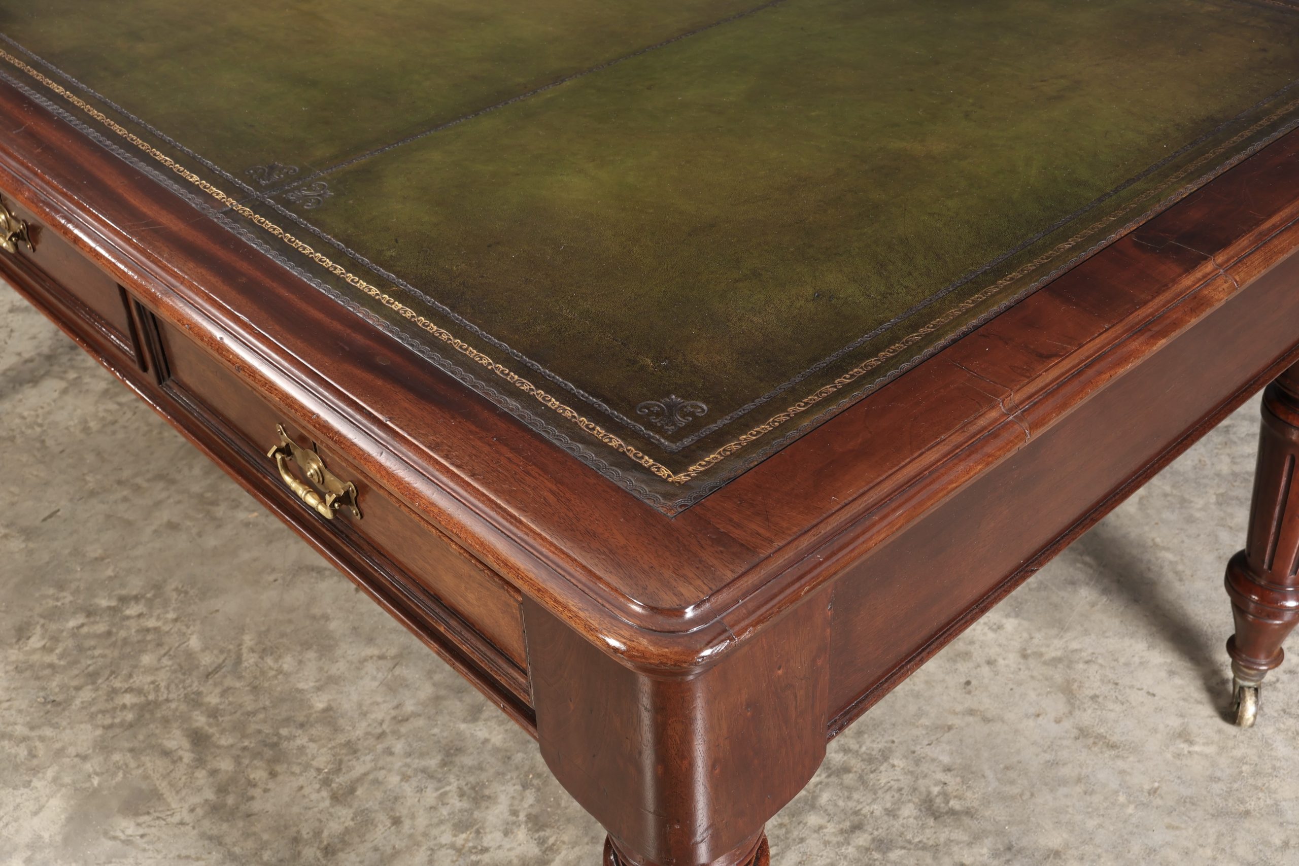 A good size table, with 3 drawers on each side, having moulded fronts and good quality solid mahogany construction. With original brass handles and locks, bearing the makers stamp “Maple & Co.” on the inside edge.