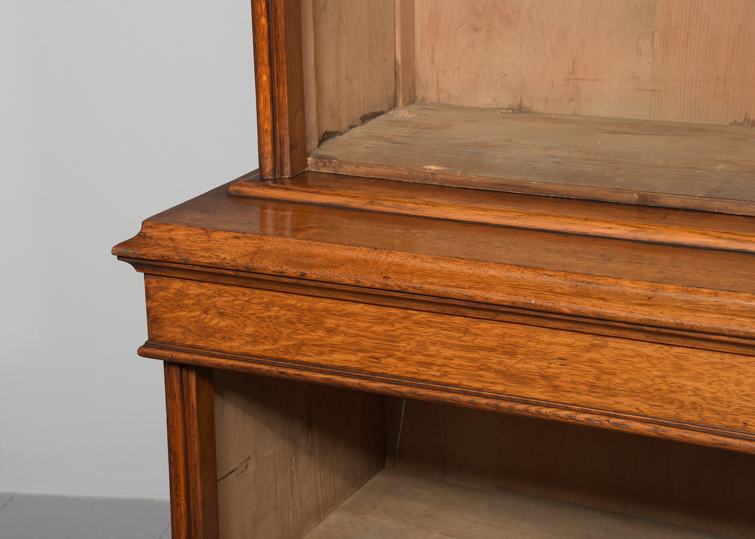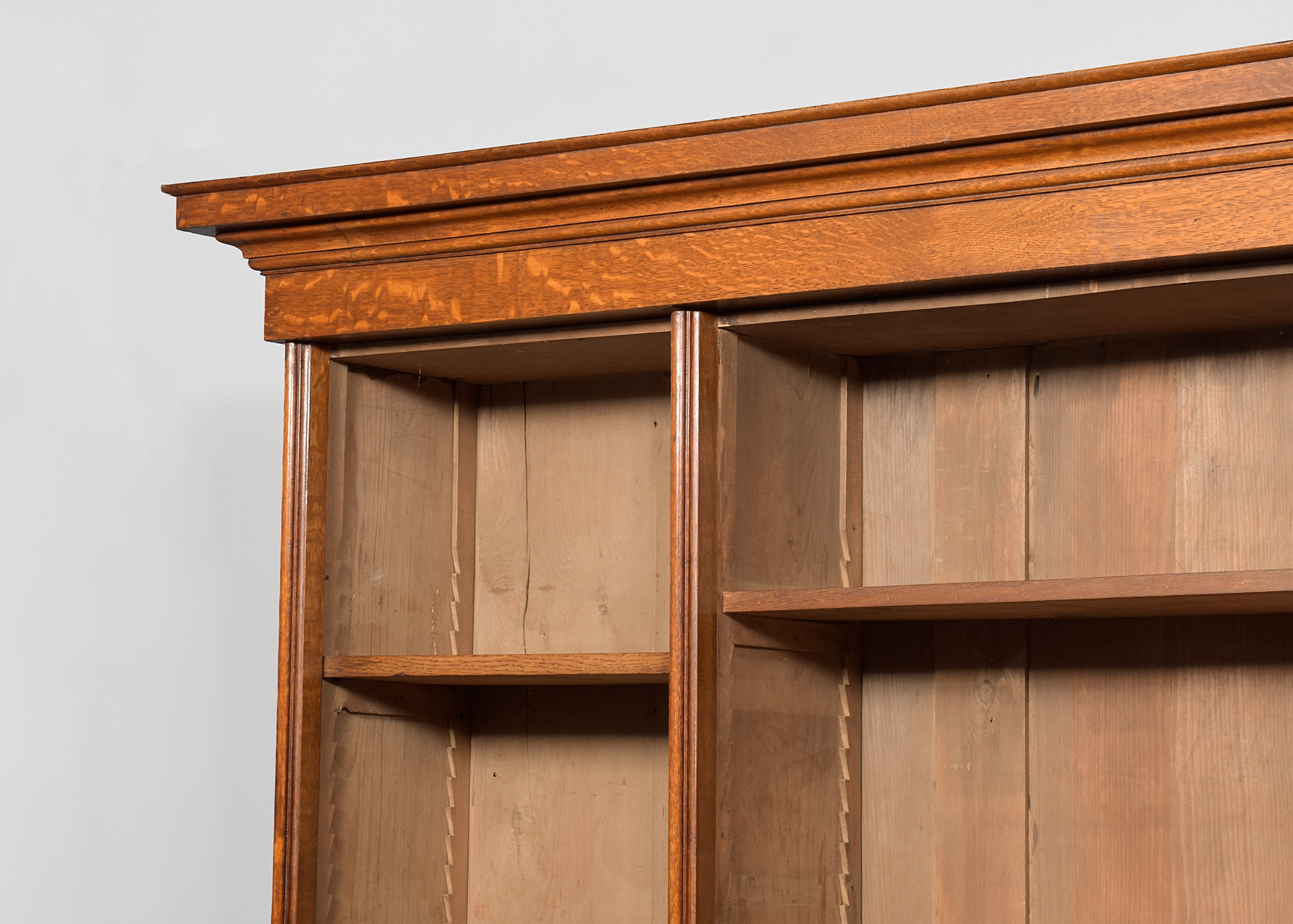 Circa 1870. A mid-Victorian oak open bookcase, the deep moulded cornice in