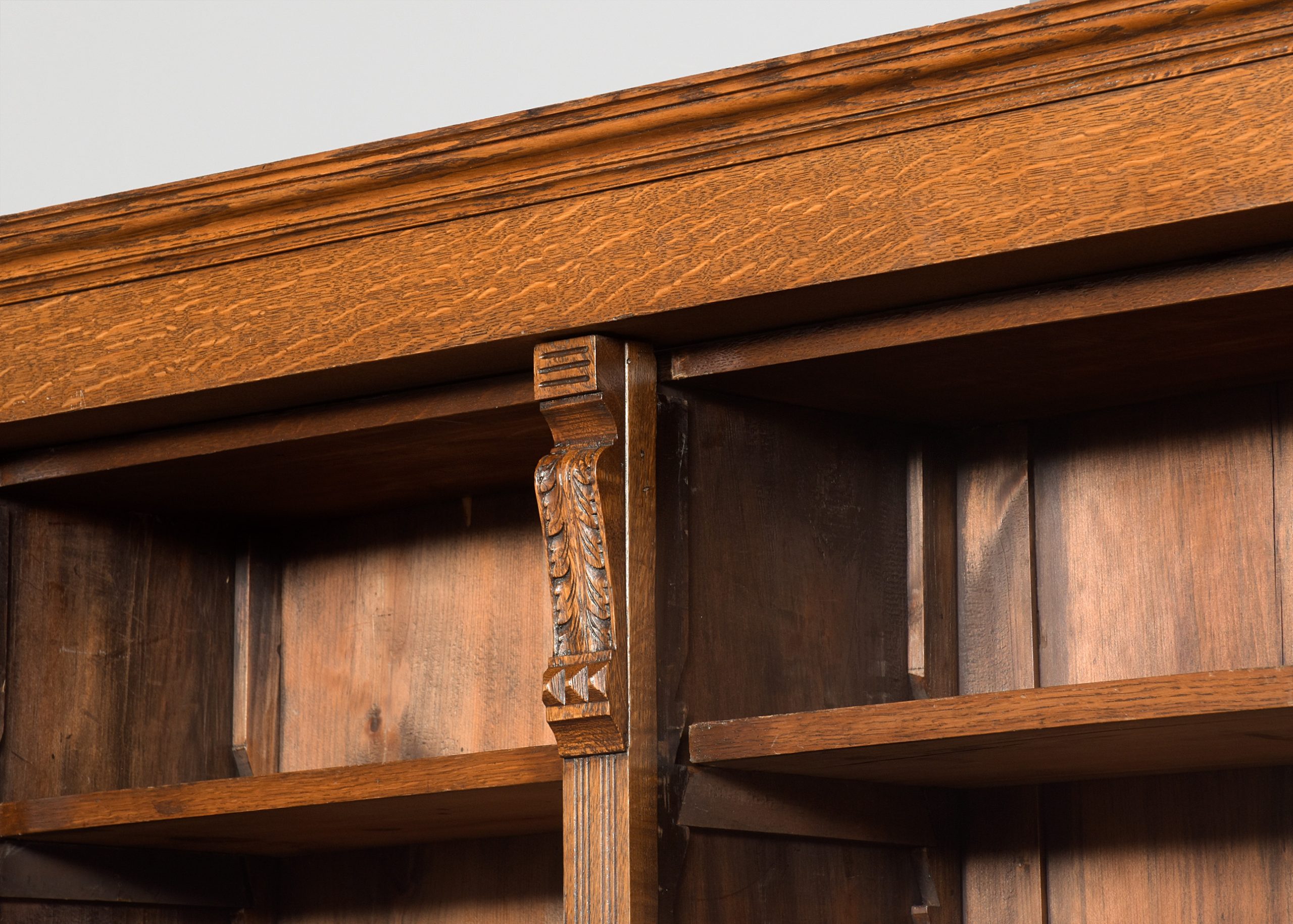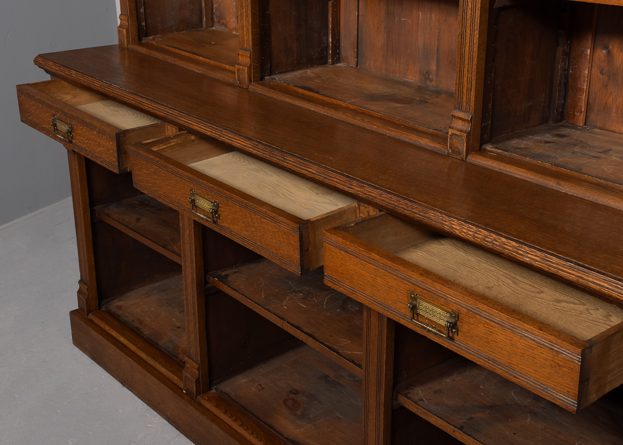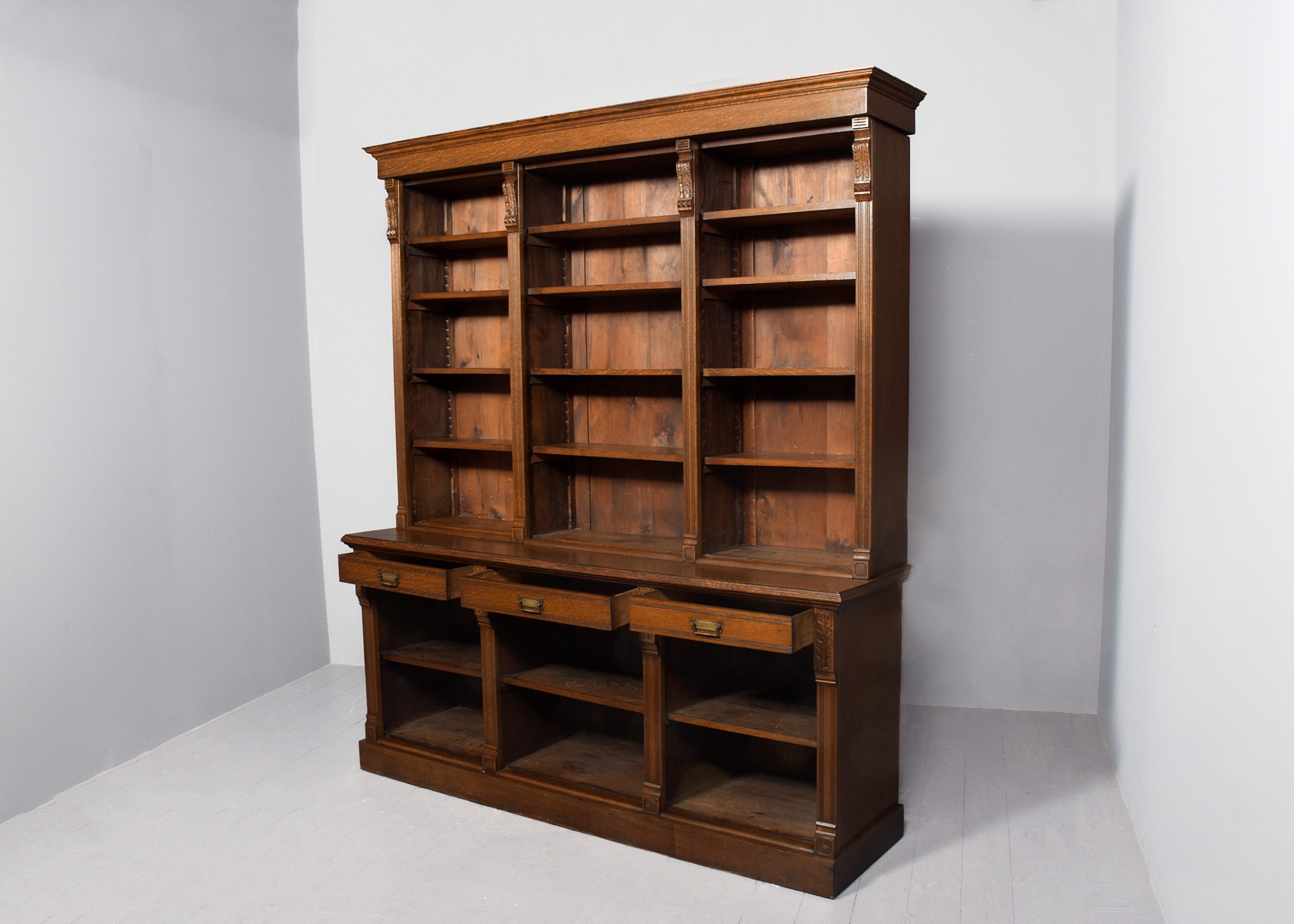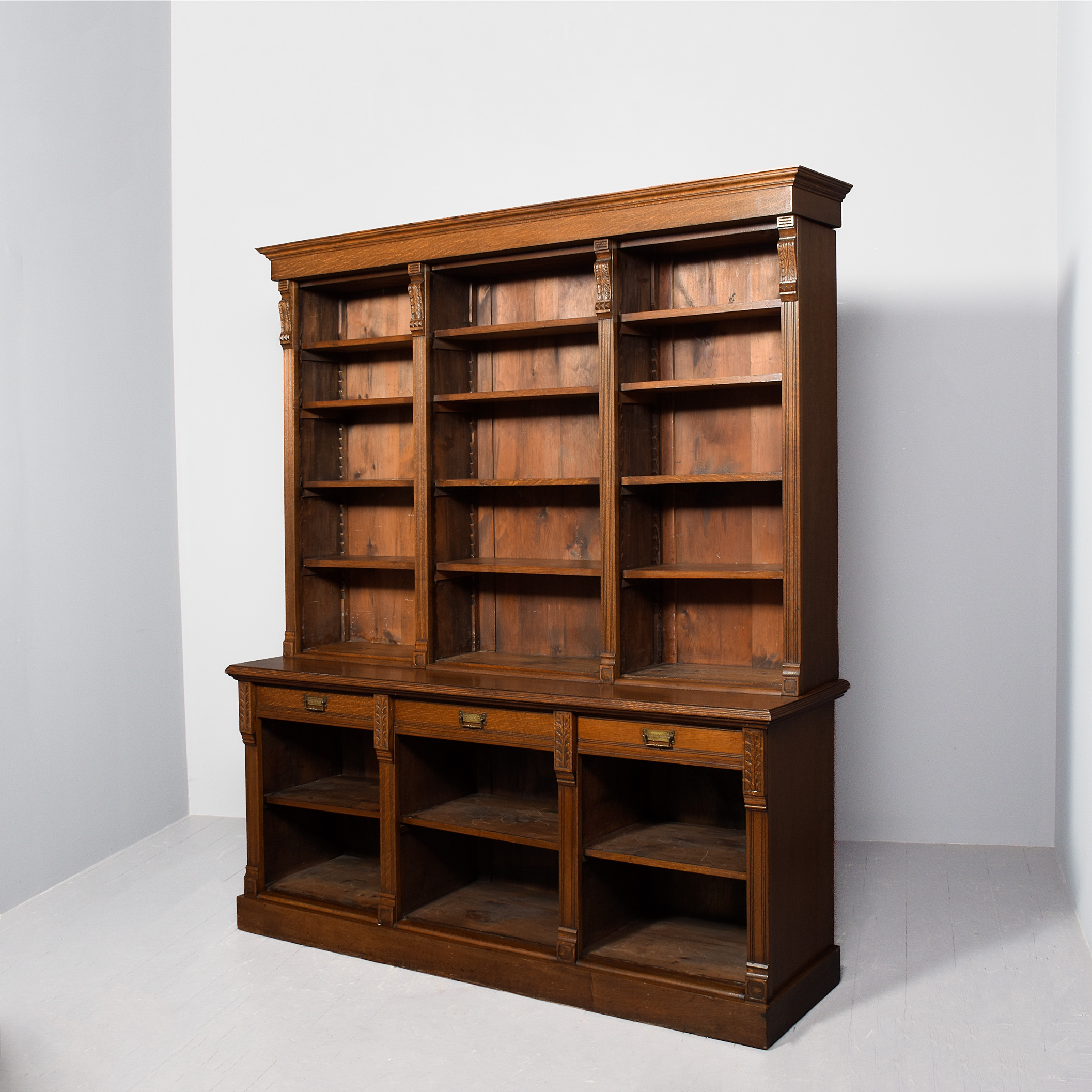 Circa 1880. A late Victorian oak open bookcase, surmounted by a simple classical cornice and simple frieze, the upper bookcase has three sections, each with four adjustable shelves flanked by fluted pilasters capped by foliate carved corbels, the deeper base with a moulded edge to the top, has three frieze drawers with cast brass handles, above open sections each with