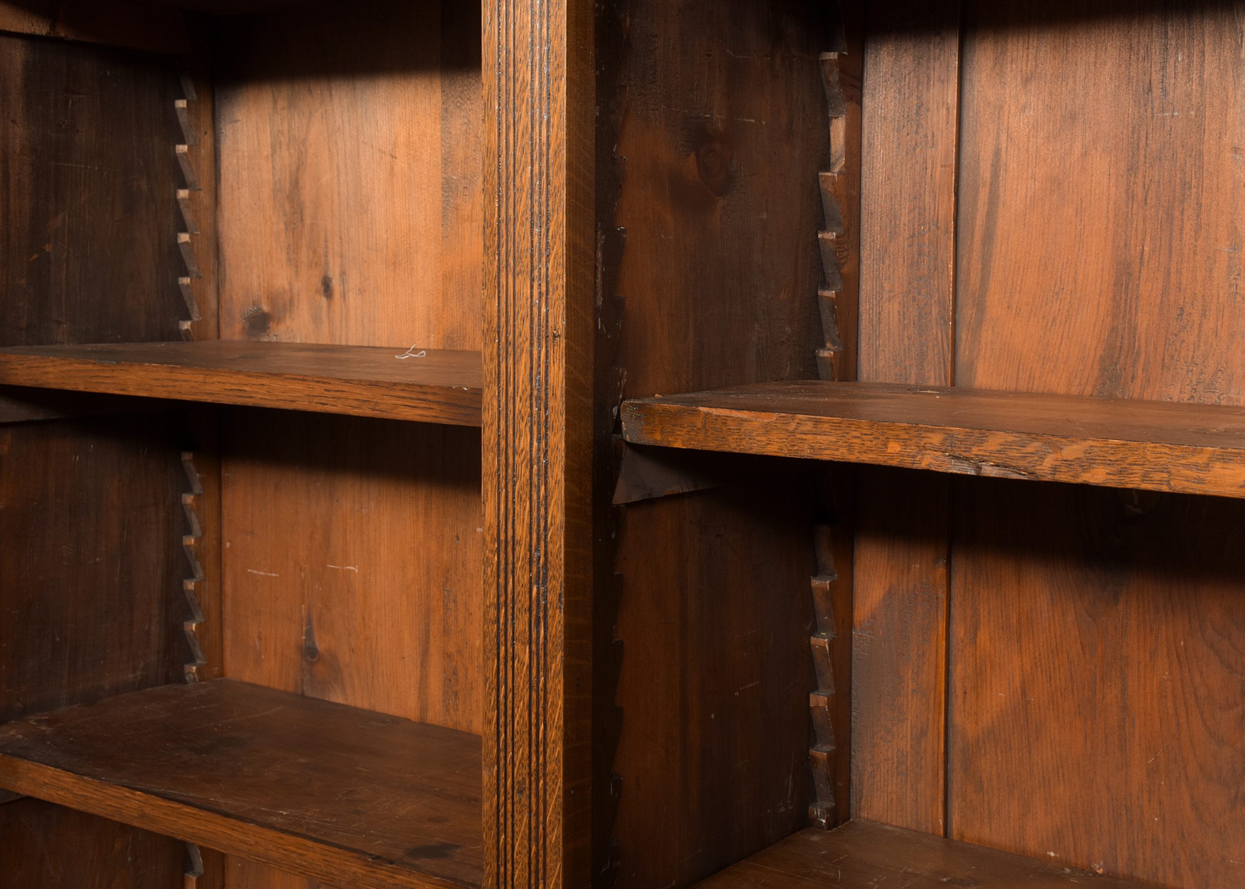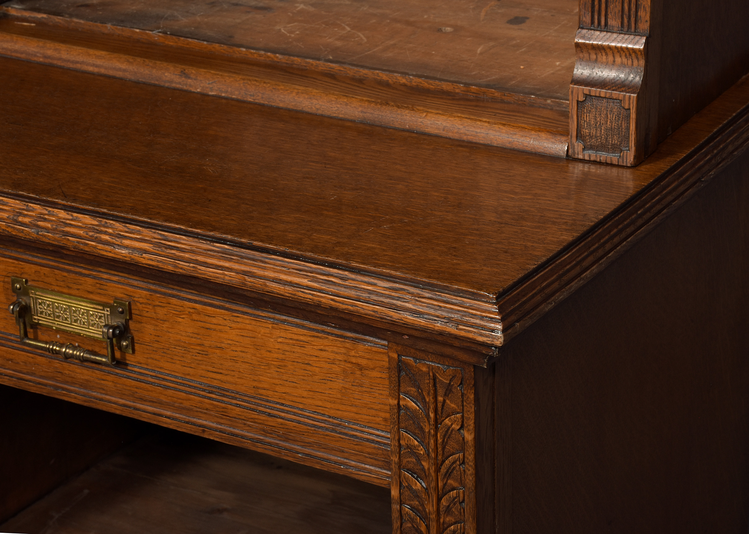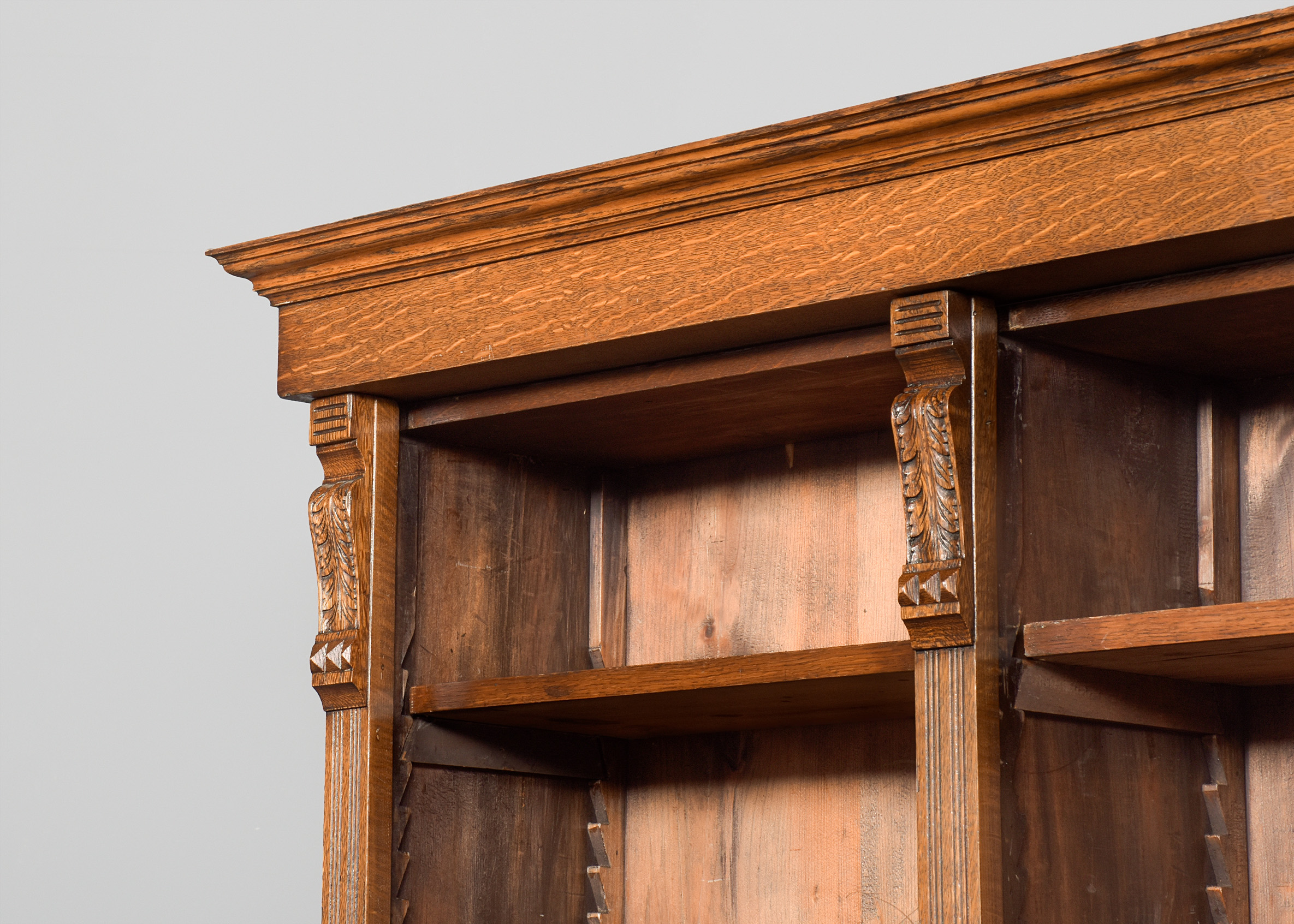 Circa 1880. A late Victorian oak open bookcase, surmounted by a simple classical cornice and simple frieze, the upper bookcase has three sections, each with four adjustable shelves flanked by fluted pilasters capped by foliate carved corbels, the deeper base with a moulded edge to the top, has three frieze drawers with cast brass handles, above open sections each with