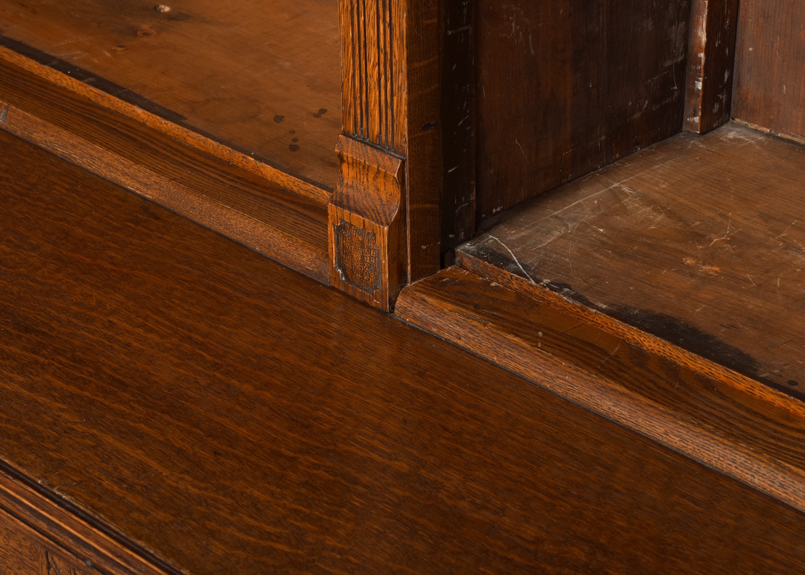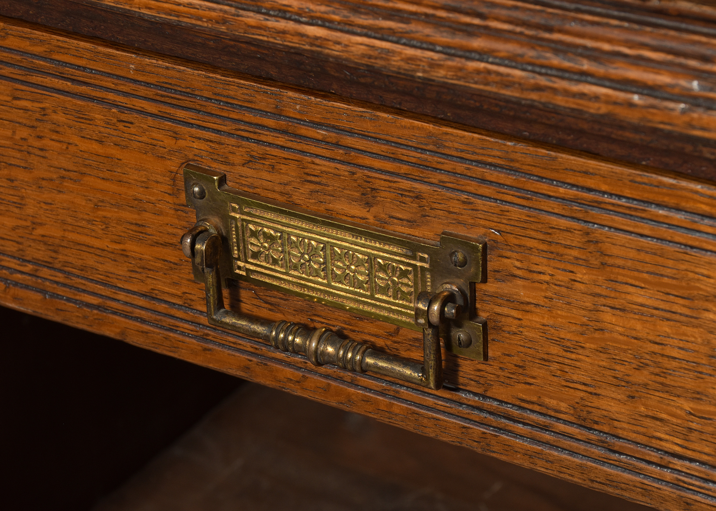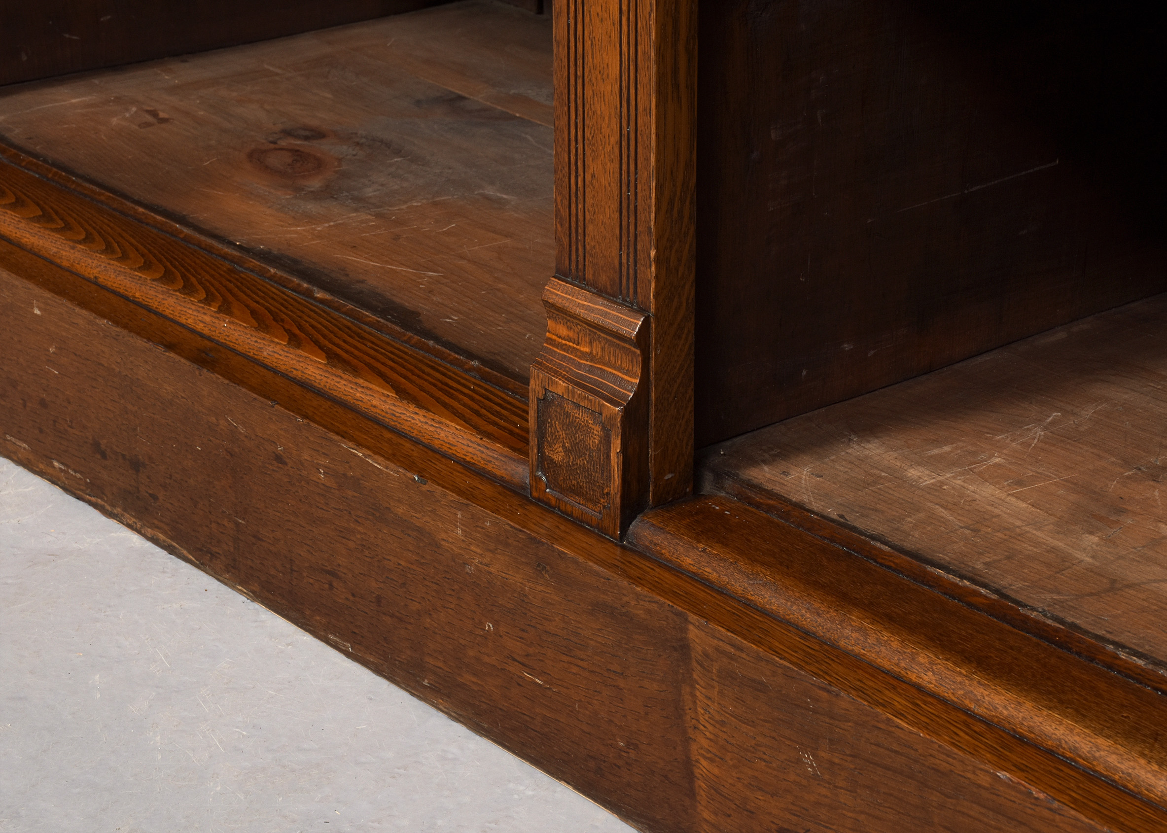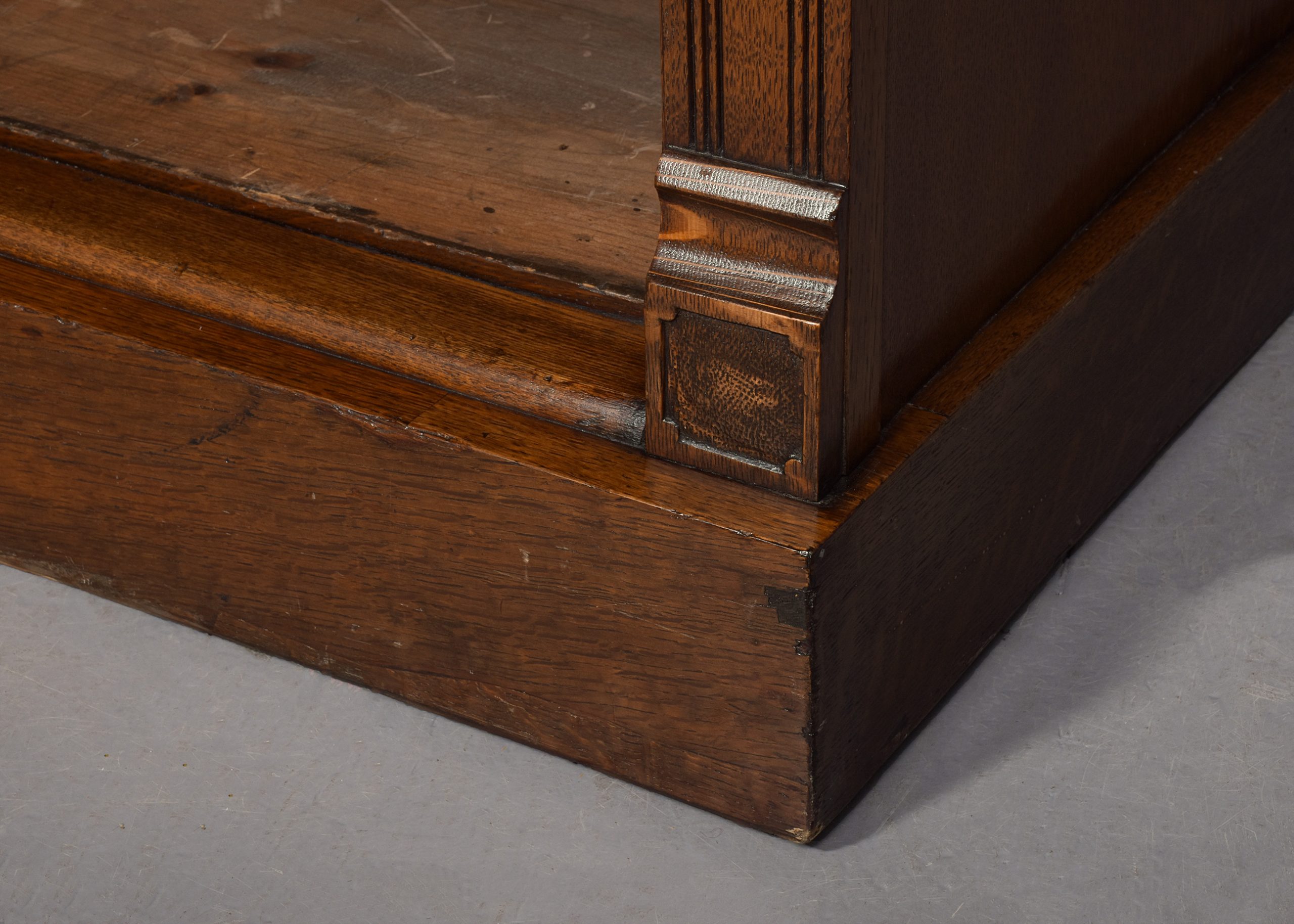 Circa 1880. A late Victorian oak open bookcase, surmounted by a simple classical cornice and simple frieze, the upper bookcase has three sections, each with four adjustable shelves flanked by fluted pilasters capped by foliate carved corbels, the deeper base with a moulded edge to the top, has three frieze drawers with cast brass handles, above open sections each with