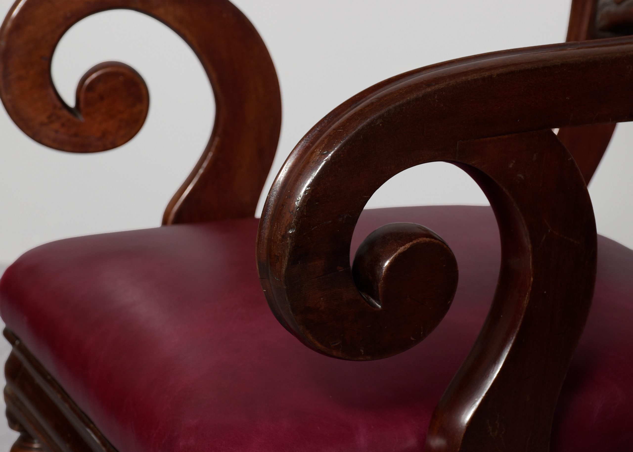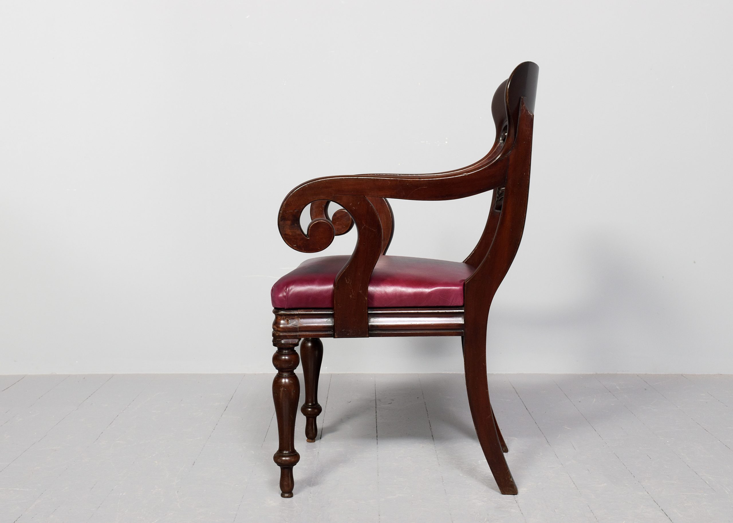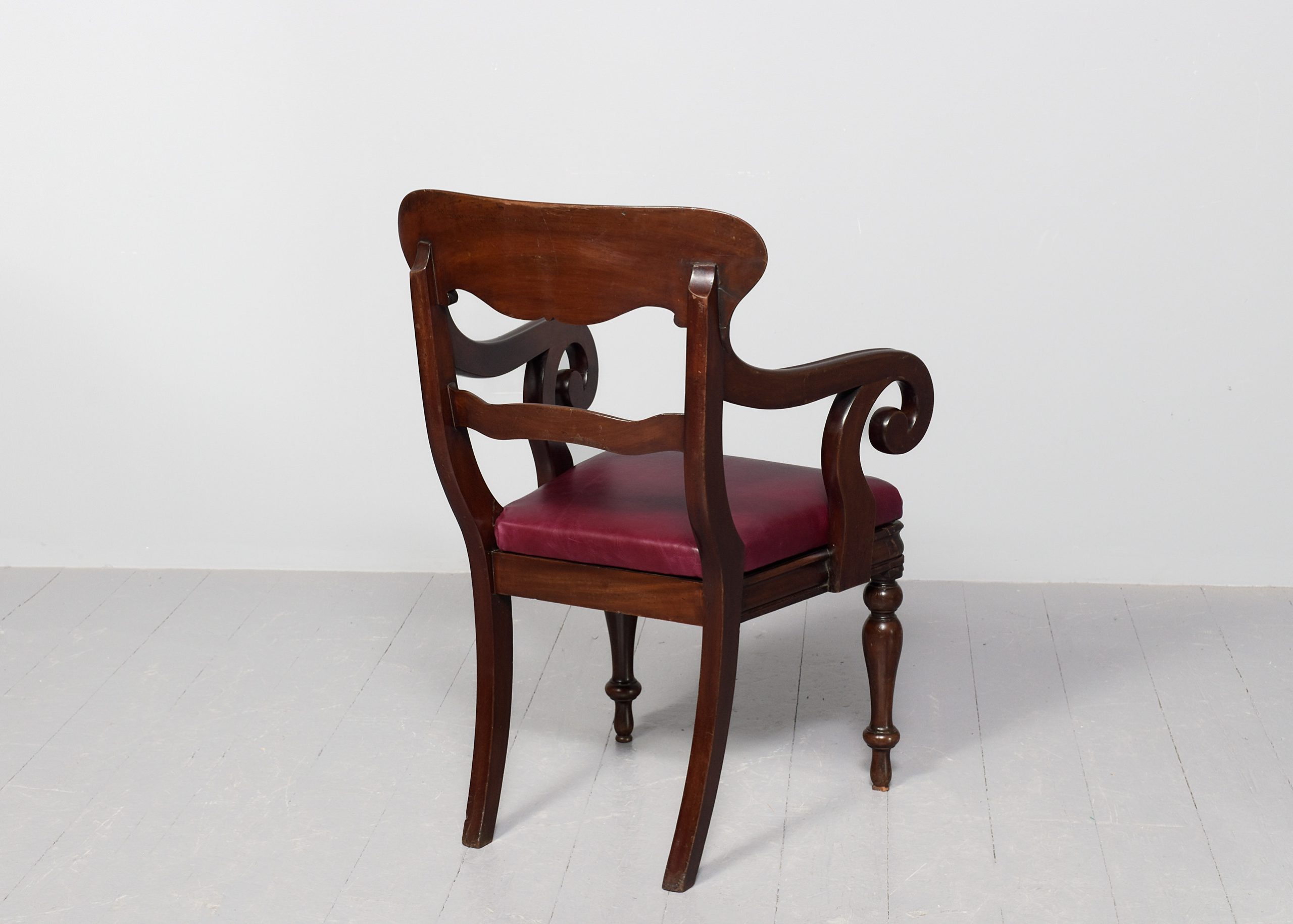 Circa 1840. Large William IV mahogany office or armchair with leather upholstered seat. With a shaped, caved top rail, acanthus carved middle rail and large fluted scrolling arms. Supported on vasiform legs in front and out-swept rear supports. The pad was recently recovered in quality leather.