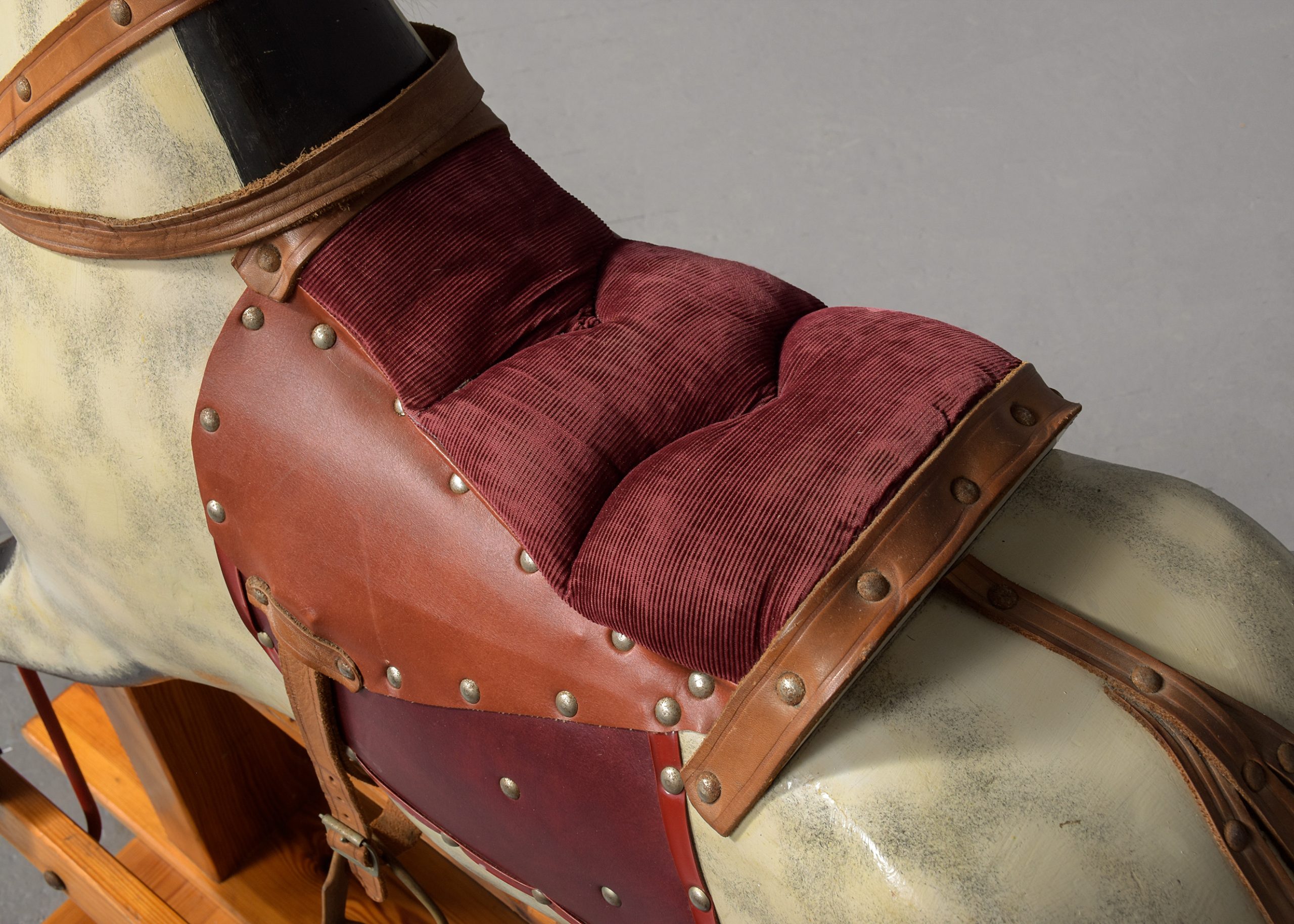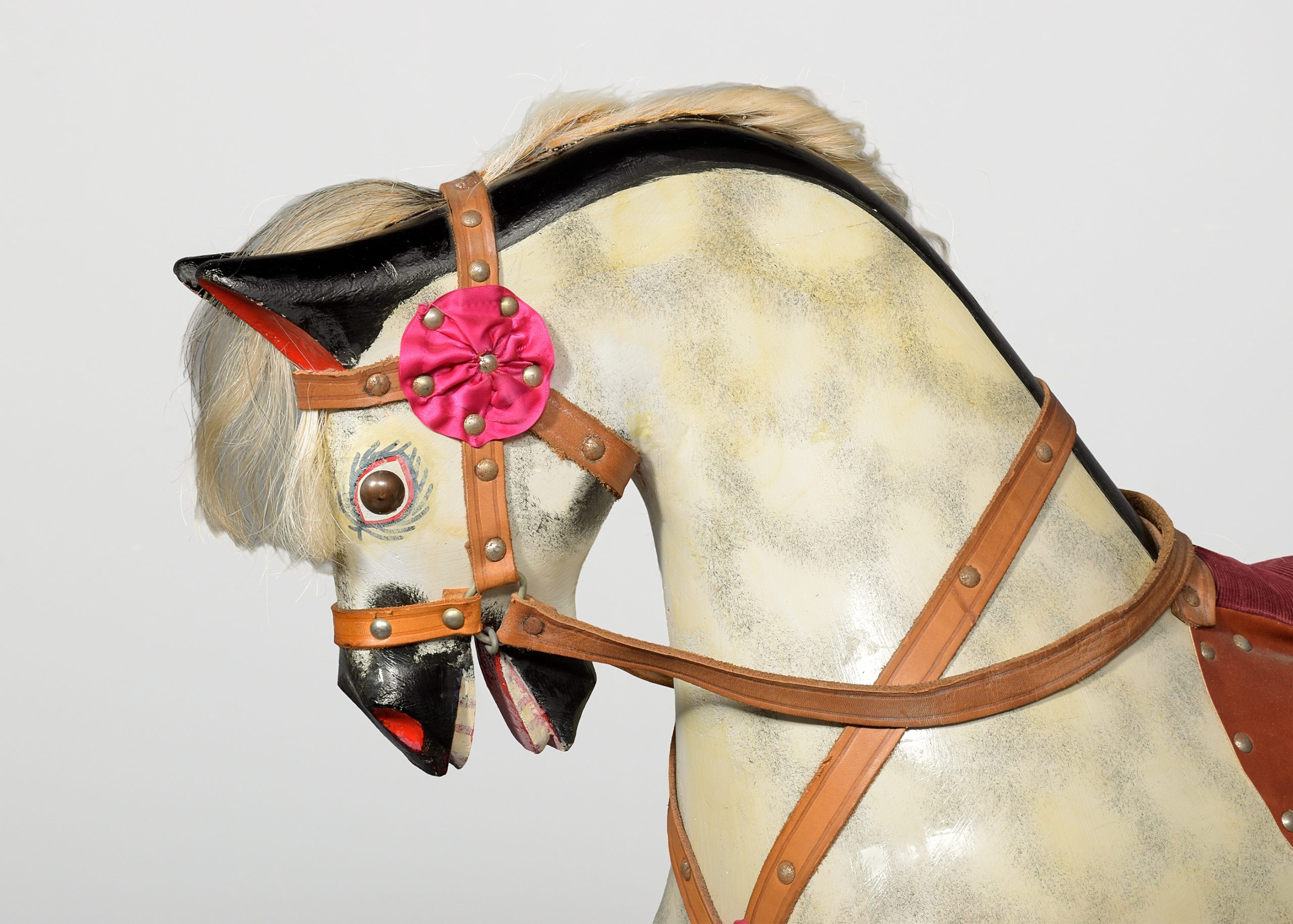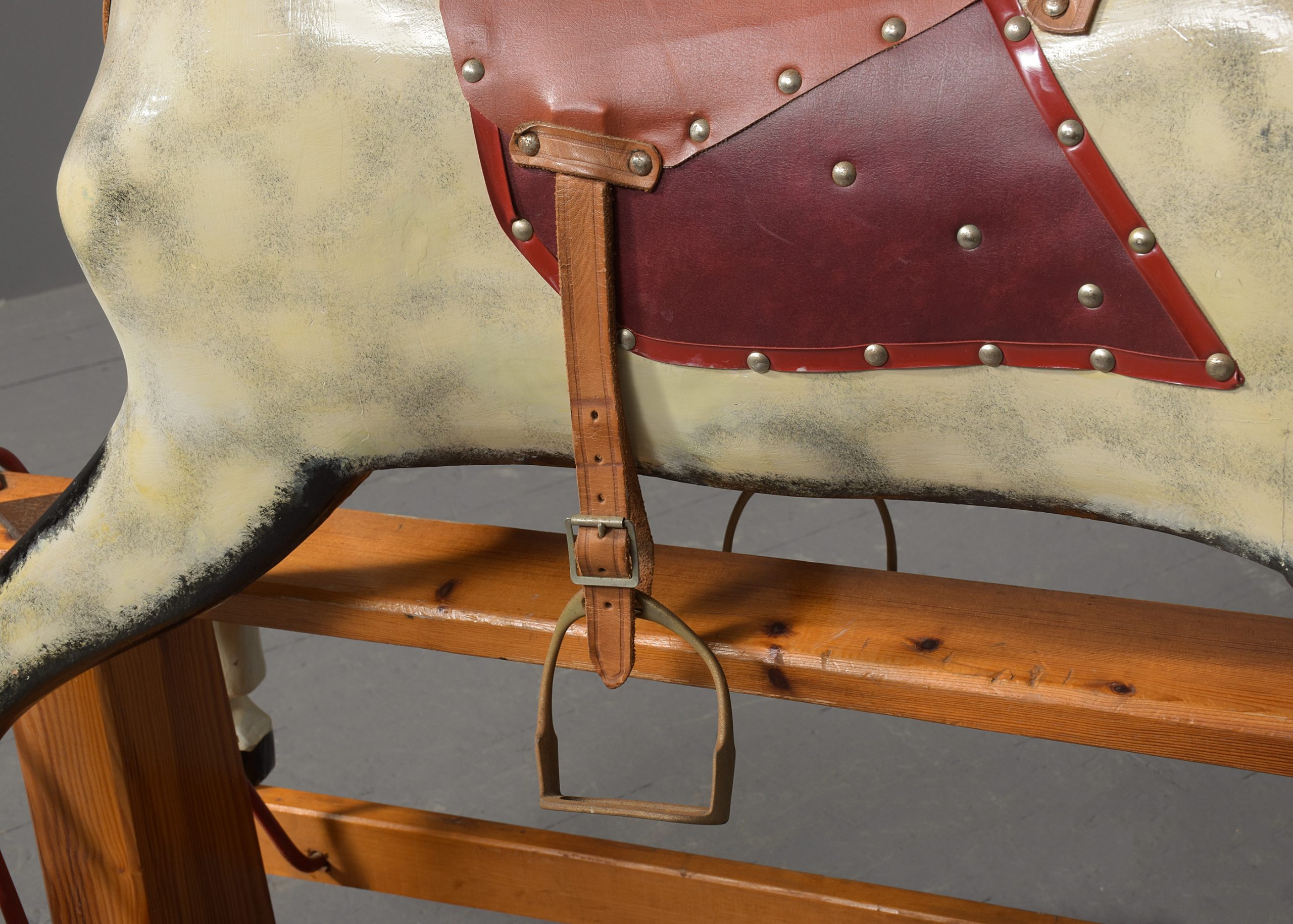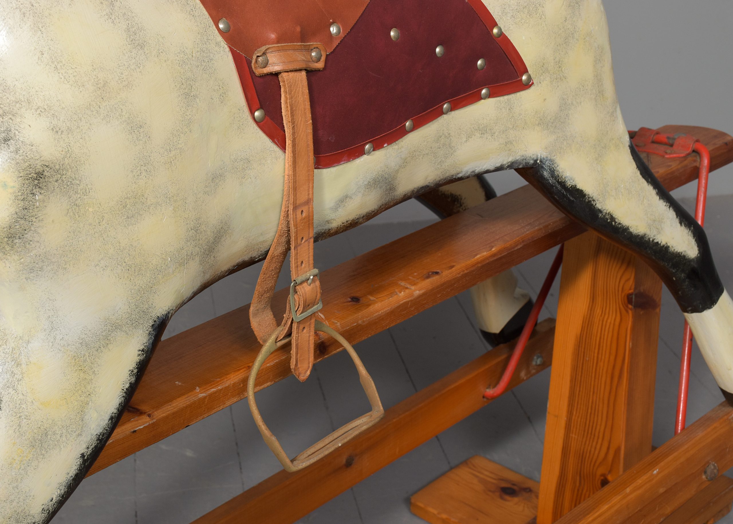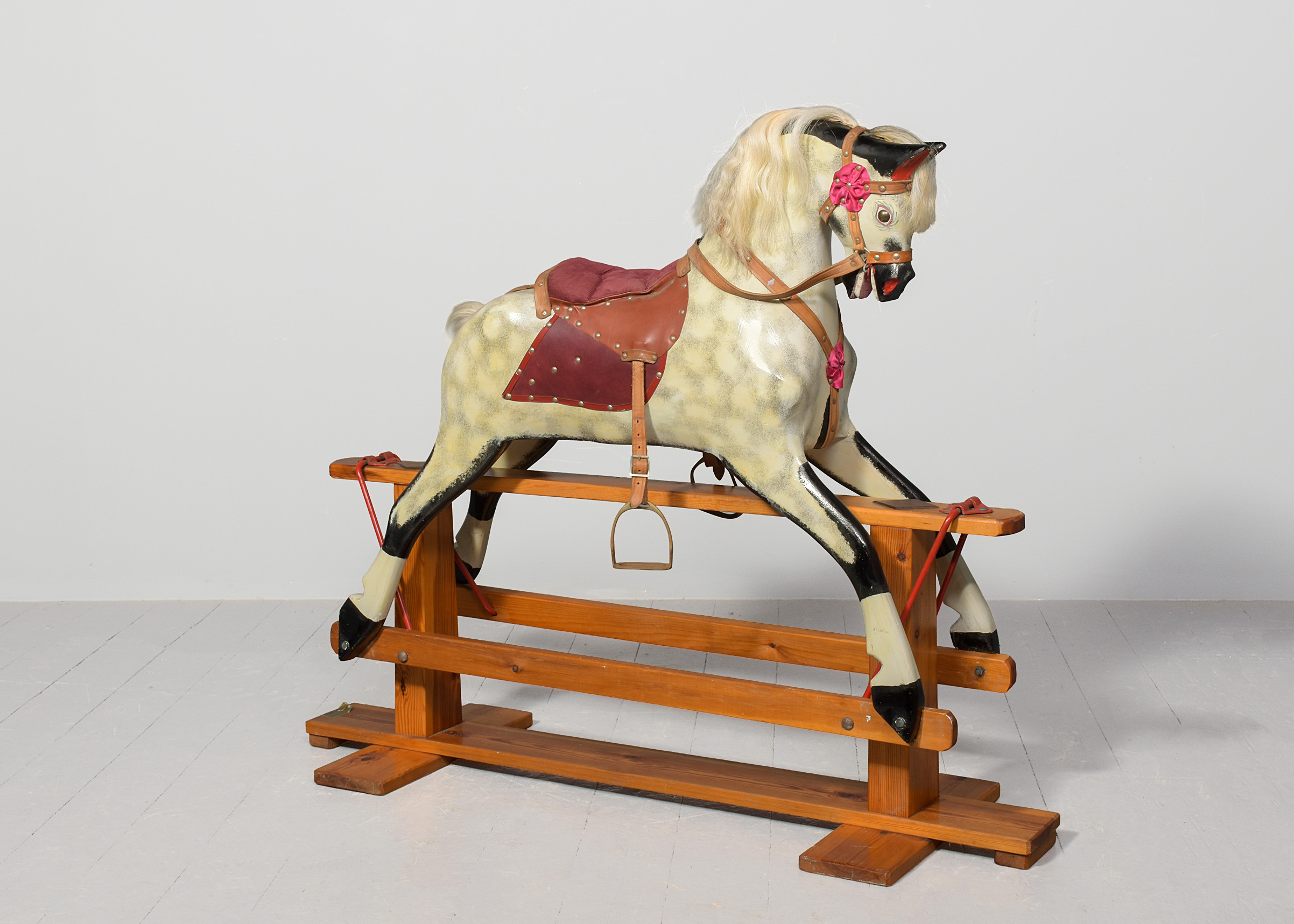 Circa 1960. A wooden dappled-grey Rocking Horse with leather saddle and real horsehair on a pitch pine stand. Made by famous rocking horse maker Collinson and Sons of Liverpool. All in excellent condition.