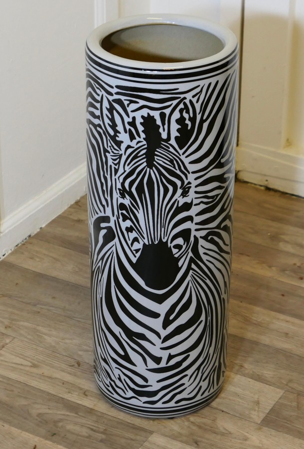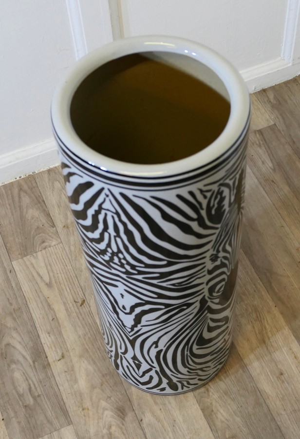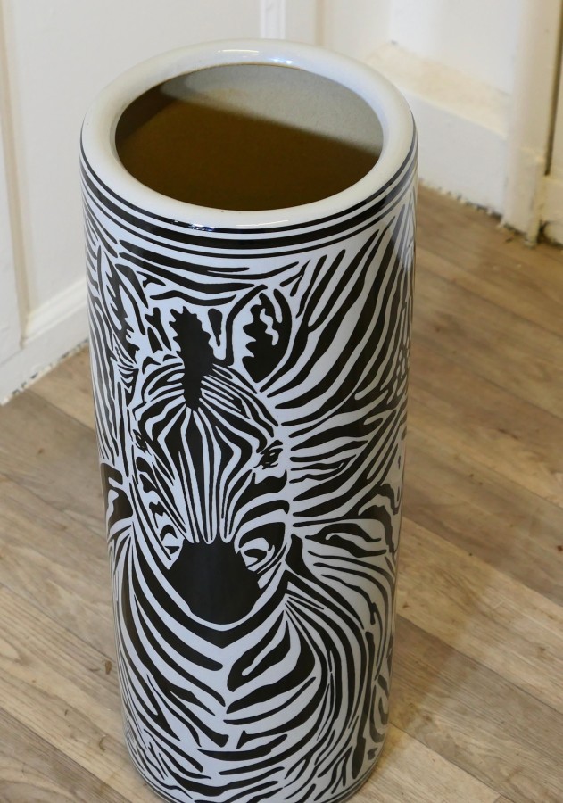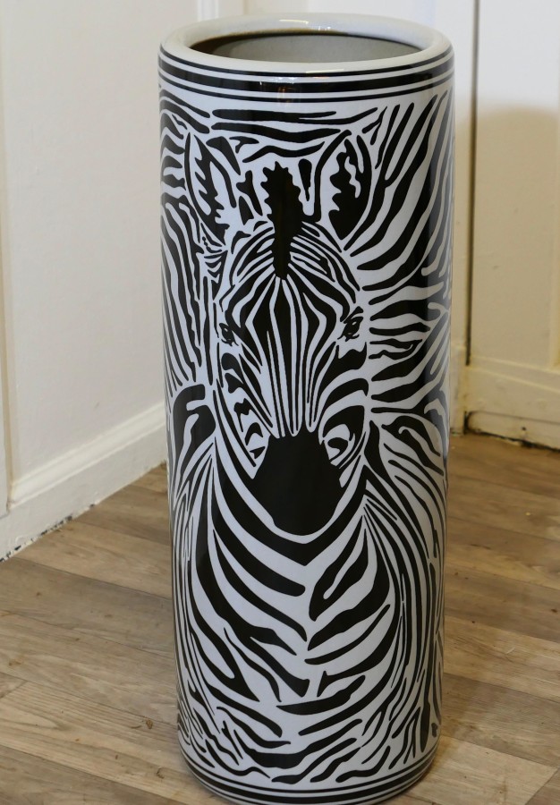 Large Zebra Design Floor Vase, Umbrella Stand This beautiful looking piece is round in shape, and painted, the painted decoration of a Zebra runs all the way around, it is 24” tall and 9” in diameter TNG293 Manufacture Date : 1970 Materials : Ceramic