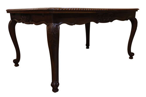 The table is raised on four well-shaped cabriole legs, each carved with subtle detail and joined by a shaped frieze centred with decorative motifs. The rich colour and grain of the oak have developed a warm, even patina, enhancing its overall character and appeal.