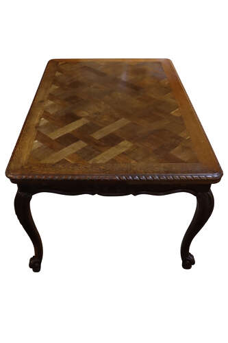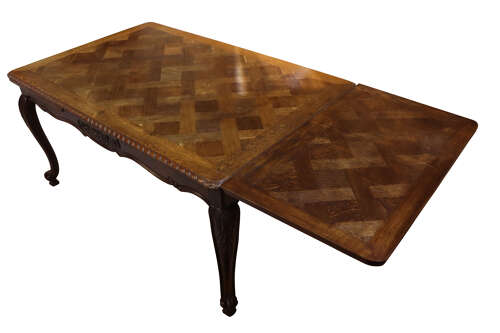 A very good late 19th century French oak extending dining table, dating to circa 1880, of elegant proportions and fine quality throughout. The rectangular top is beautifully inlaid with parquetry panels, framed within a moulded border featuring a rope-twist edge, giving the piece both texture and visual interest.