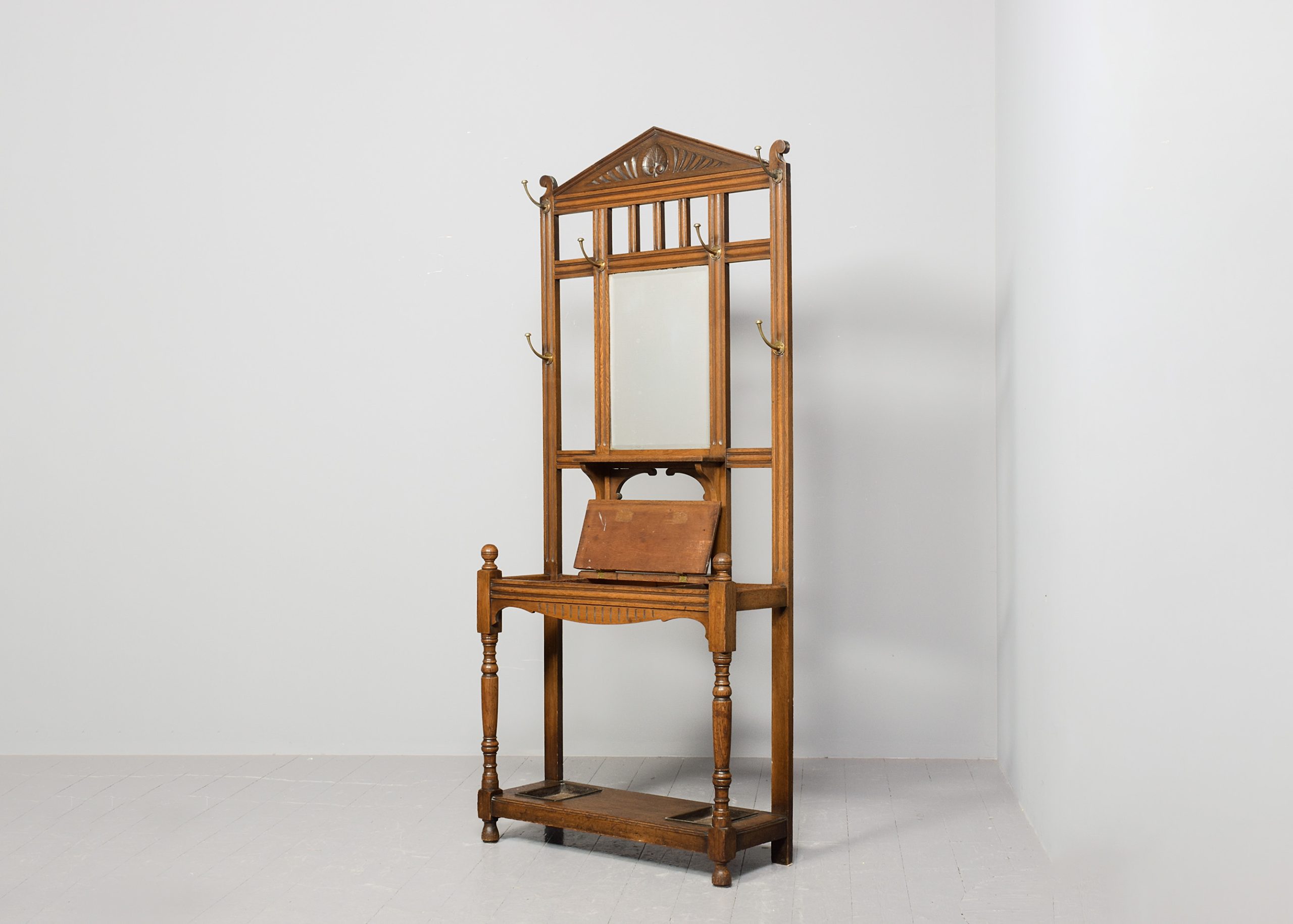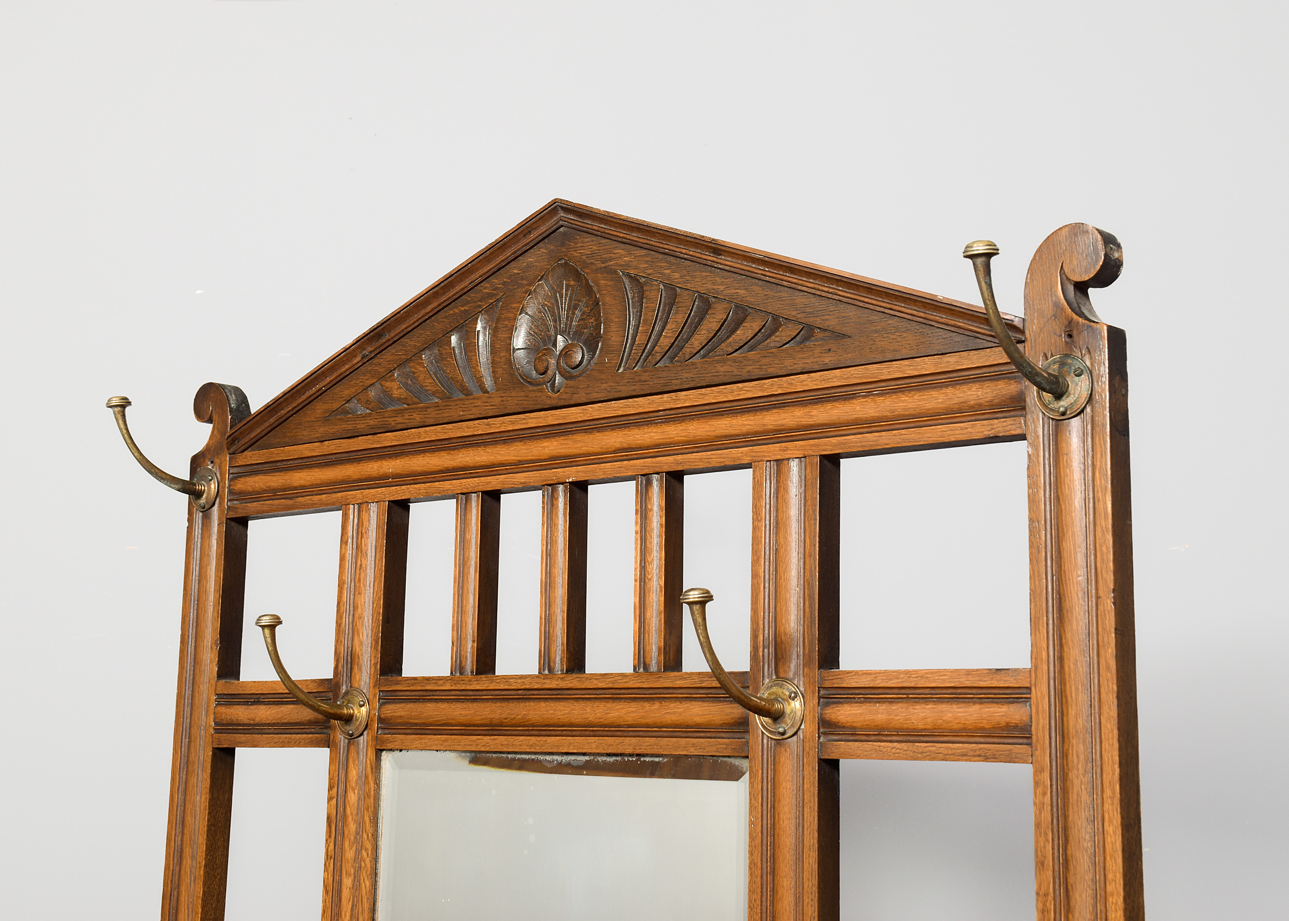 Circa 1880. Late Victorian Arts and Crafts influence stylish oak hallstand. Surmounted by a triangular pediment with foliate decoration, the back has 6 original brass hooks and a central bevelled-edge mirror (with some foxing) above a ledge and glove compartment. Retains its original metal drip trays. Lovely colour and patina.
