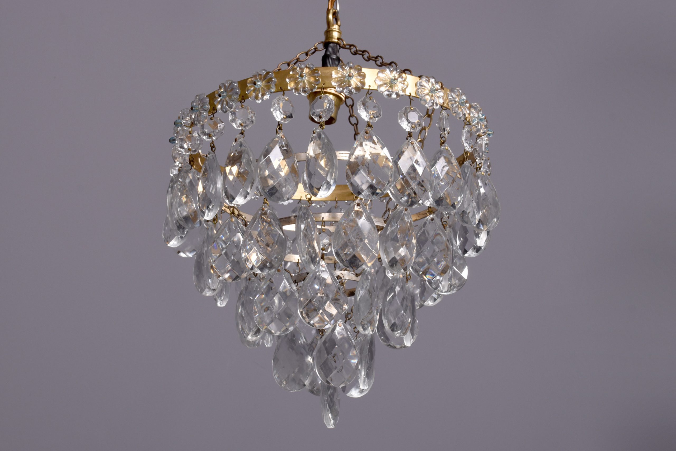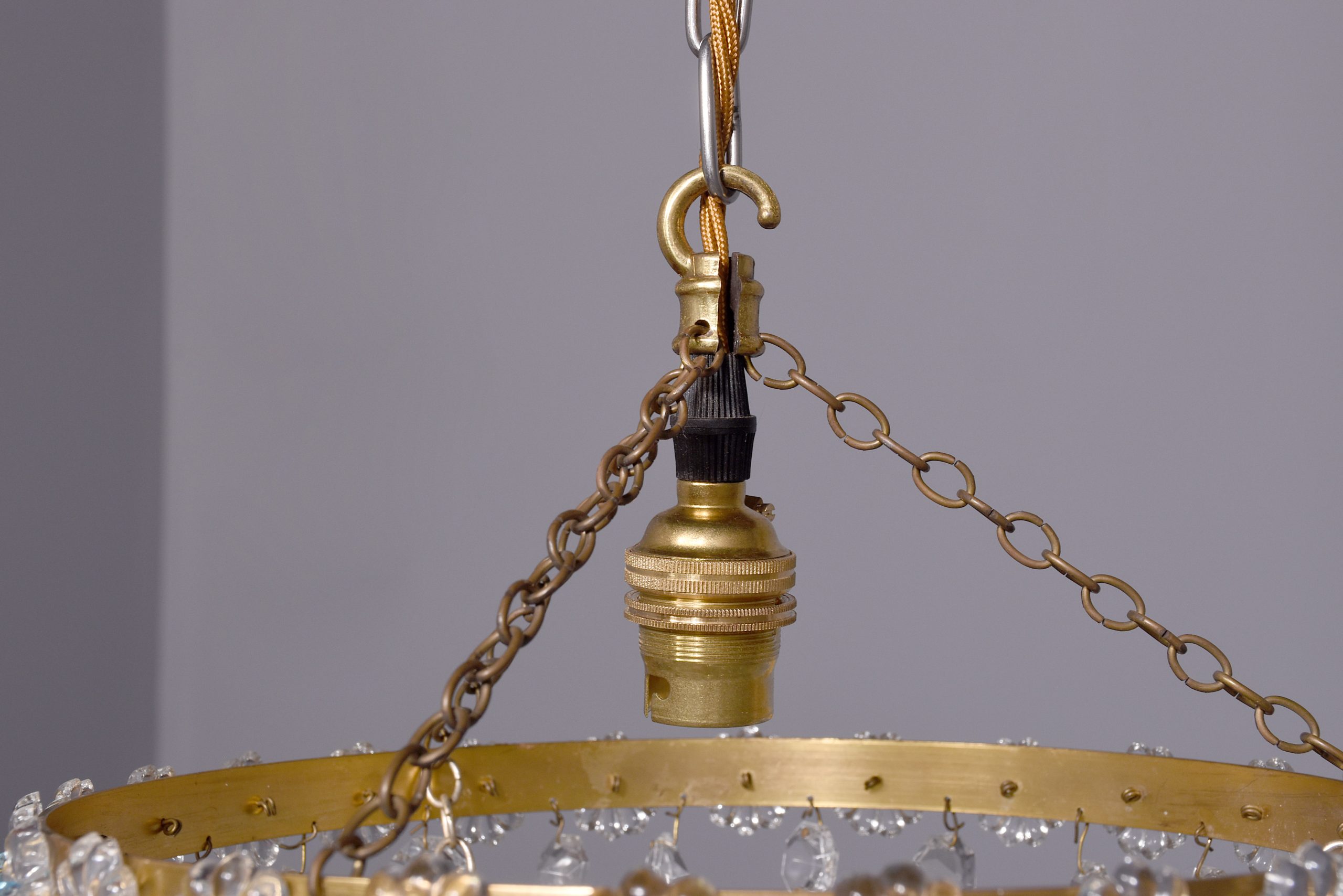 Circa 1890. Late Victorian neat-size brass and crystal four-tier chandelier. With 4 concentric brass rings with external glass medallions, each supporting rows of pear-shaped (“Swedish style”) crystals. faceted on both sides that are all suspended on small diamond-shaped crystals. The base with a single pear-shaped crystal hanging down centrally. All supported on three brass chains to a longer chain and a brass ceiling rose. Just rewired with silk-covered cable. 26cm Diameter.