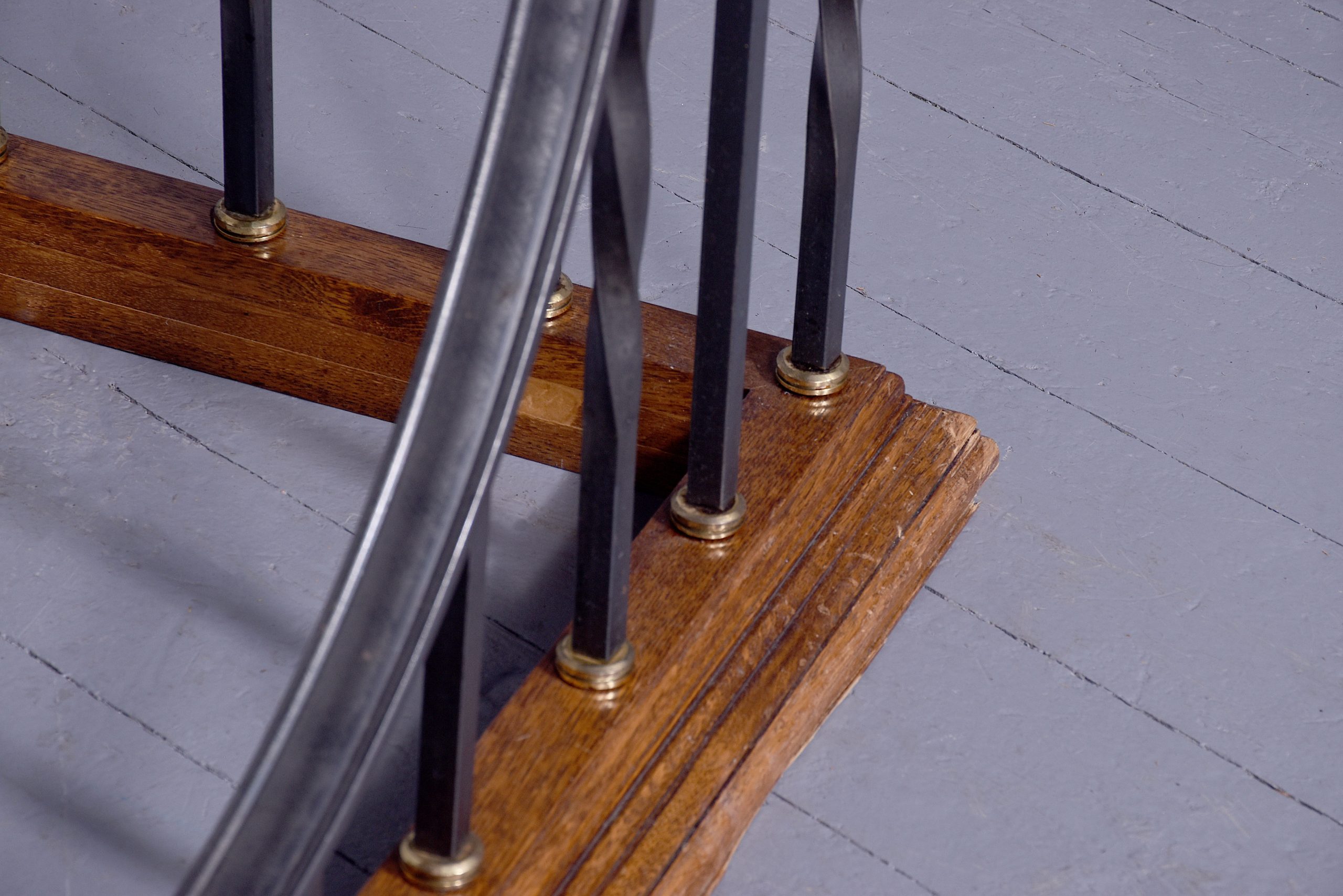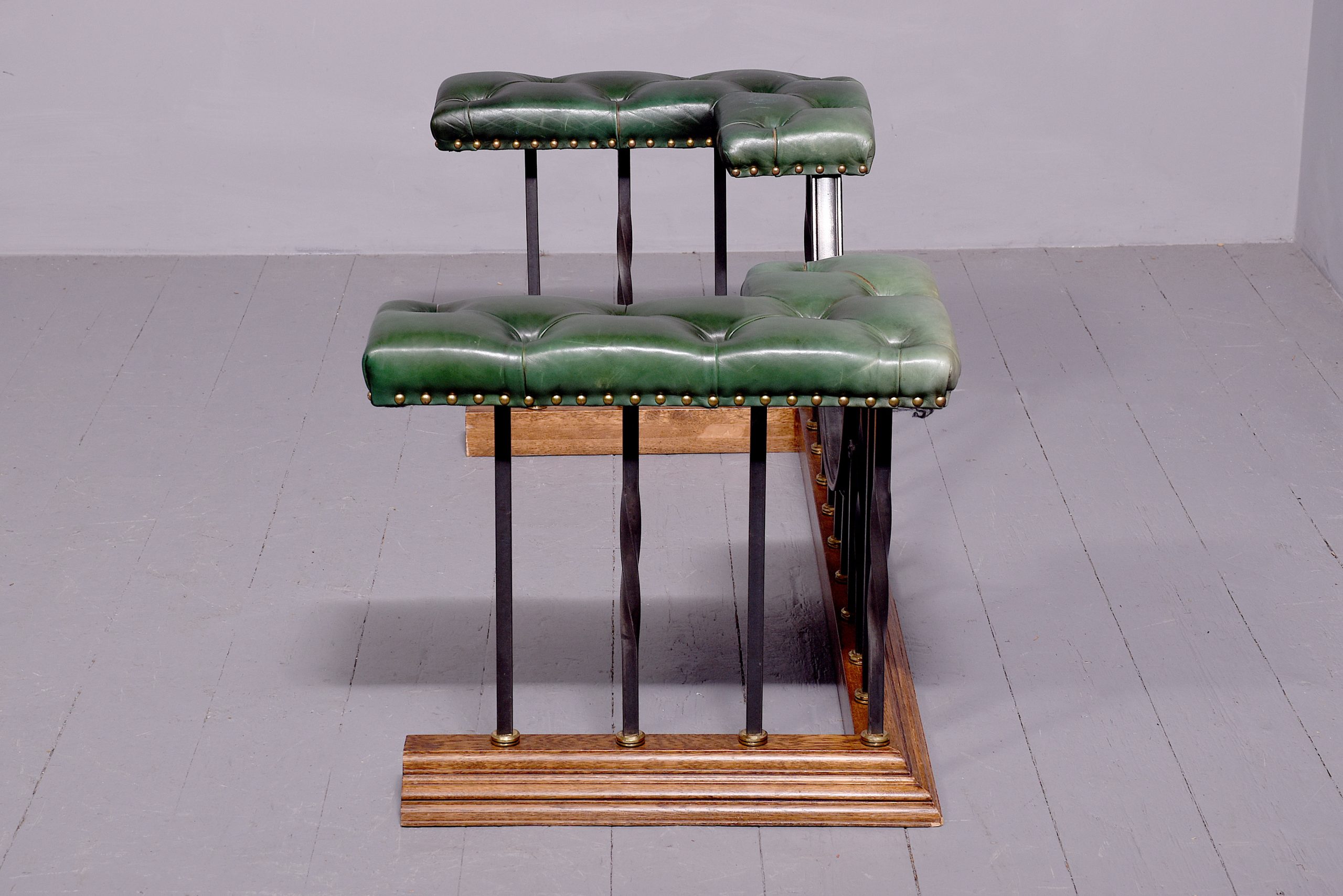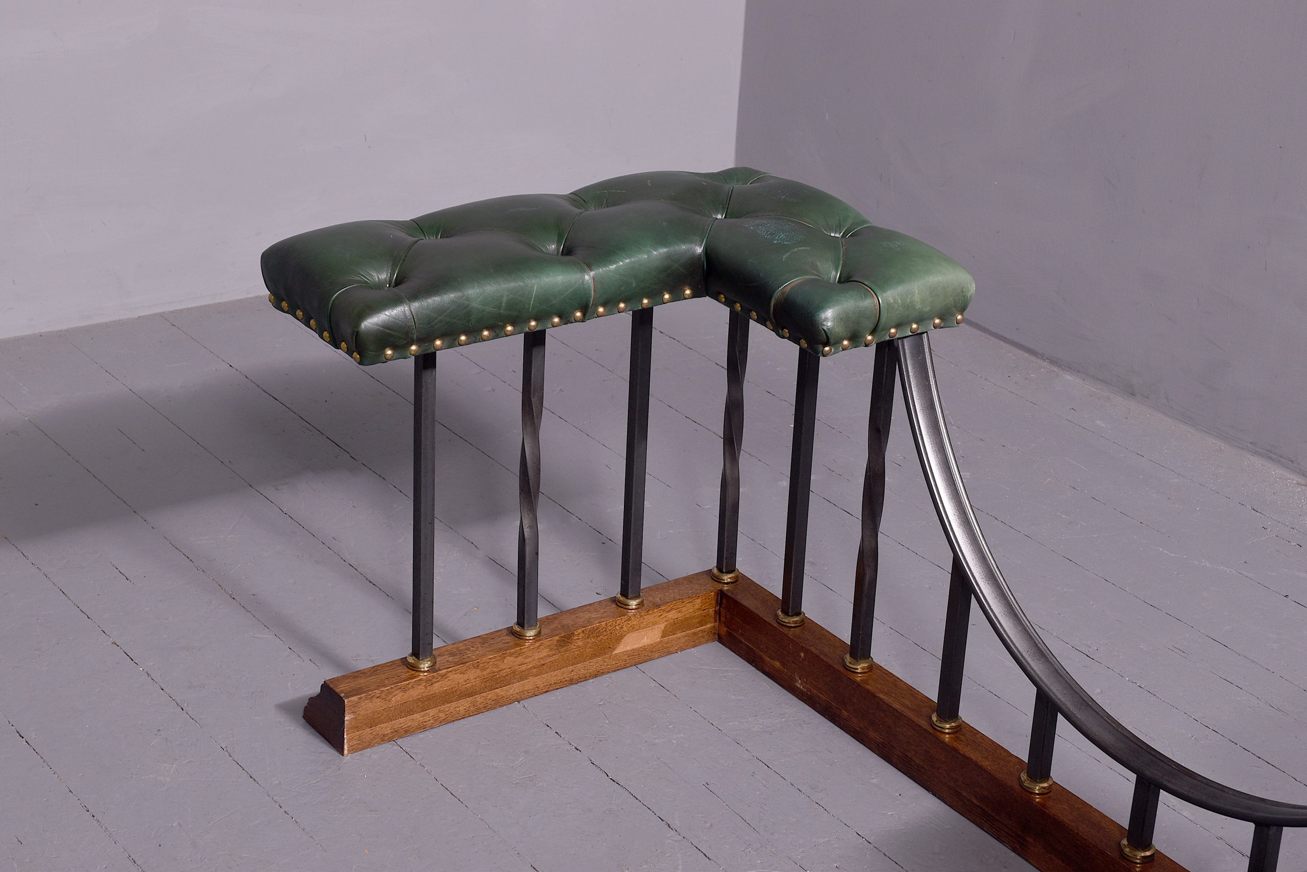 Circa 1970s. A classic oak, steel, brass and leather upholstered club fender, with two pleated and deep buttoned L shaped tops upholstered in green leather, held in place by brass studs, resting on stylish balustrades which are both square and twisted, all of the upright balustrades finishing with a solid brass collar, supported on a moulded oak frame, the fender with a dipped center for access to the fire.
