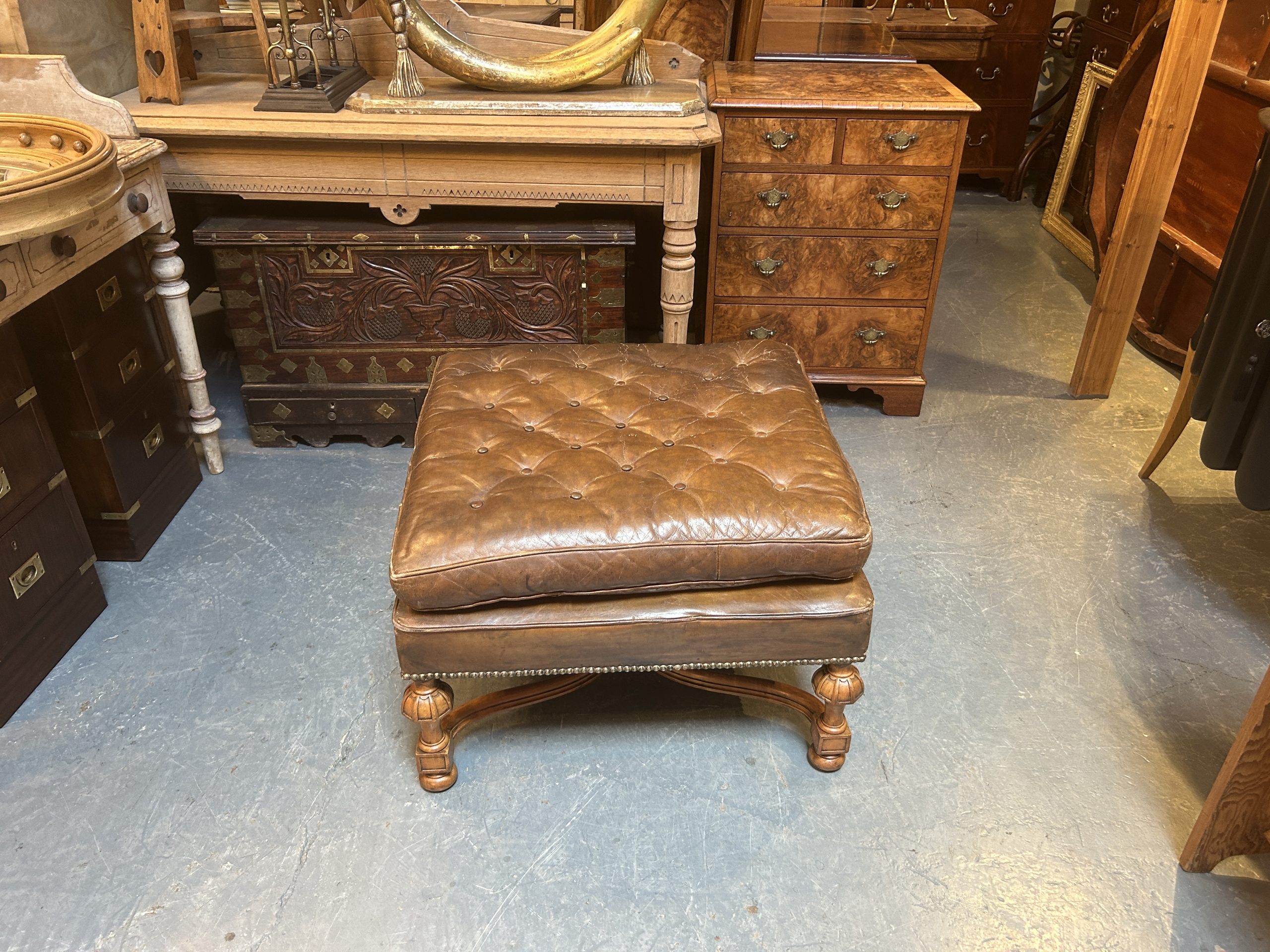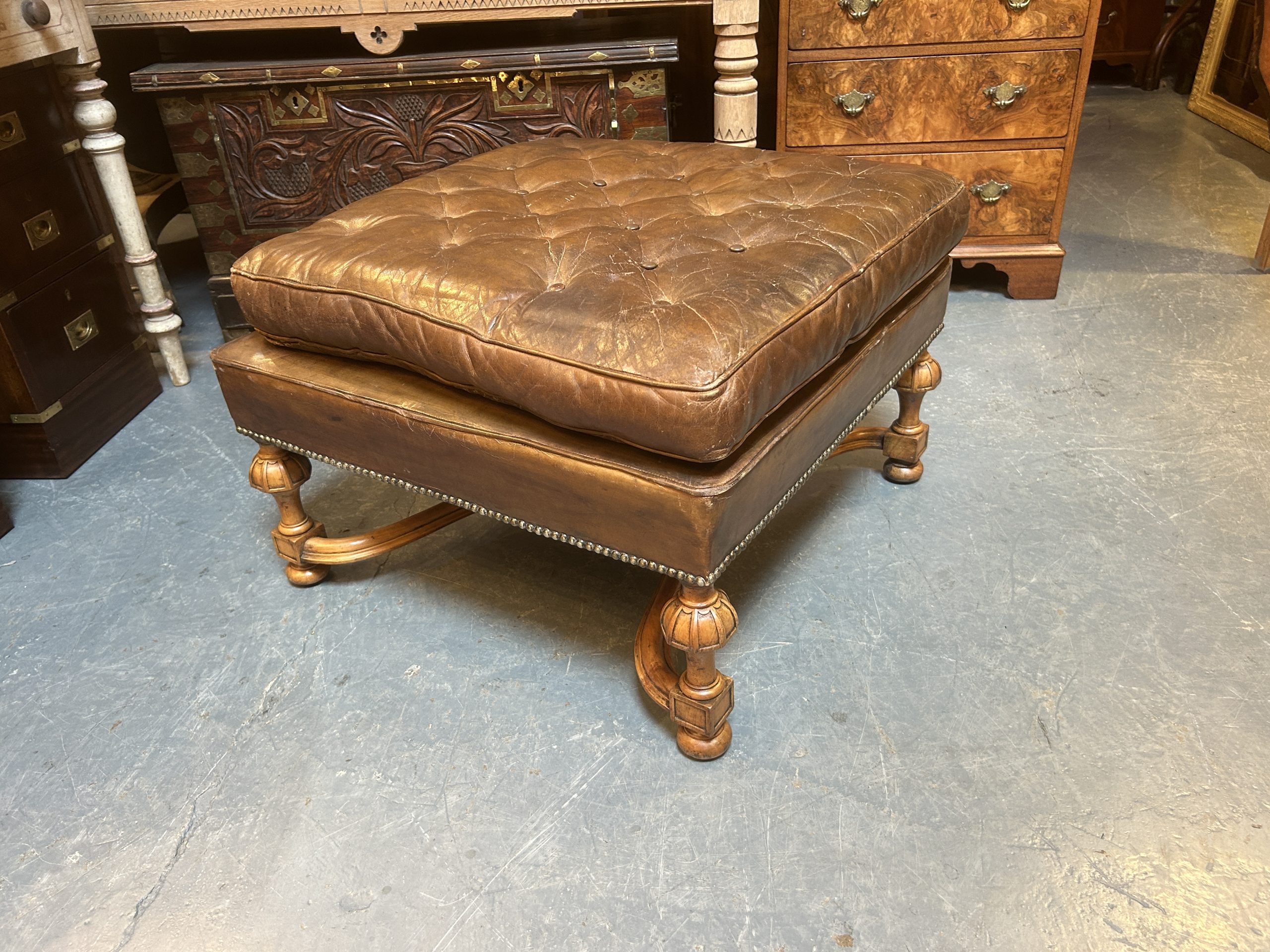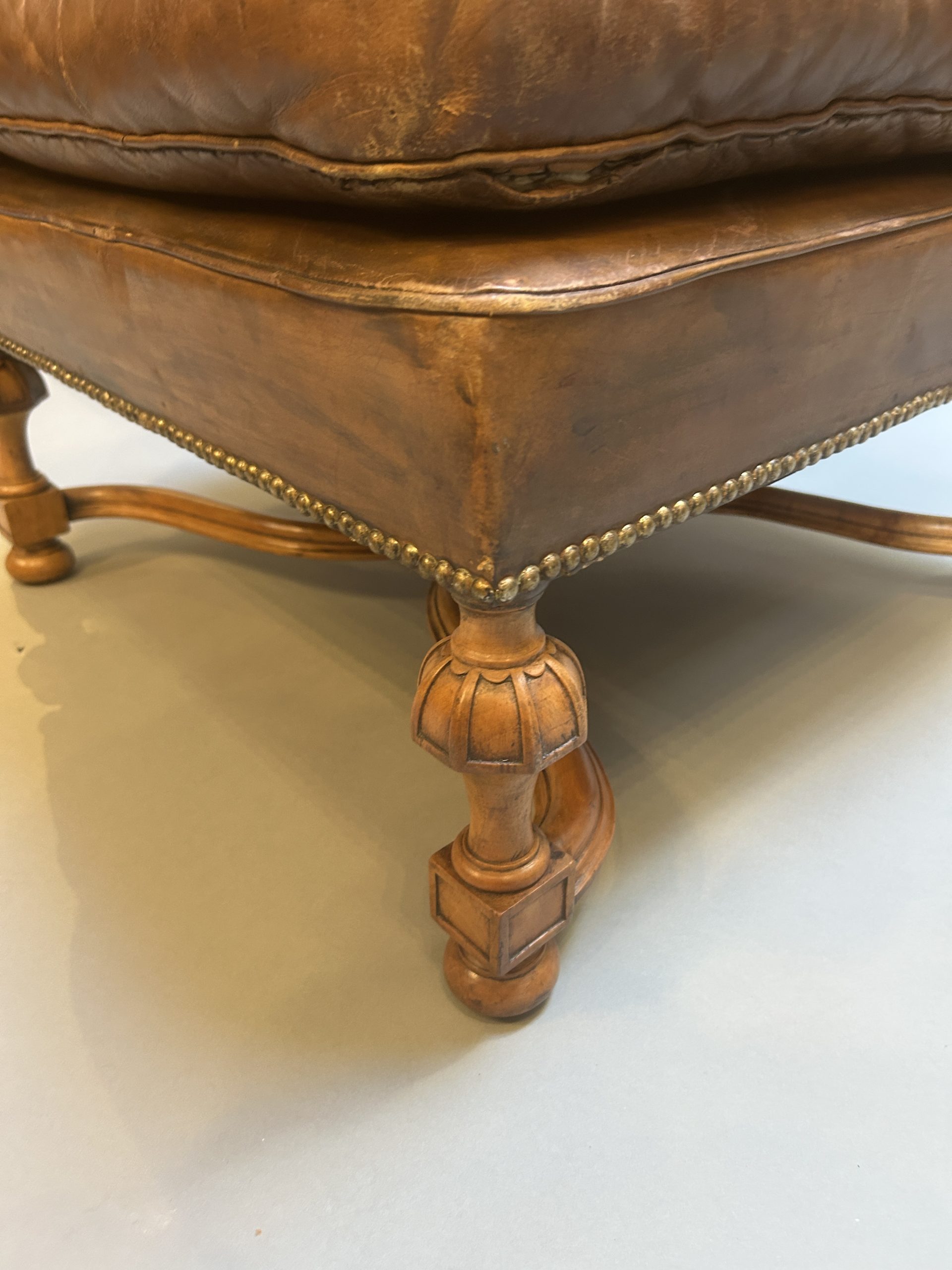 Early C20th in the Queen Anne taste, the buttoned leather squab cushion over close nailed seat, raised on walnut base of facetted legs united by curved stretcher.