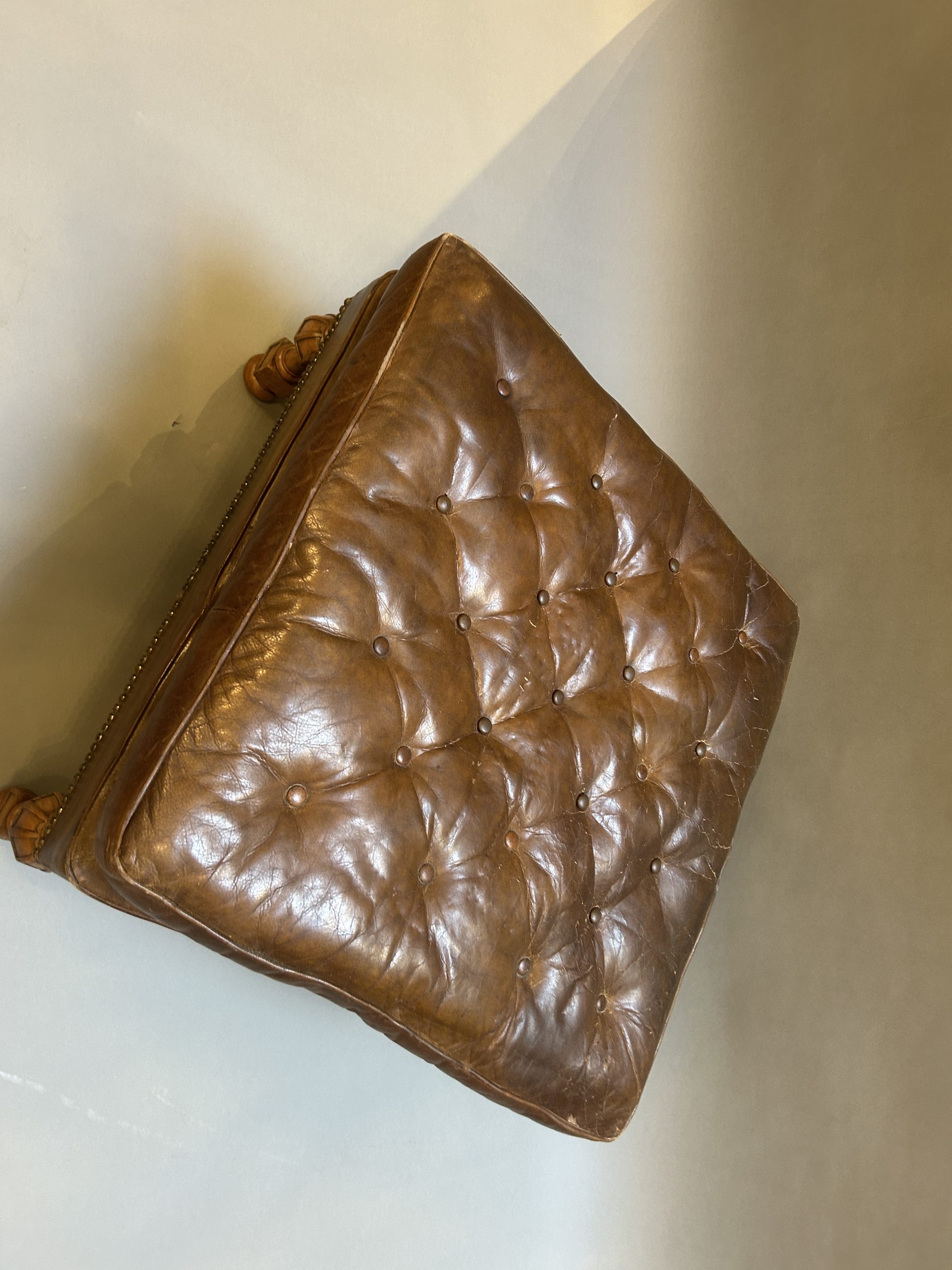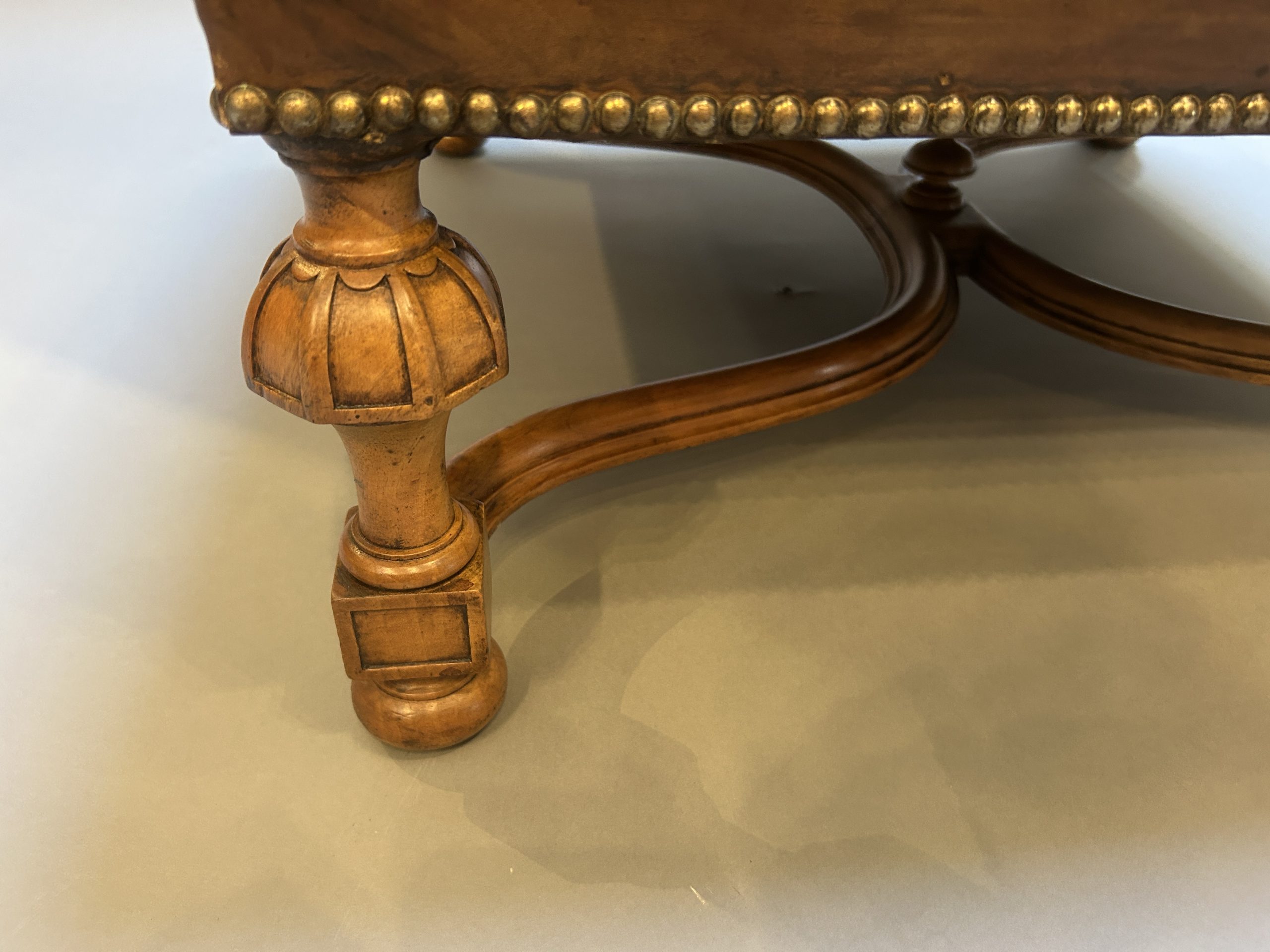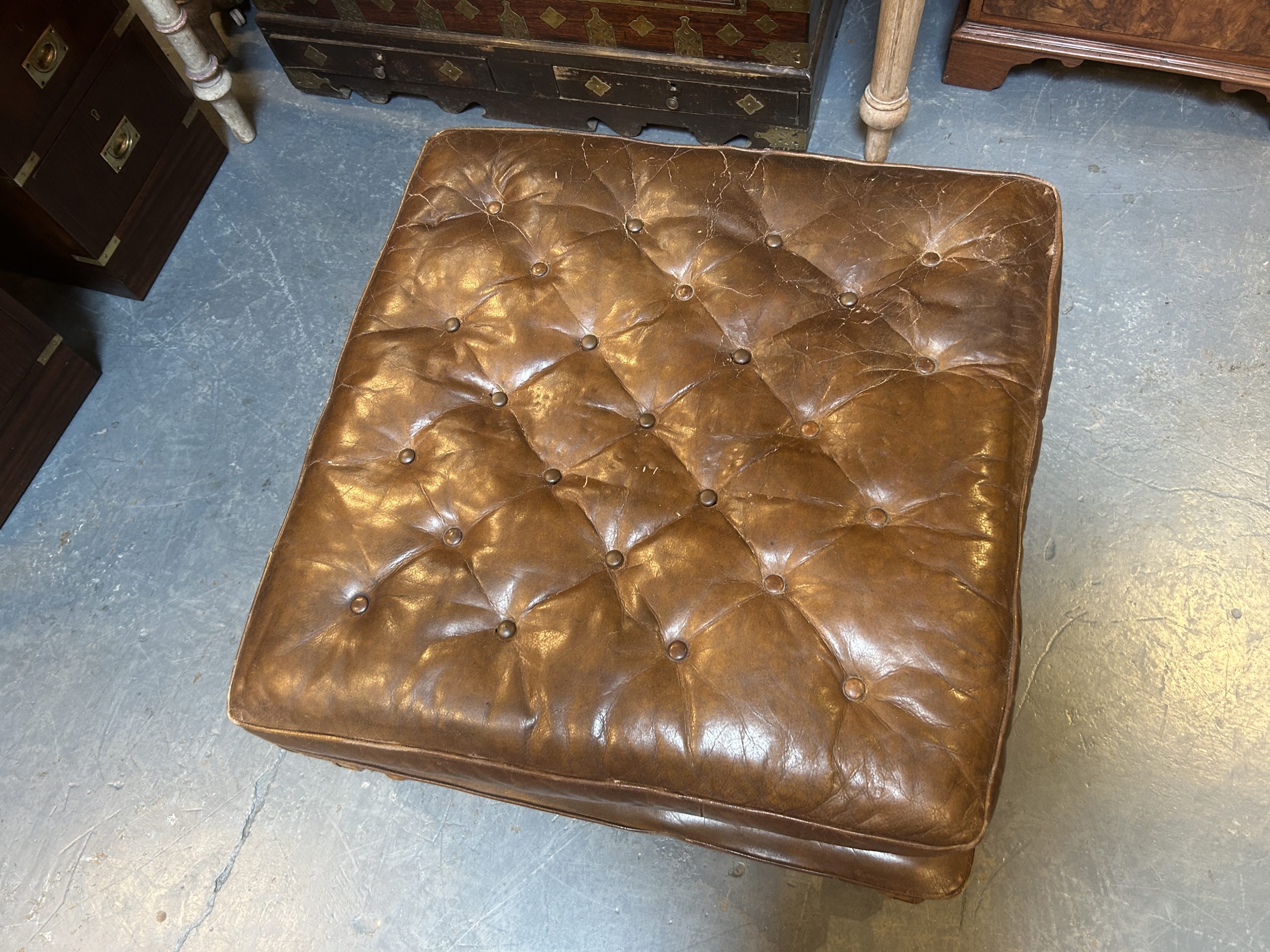 Early C20th in the Queen Anne taste, the buttoned leather squab cushion over close nailed seat, raised on walnut base of facetted legs united by curved stretcher.