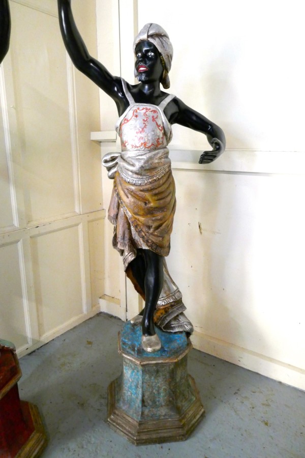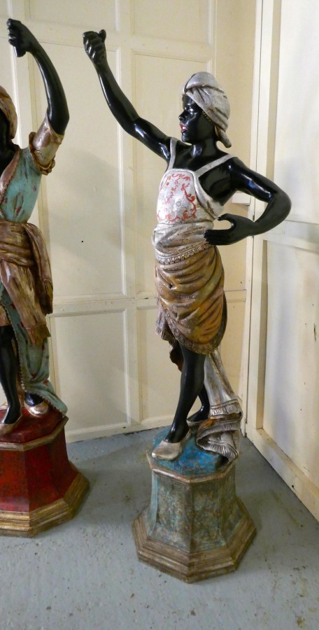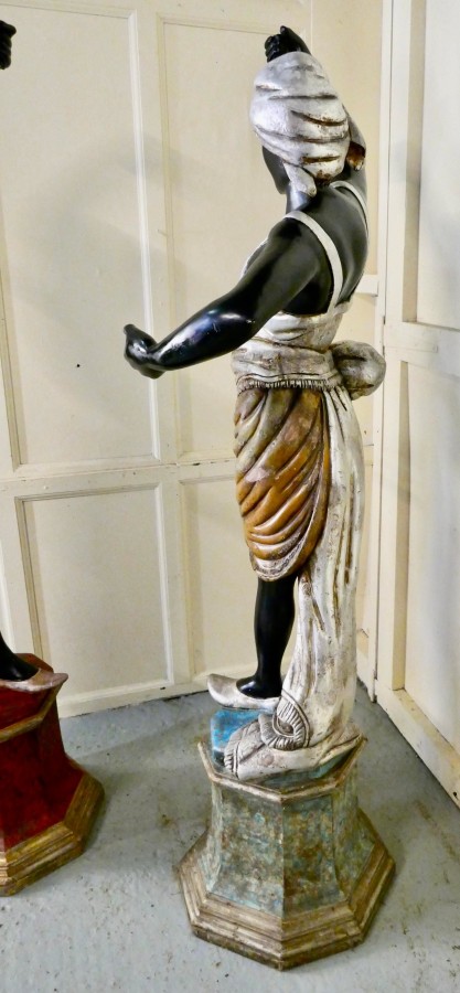 Life size Pair of 19th Century Italian Carved Wooden Statues These charming early 19th century Statues stand almost 6ft high, they each have a socket in their hand which once would have held a candle sconce. They are a male and female pair, him with his neat beard and the lady with curly hair, they have rich and luxuriously draped clothes, their faces have the most wonderful expressions The Statues are carved in wood which has been prepared with gesso before being painted, the colours are bright with generous amounts of Silver The Statues are in very good condition, there is only a very little chipping of their paint, they are set on plinths and can be dismantled for transport The Statues are 68” tall and approximately 26” across HT234 Manufacture Date : 1870 Materials : Pine