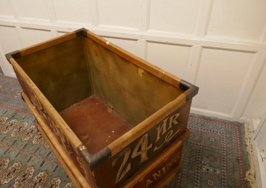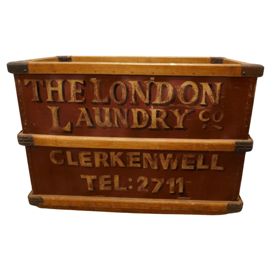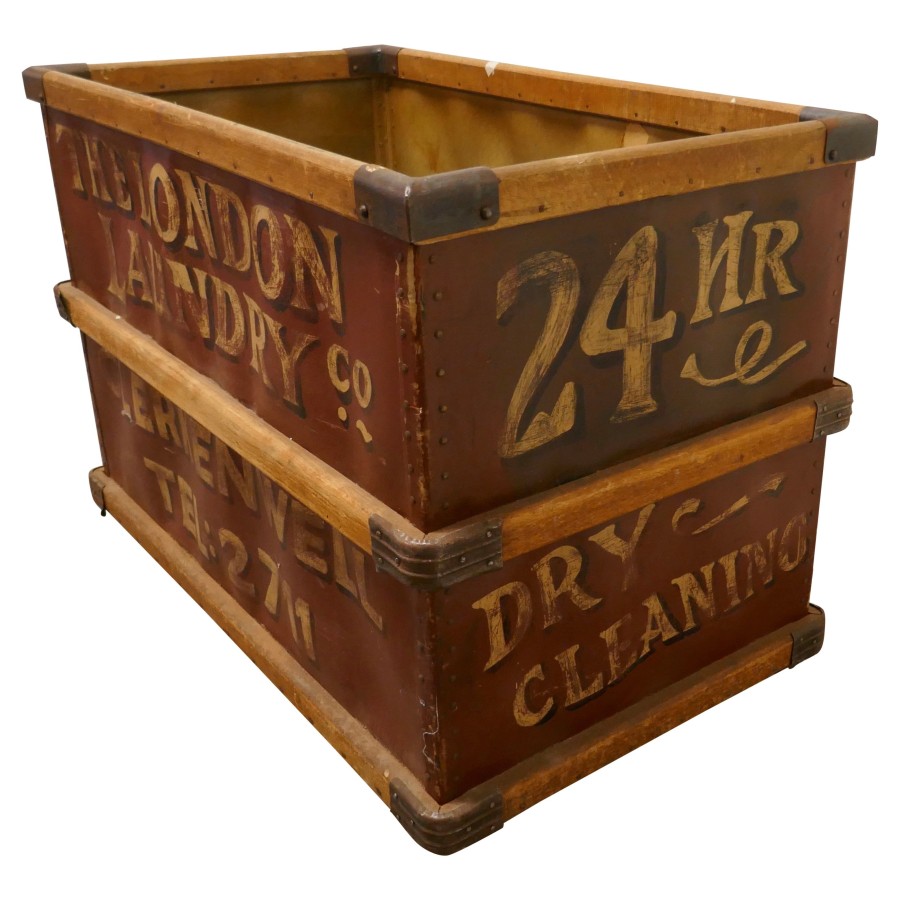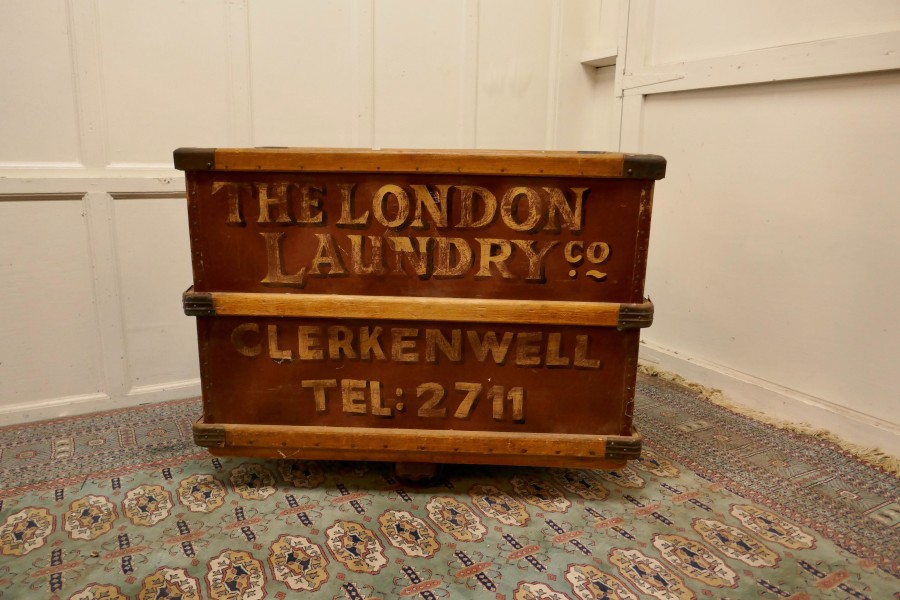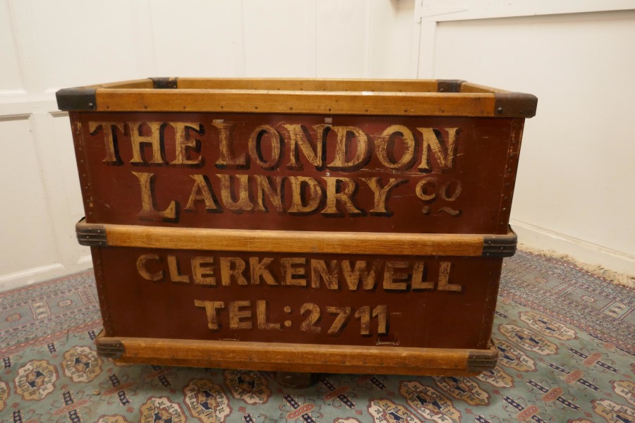 London Laundry Co. Industrial Trolley Cart Great piece from the London Laundry Co. Clerkenwell, the cart is made in thick heavy duty parchment and has iron wheels and wooden banding The Trolley is 33” high, 41” long and 23” wide, it is in well used condition and has many possible uses NV29 Manufacture Date : 19th Century Materials : Pine