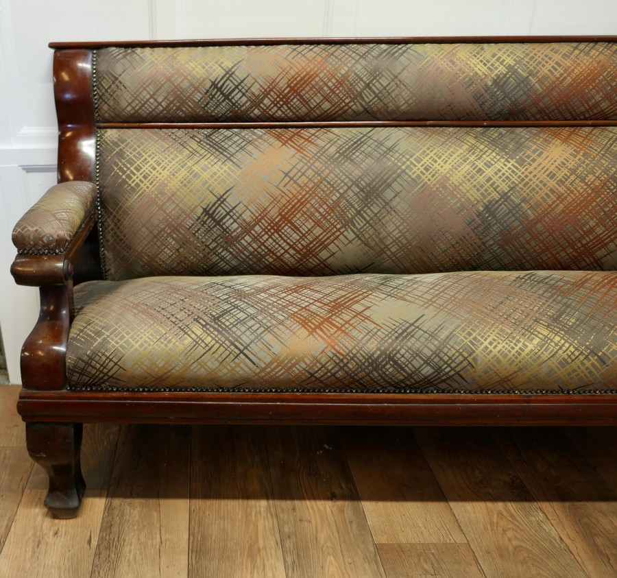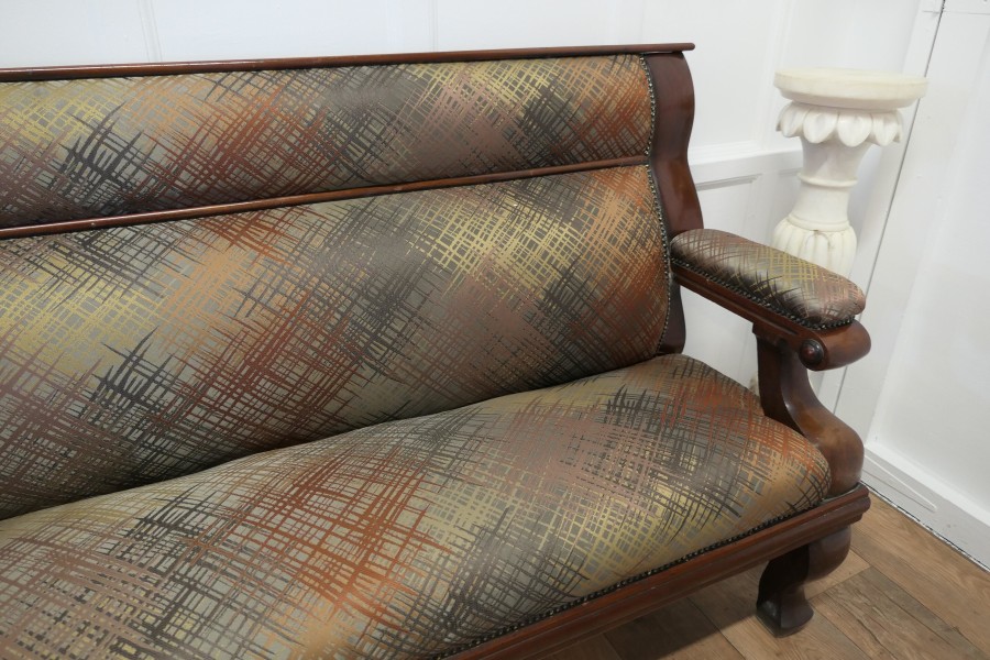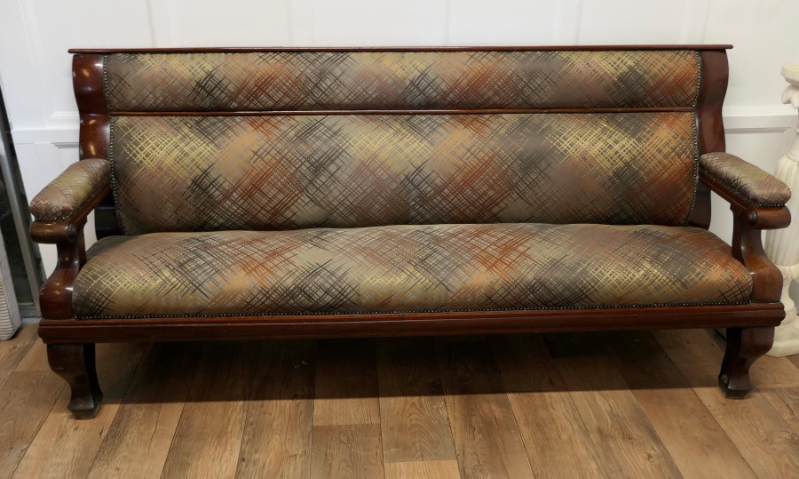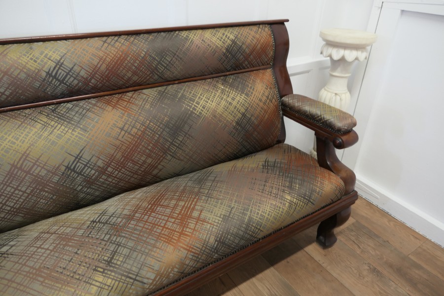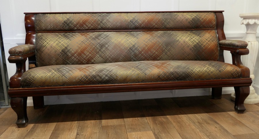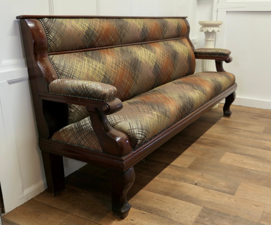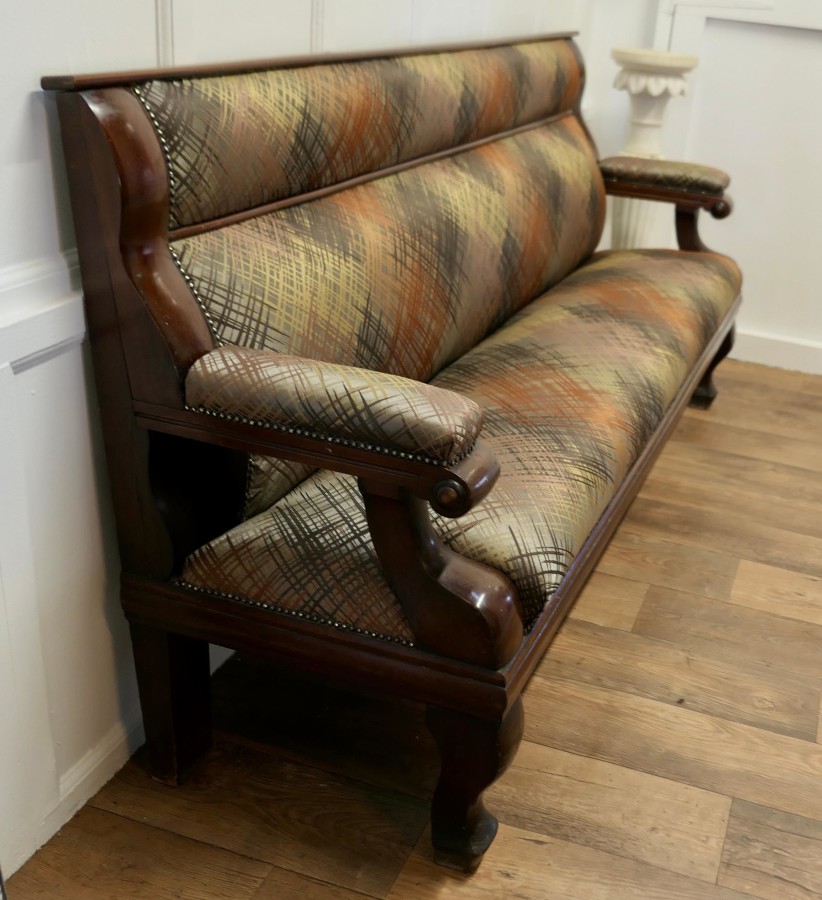 Long Waiting Room Seat or Hall Bench This is a very sturdy and heavy piece, the back and seat are newly upholstered, in an abstract design in autumn colours The bench has a long seat with upholstered arms at each end and a panelled back This is a good sturdy piece in very good condition, it may have originated from a Snooker Hall and would work well where a comfortable seating is required for patient clients The Bench is 39” high at the back the seat is 20” high it is 83” long and 23”deep MS45. Manufacture Date : 1890 Materials : Walnut