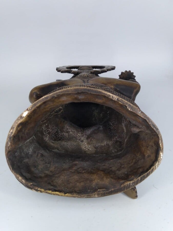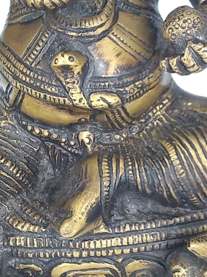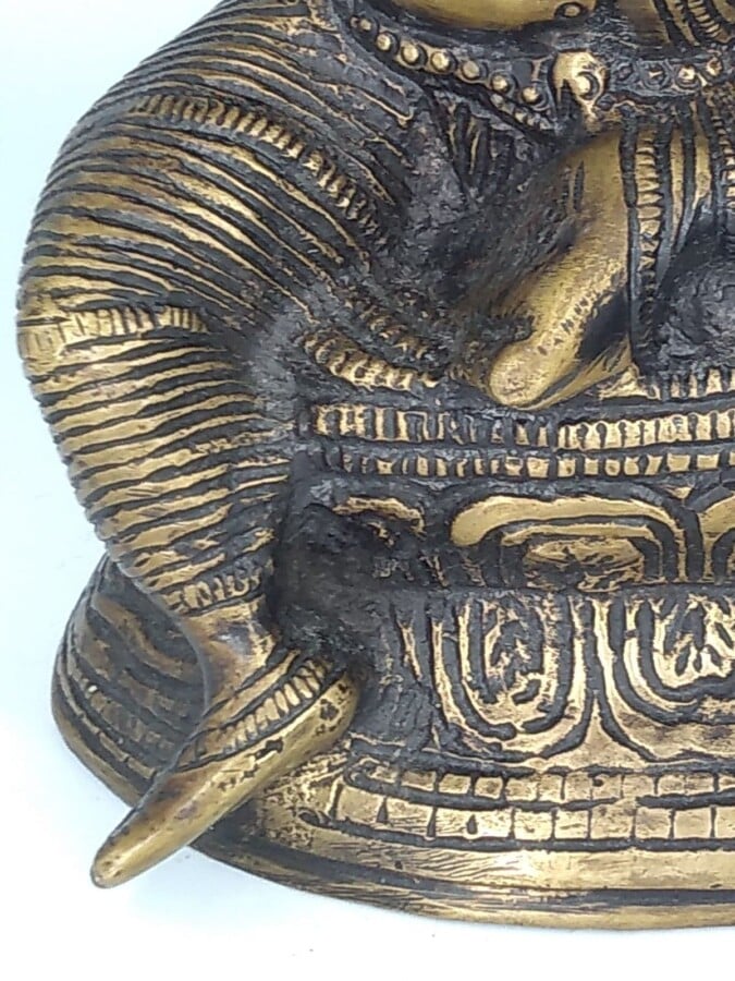 A tall brass figure of the Hindu Elephant Deity Lord Ganesh.  A seated, four armed sculpture with a figure of a mouse at the bottom front depicting desire.