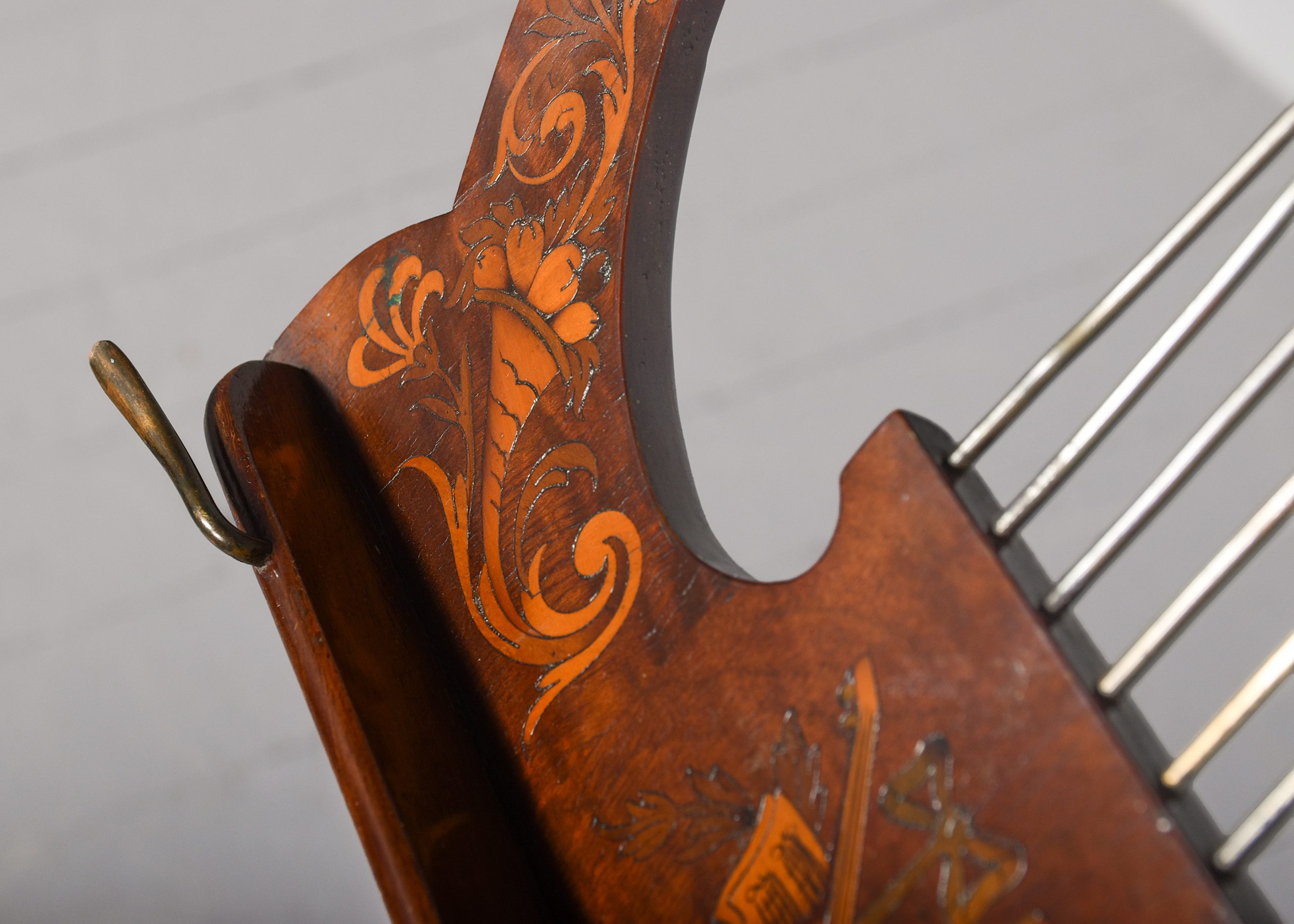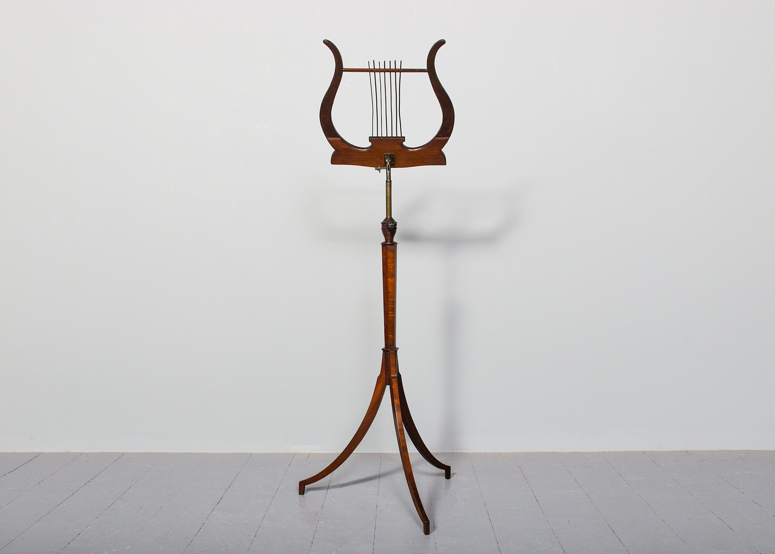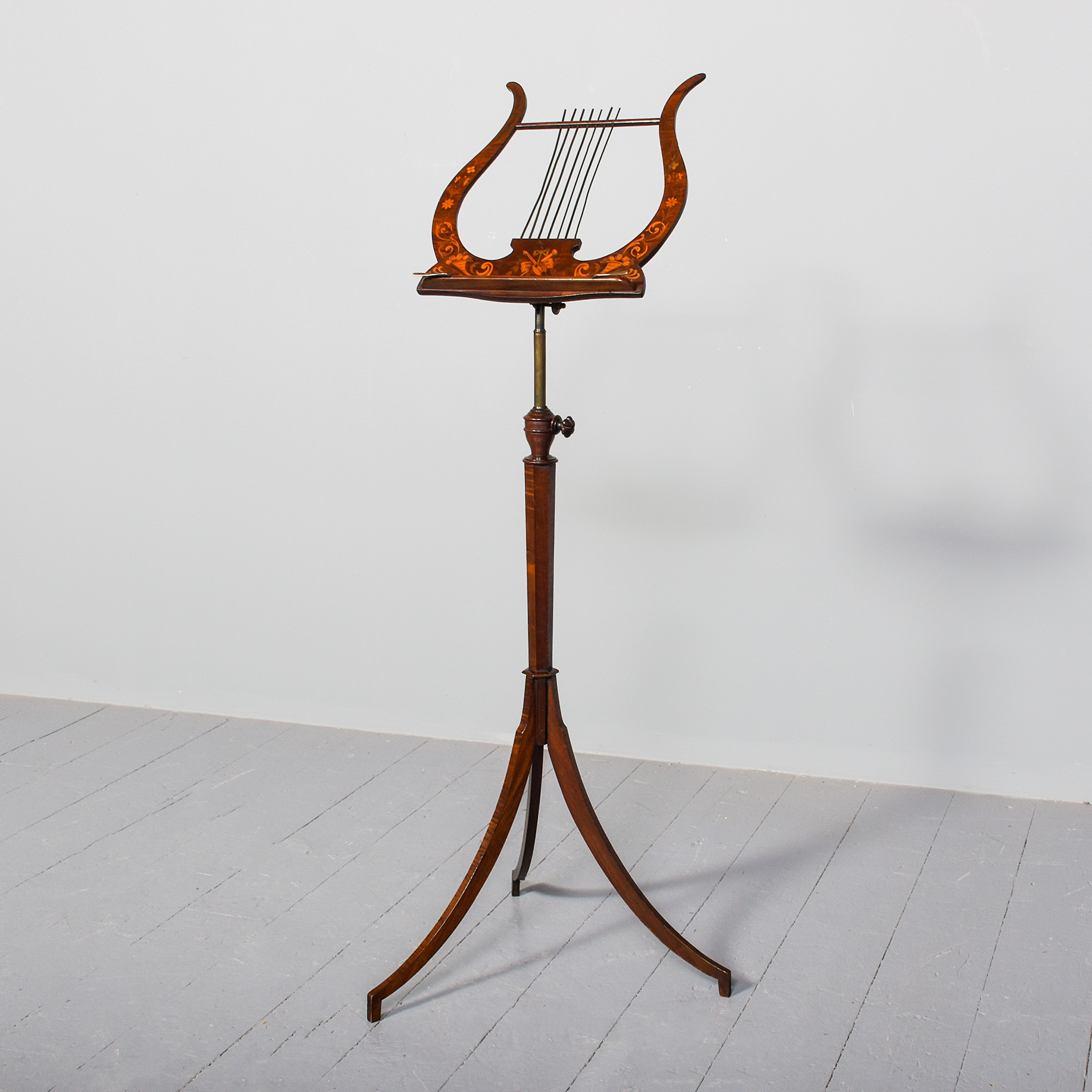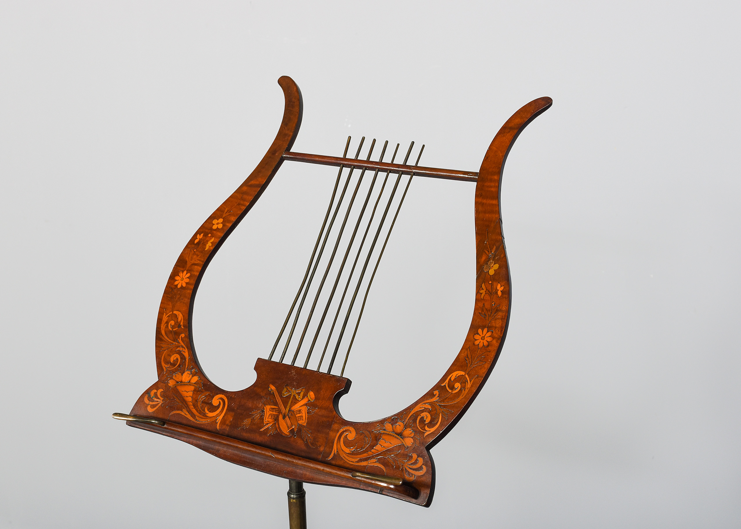 Circa 1880. Mahogany inlaid large, shaped music stand, the Lyre-shaped top with floral marquetry inlay with a cross rail supporting seven brass rods with a small ledge and adjustable brass bars for holding the sheet music in place, supported on an adjustable brass upright, resting on a chamfered stem issuing three low sabre legs.