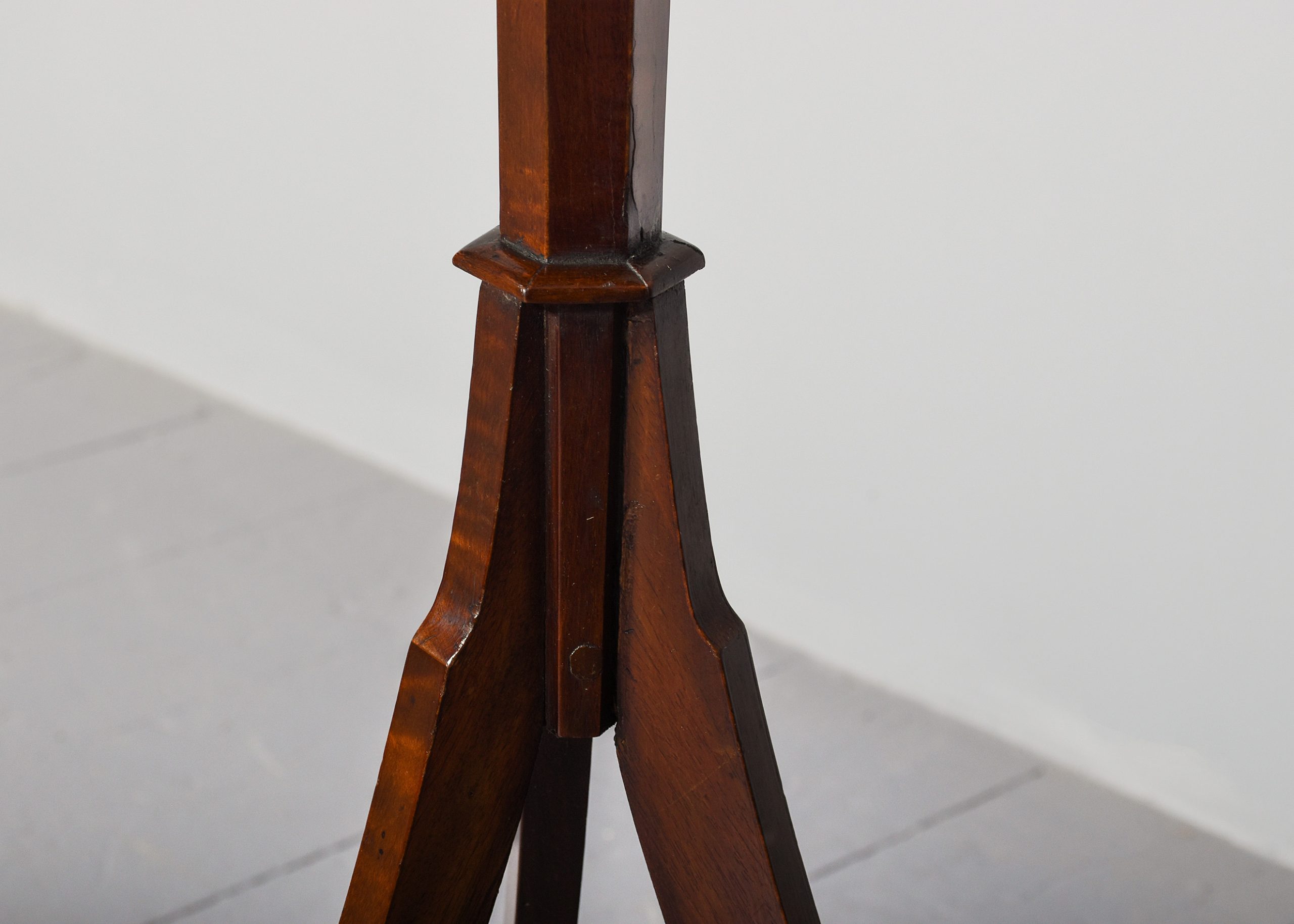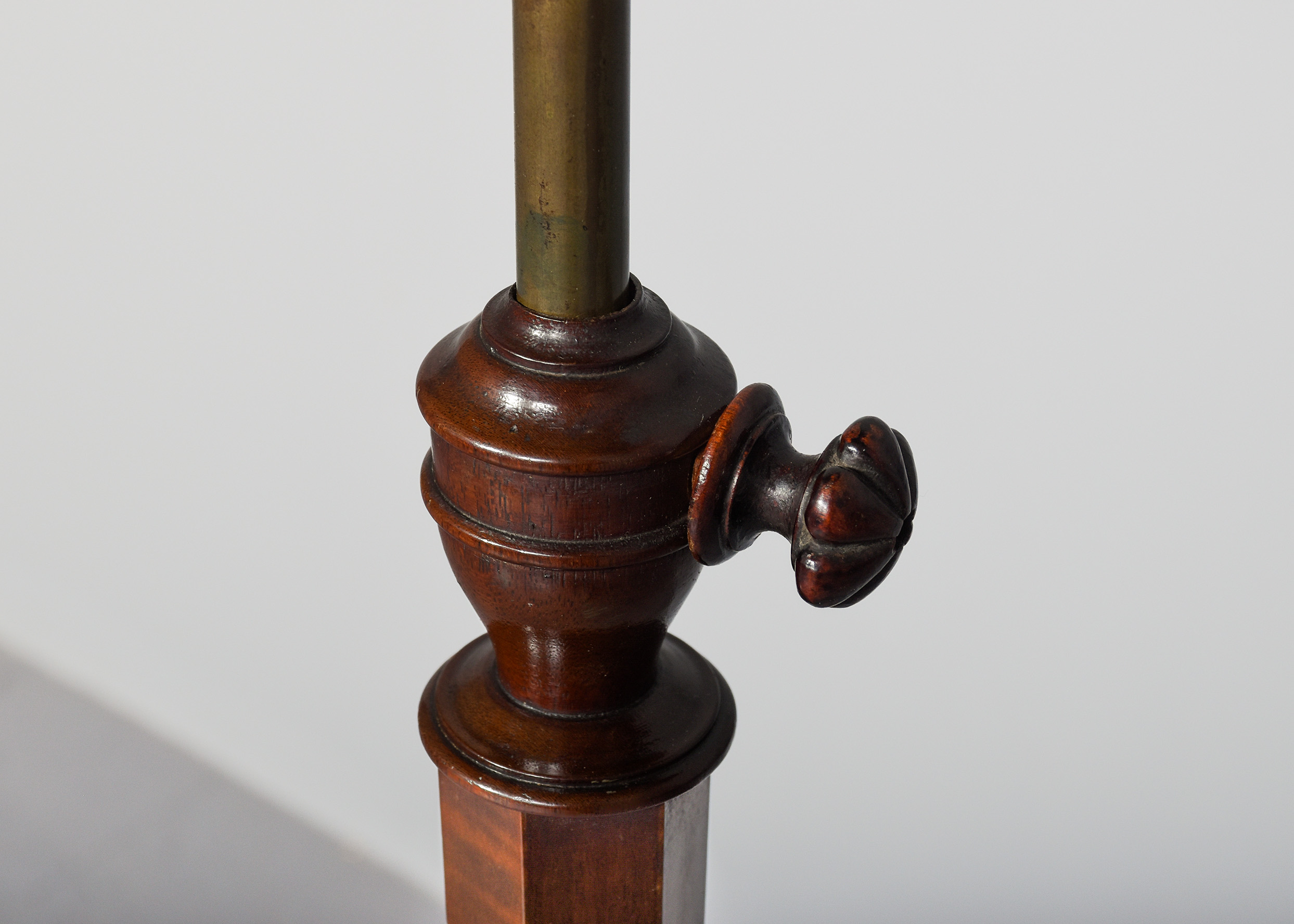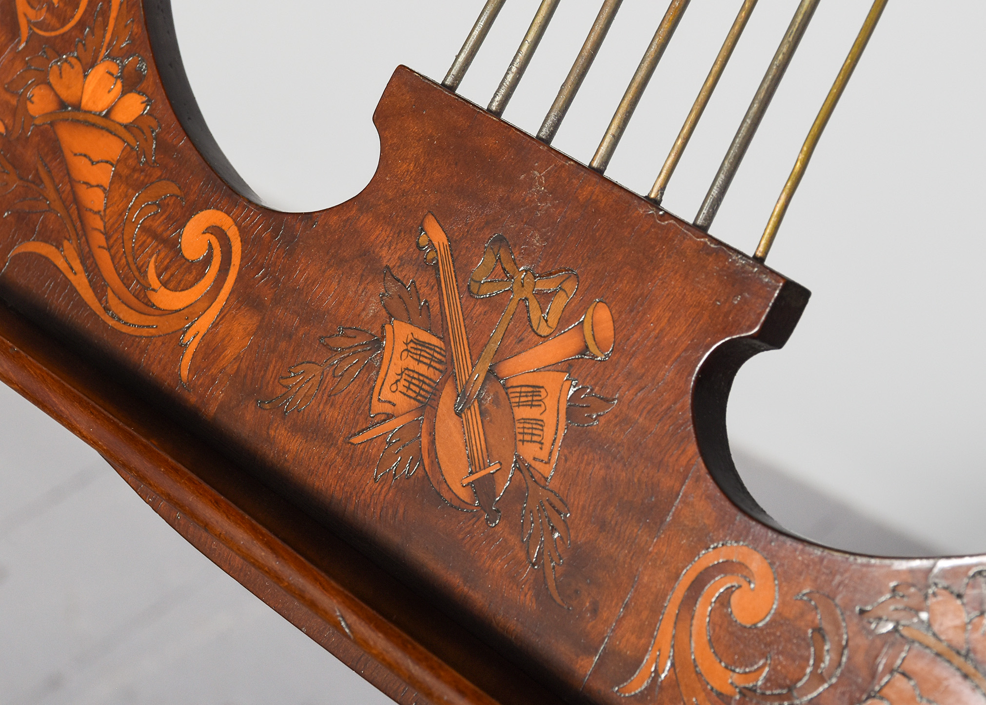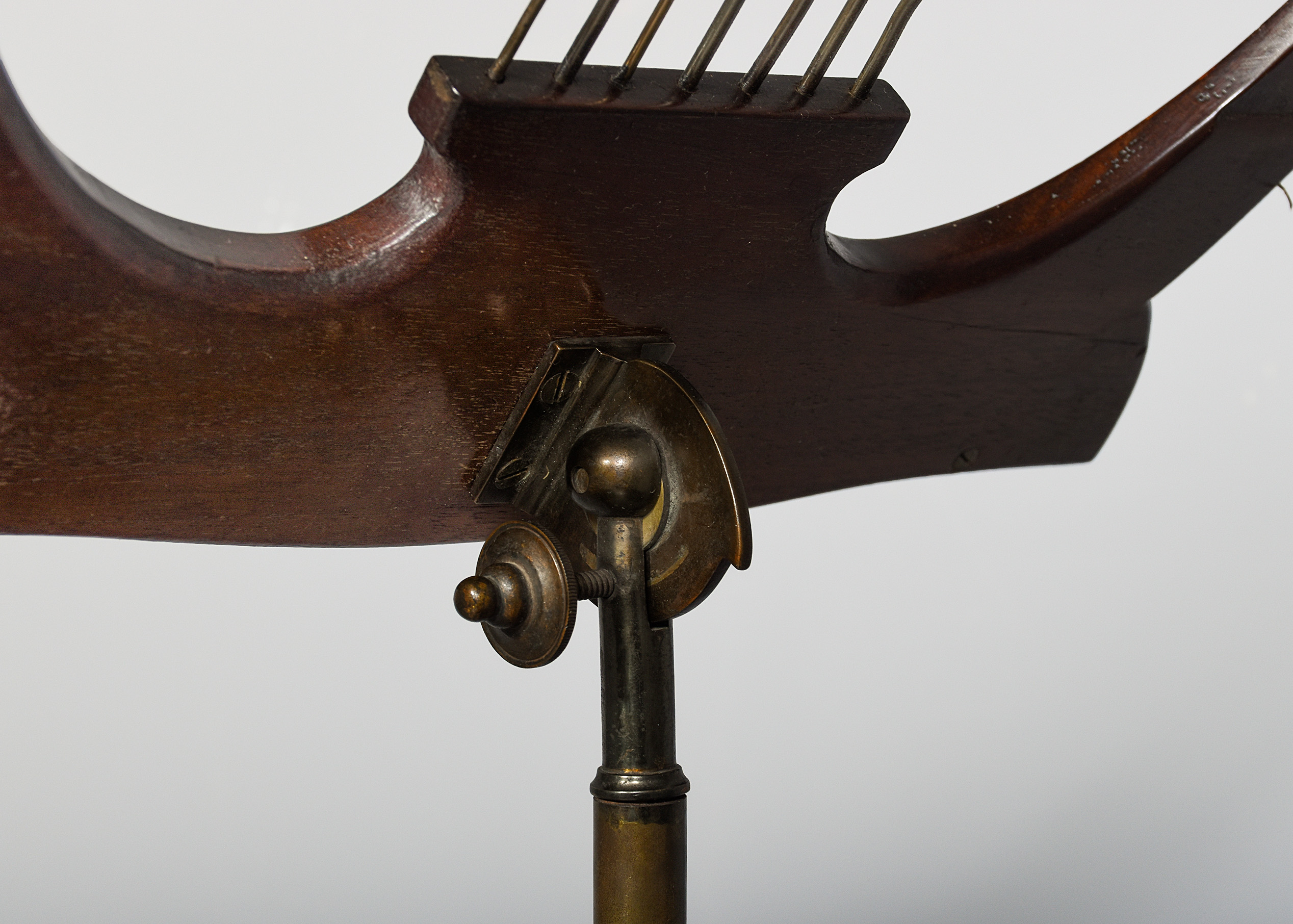 Circa 1880. Mahogany inlaid large, shaped music stand, the Lyre-shaped top with floral marquetry inlay with a cross rail supporting seven brass rods with a small ledge and adjustable brass bars for holding the sheet music in place, supported on an adjustable brass upright, resting on a chamfered stem issuing three low sabre legs.