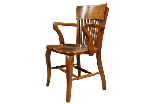 A fine early 20th-century mahogany desk chair, dating from around 1900, showcasing elegant proportions and rich colour throughout. The chair features a shaped top rail above a vertical slatted back, offering both visual lightness and good support. Gracefully curved arms flow into the front supports, complementing the cabriole-style legs and reinforcing the chair’s refined silhouette.