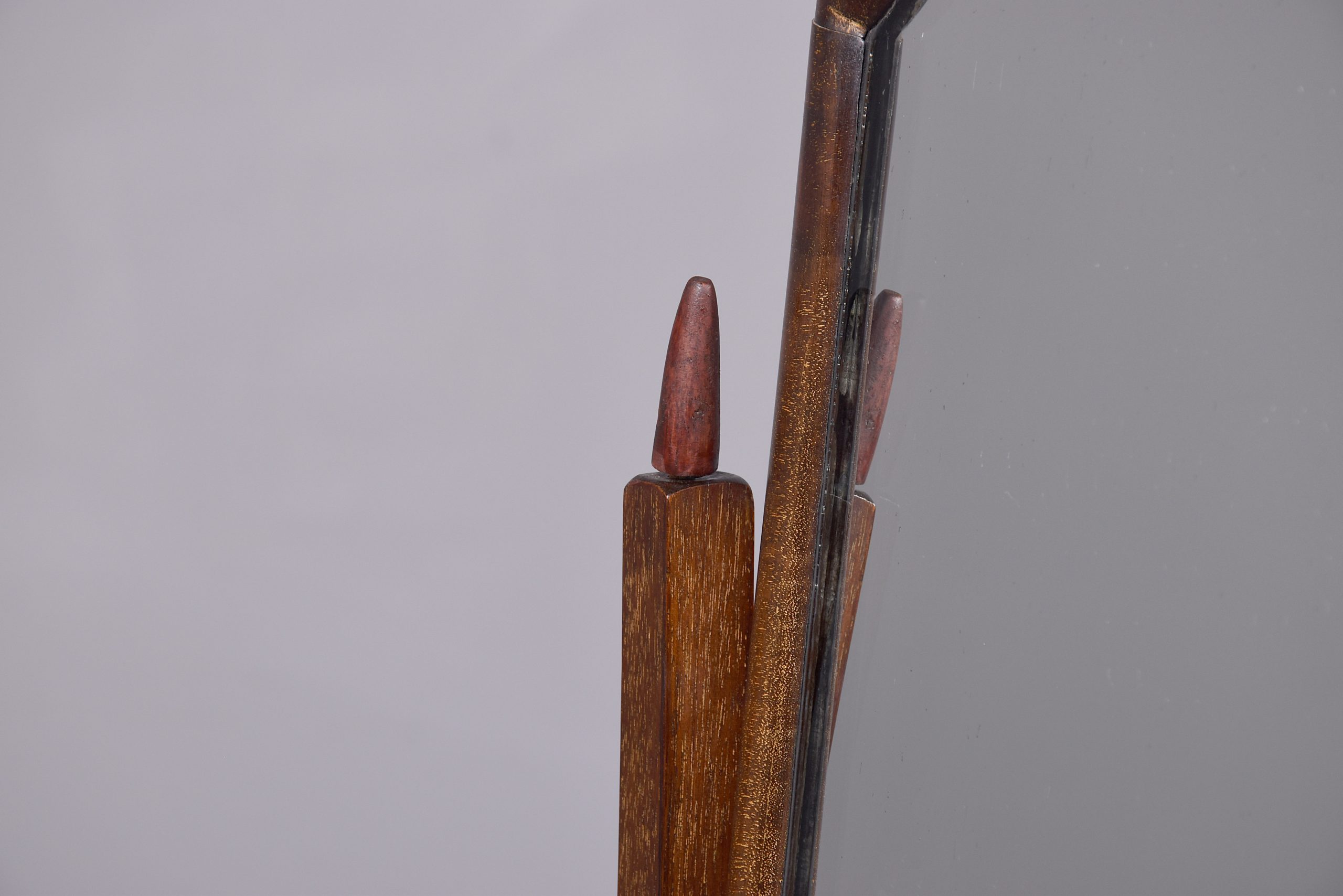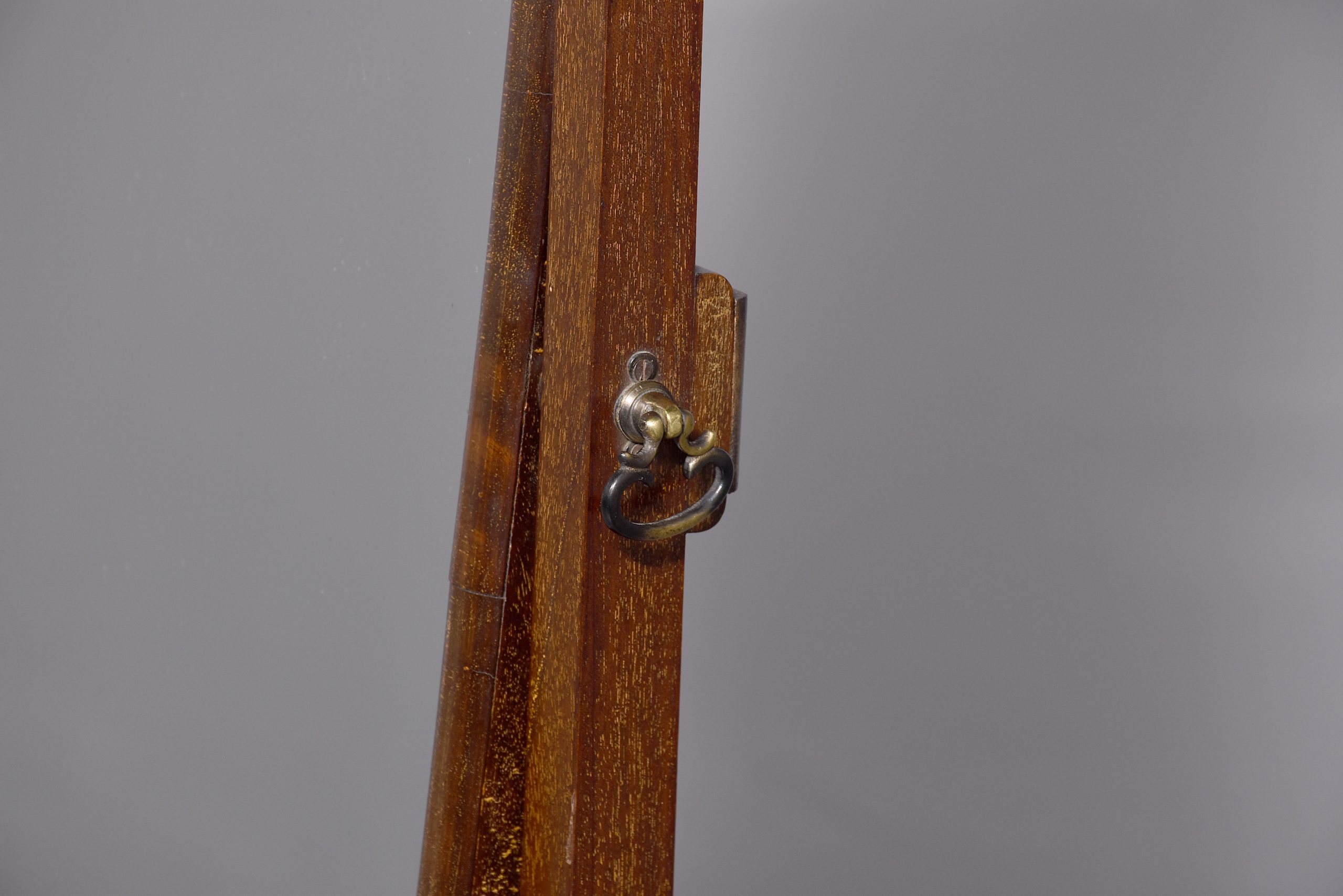 Circa 1930s. A Queen Anne style mahogany framed cheval mirror, the stylish shaped frame with rounded fore-edge, the mirror held in place by two tapering uprights surmounted by very elegant urn shaped finials, the frame held in position by a pair of cast brass axe-head drops, beneath the mirror is a shaped stretcher bracing the two uprights, all resting on four downward facing cabriole legs.