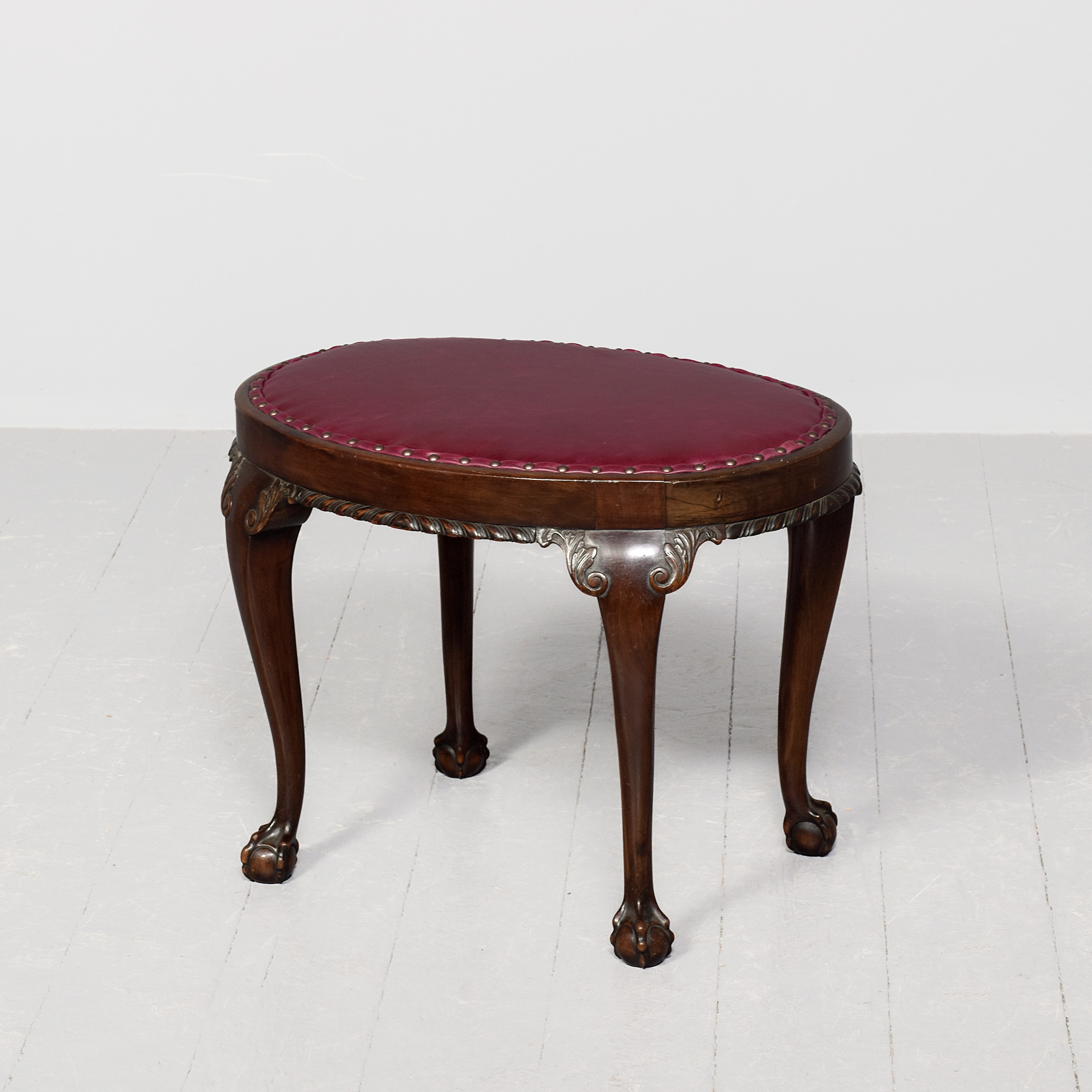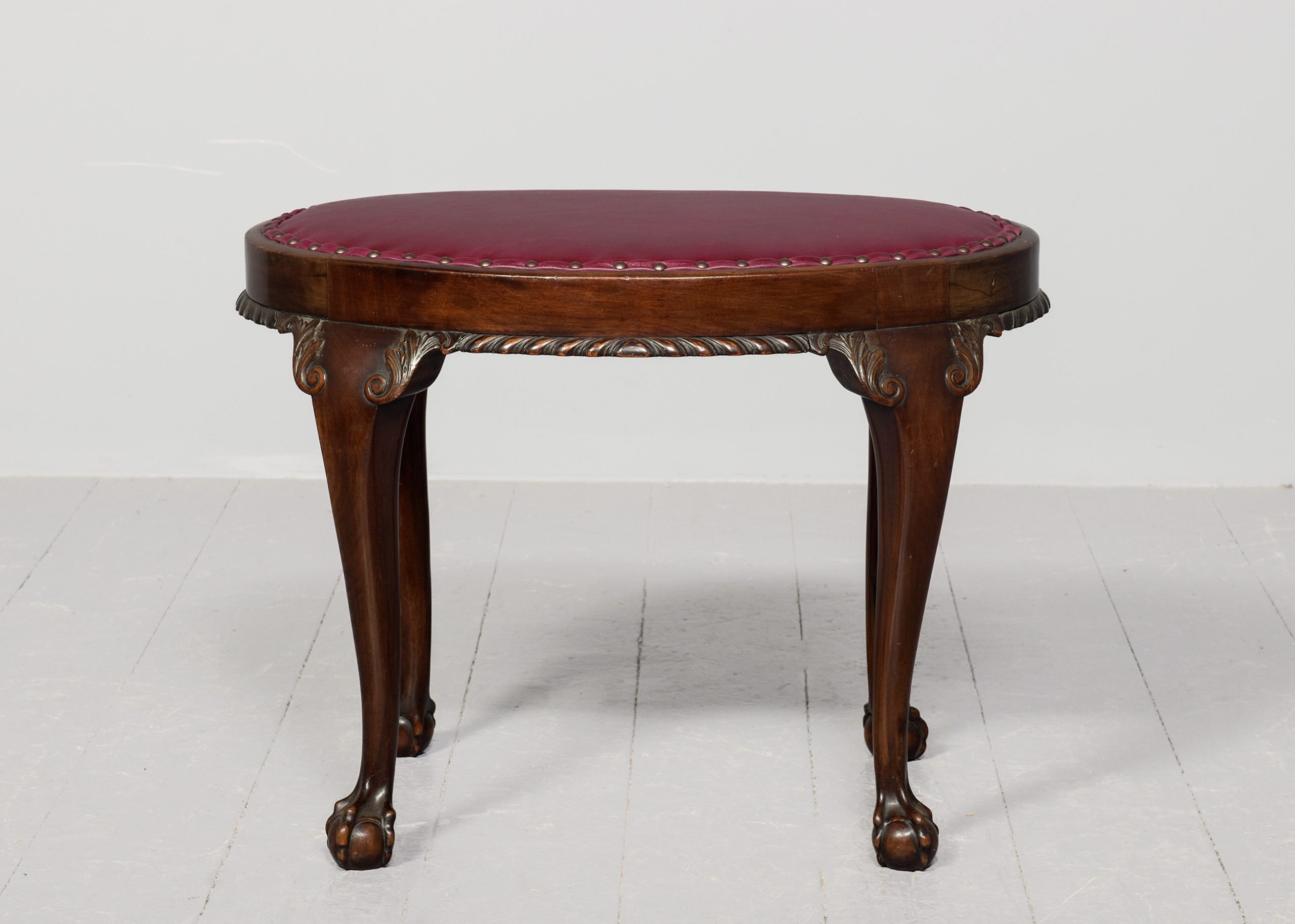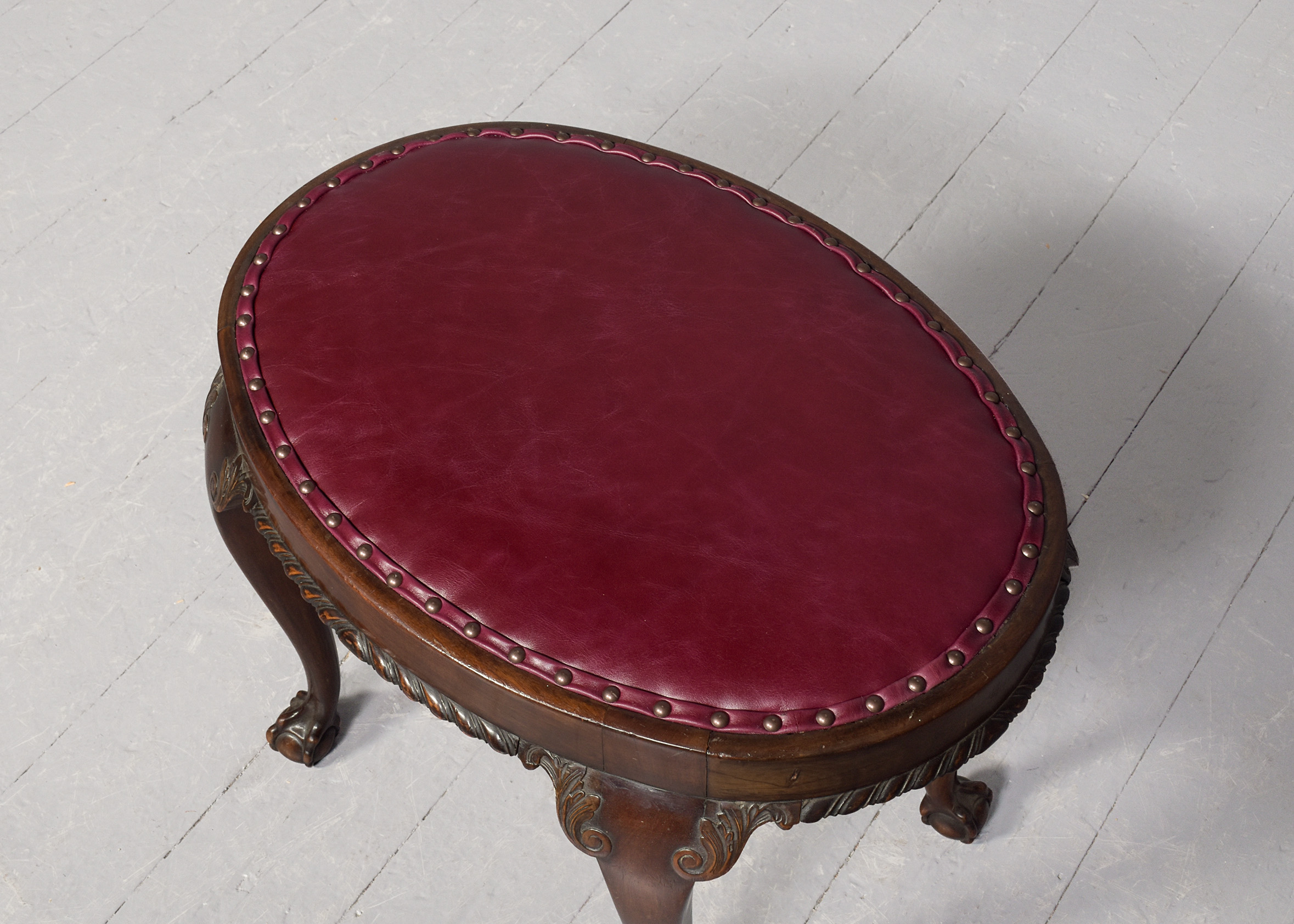 Circa 1930. Mahogany oval Chippendale-style footstool. The top is upholstered in a quality burgundy hide with brass studding, with a moulded seat rail and gadroon carved frieze supported on cabriole legs with acanthus carved knees and deeply carved ball and claw feet. Bearing label “Robson Cabinetmakers, Newcastle”.