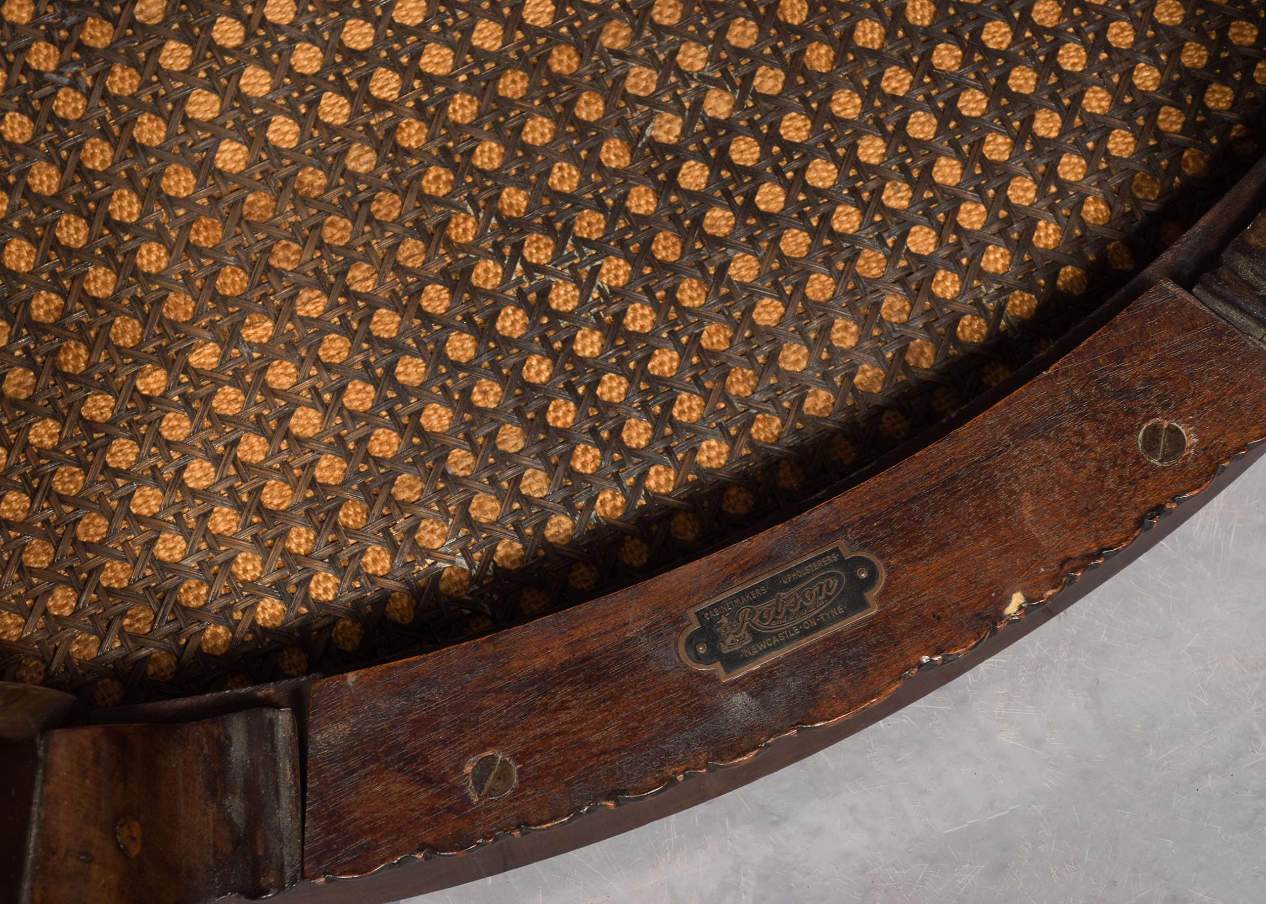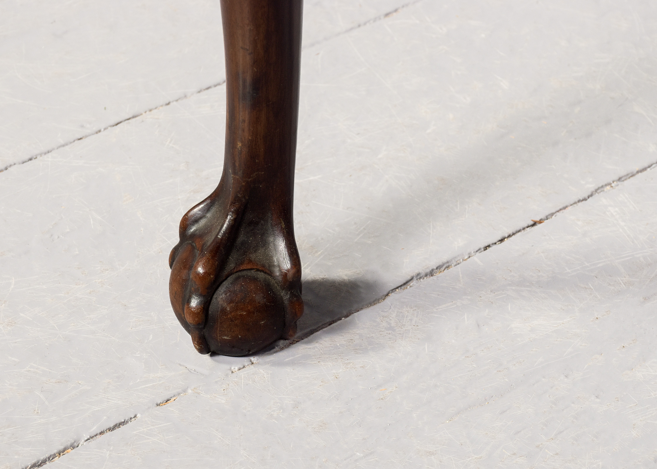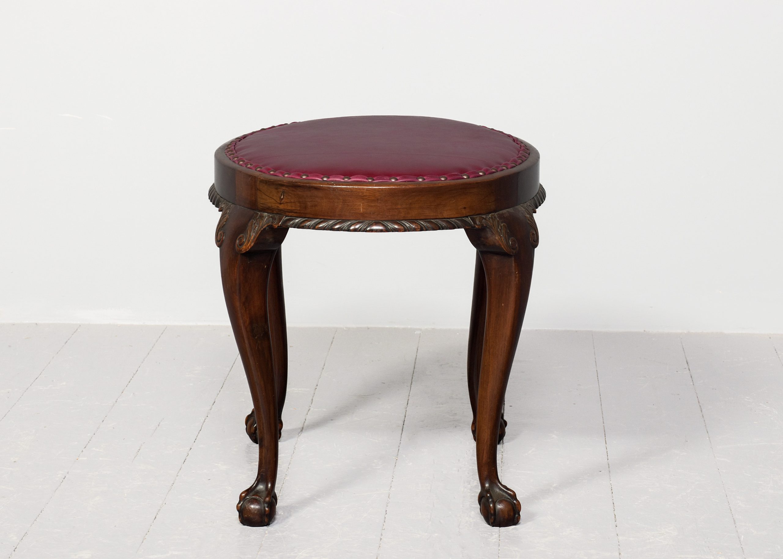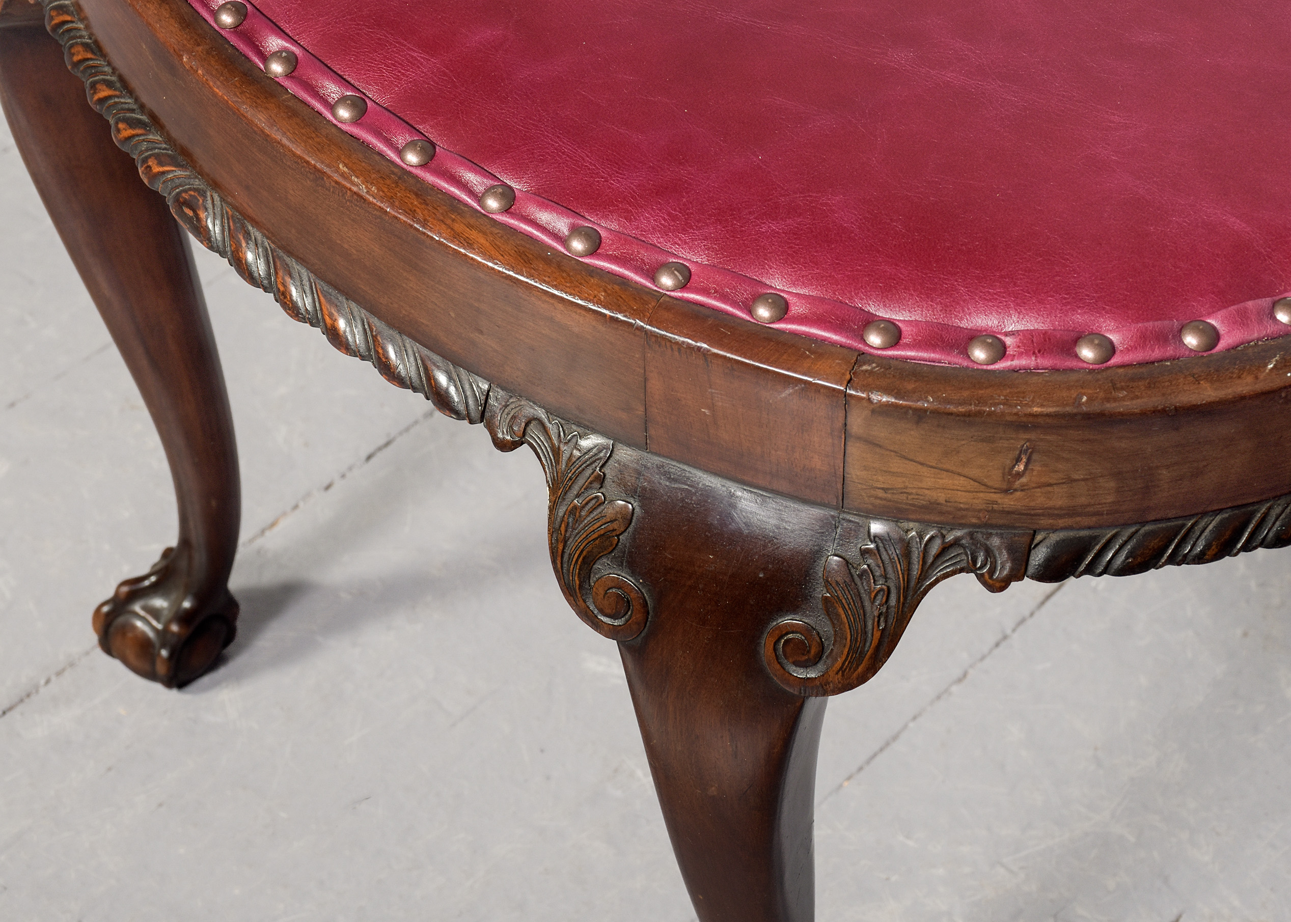 Circa 1930. Mahogany oval Chippendale-style footstool. The top is upholstered in a quality burgundy hide with brass studding, with a moulded seat rail and gadroon carved frieze supported on cabriole legs with acanthus carved knees and deeply carved ball and claw feet. Bearing label “Robson Cabinetmakers, Newcastle”.