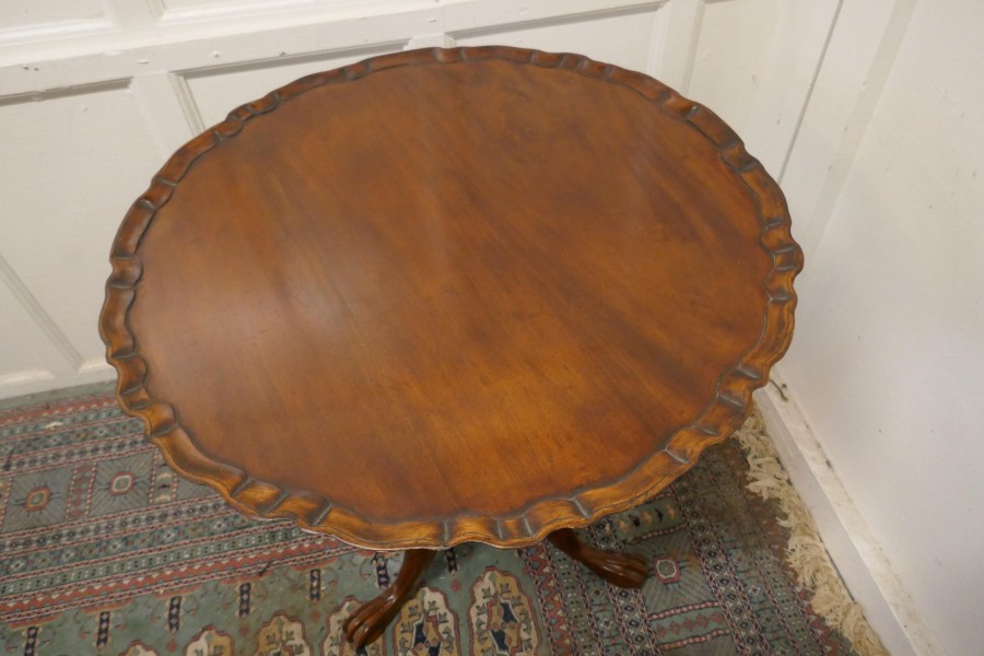 Mahogany tilt top table, bird cage wine table This lovely table stands on a three footed ball and claw base carved with acanthus leaves at the knees and has a attractive turned centre leg, the leg supports a swivelling mechanism known as a “bird cage” The mahogany top is larger then most and has a very attractive ribbon carved edge, it tilts and swivels easily, this top is removable if required The table is in good condition with a very pretty patina The table stands 30” high and it is 28” in diameter TNV203. Manufacture Date : 1950 Materials : Mahogany