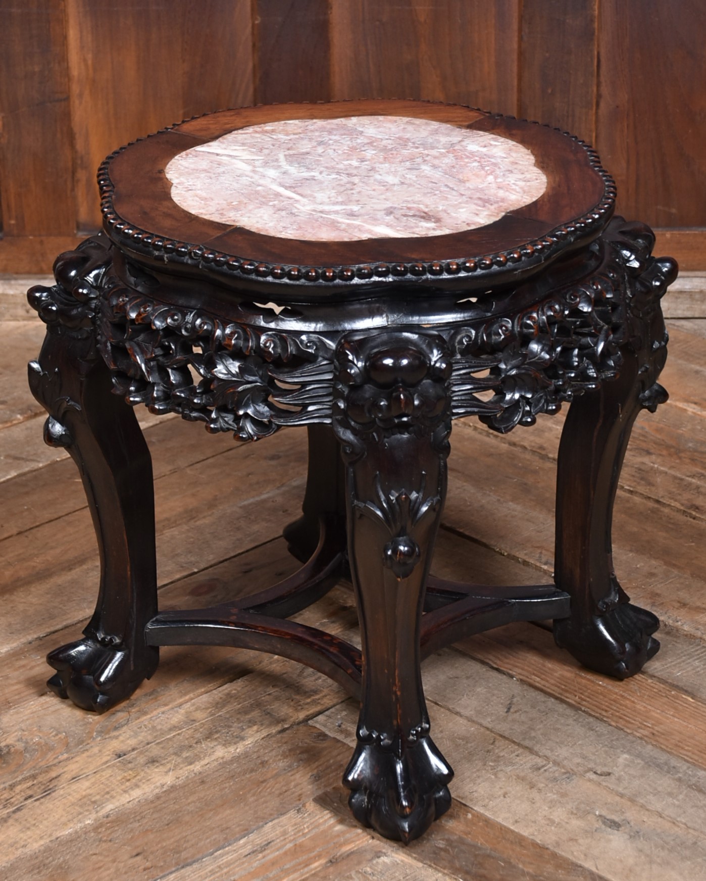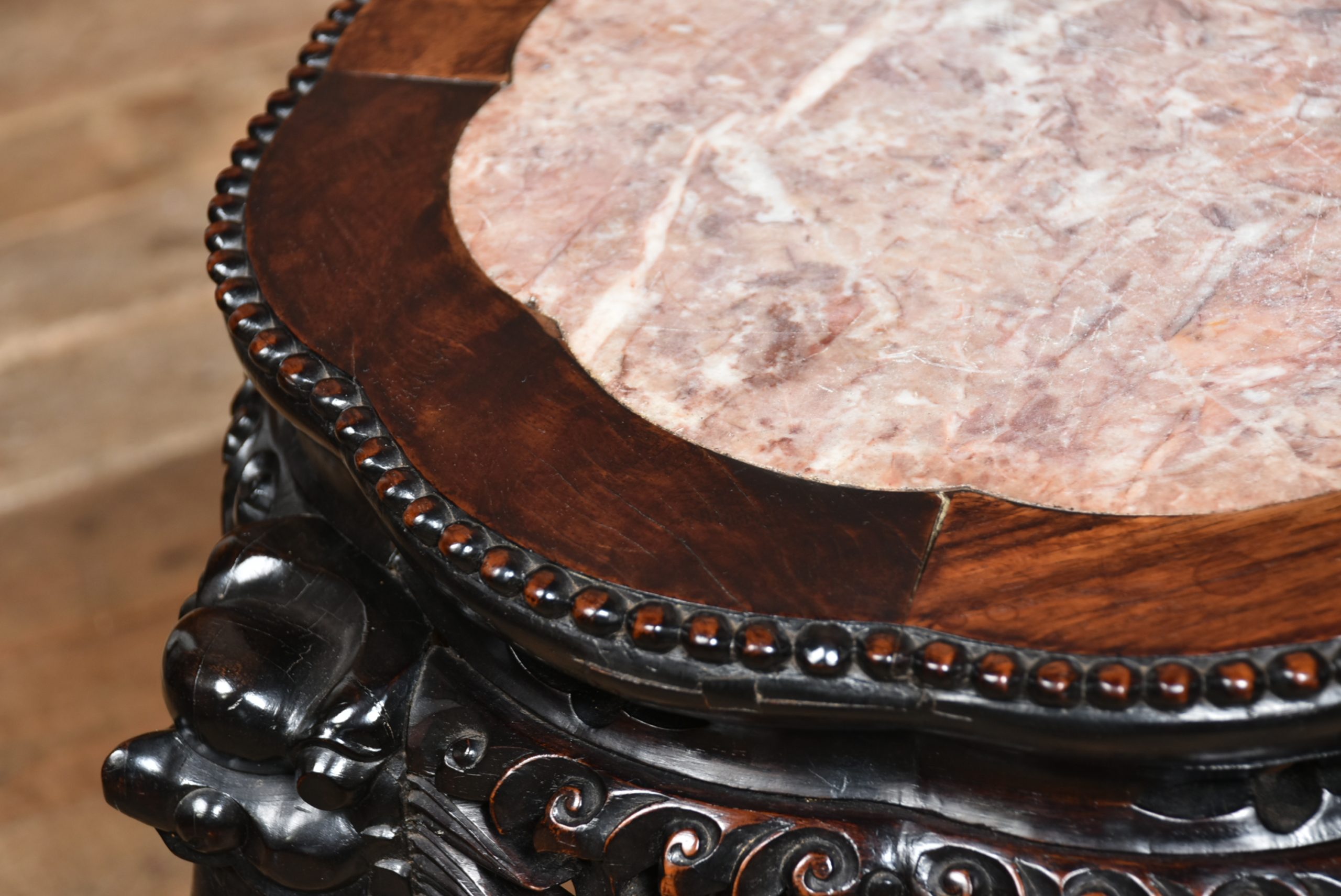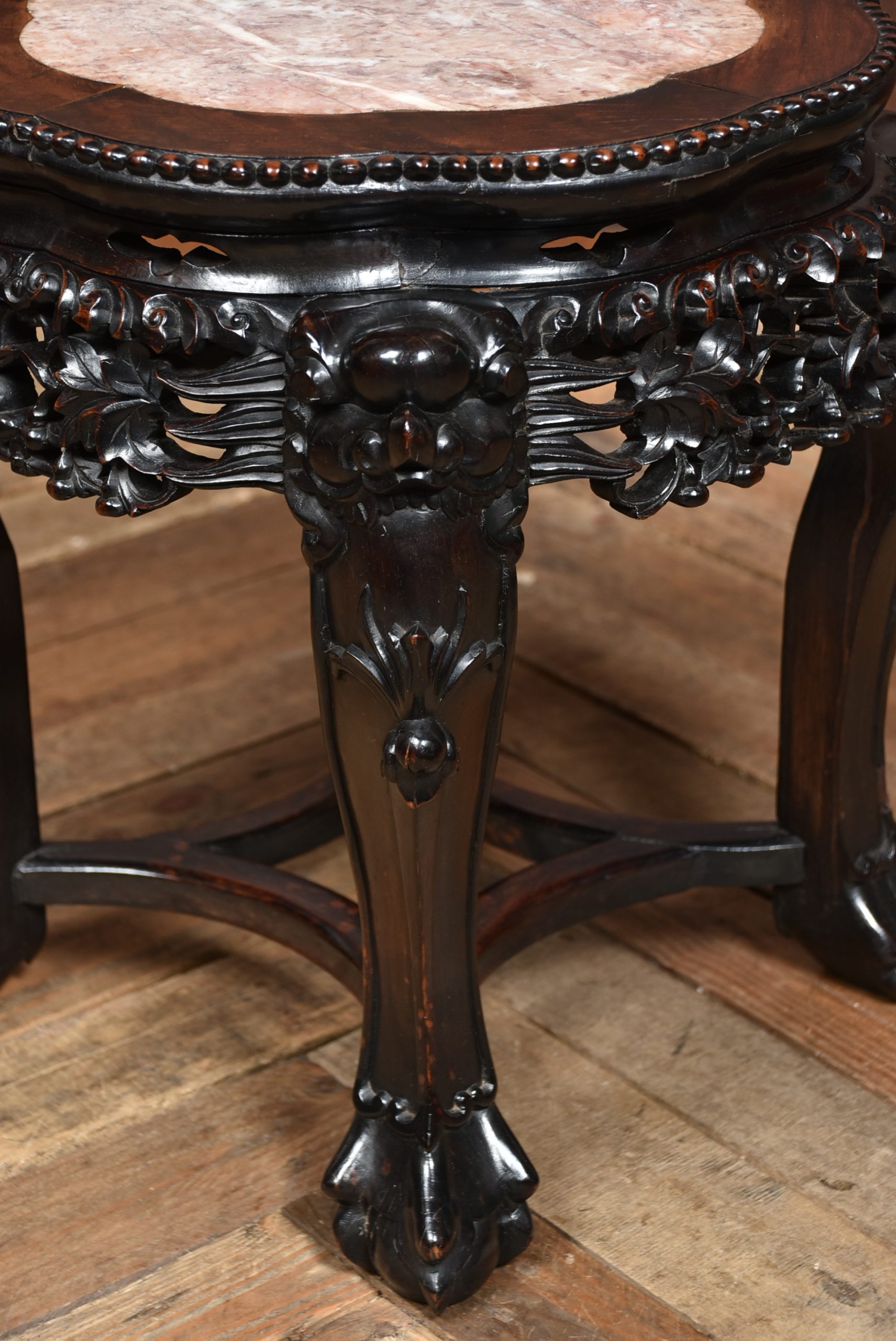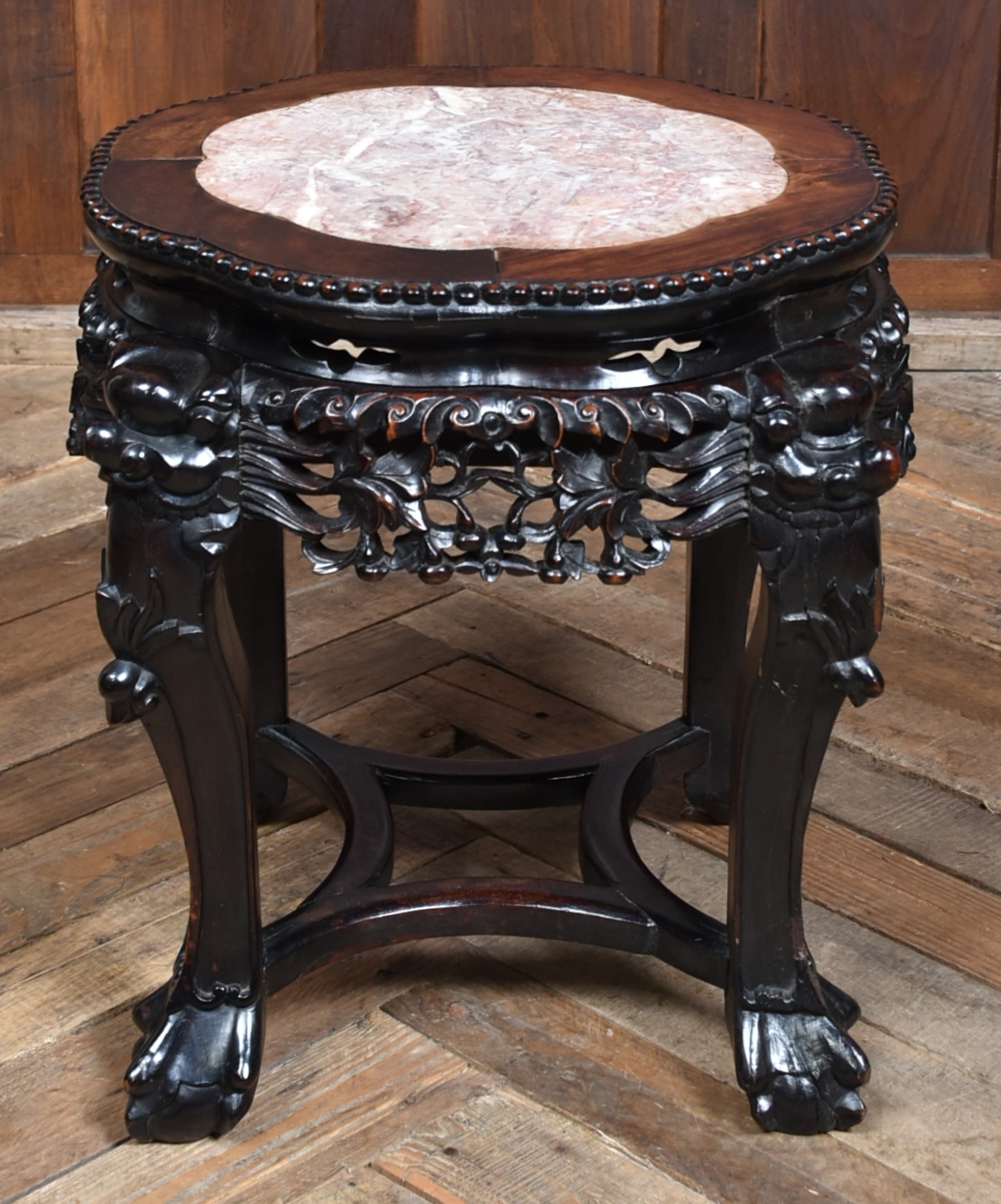 A superb 19th century Chinese plant stands or lamp tables, beautifully crafted in solid hardwood in excellent antique condition. The top features a petal-shaped top with a finely carved beaded edge, inset with beautifully variegated pink marble inserts that echo the organic form of the design. Beneath the top, the shaped apron is enriched with a deeply carved foliated frieze on all sides, showcasing exceptional carving skill and lively decorative rhythm. Raised on four shapely leg with faces at the top leading down to claw and ball feet united by an interlocking cross stretcher. With its rich colour, graceful form, and refined ornamentation, this versatile piece offer striking character and timeless elegance, whether used as accent tables, display stands, or statement pieces in any interior.