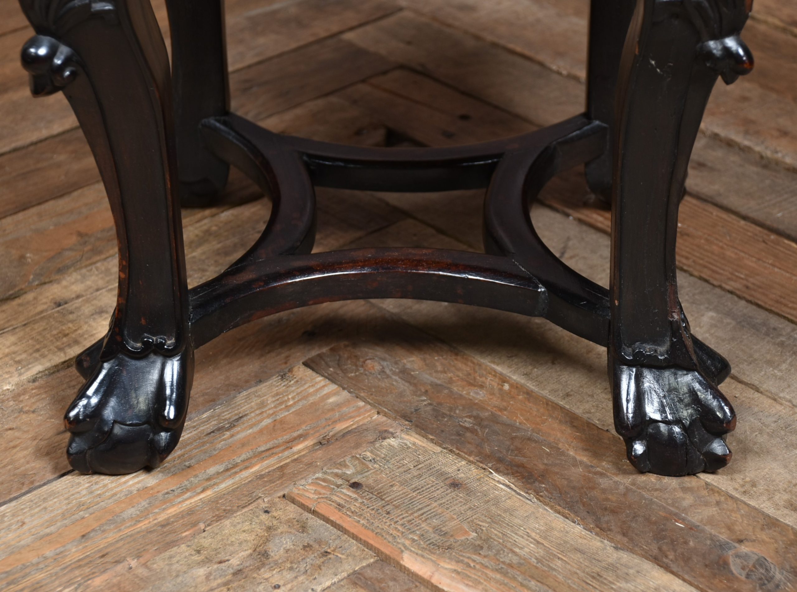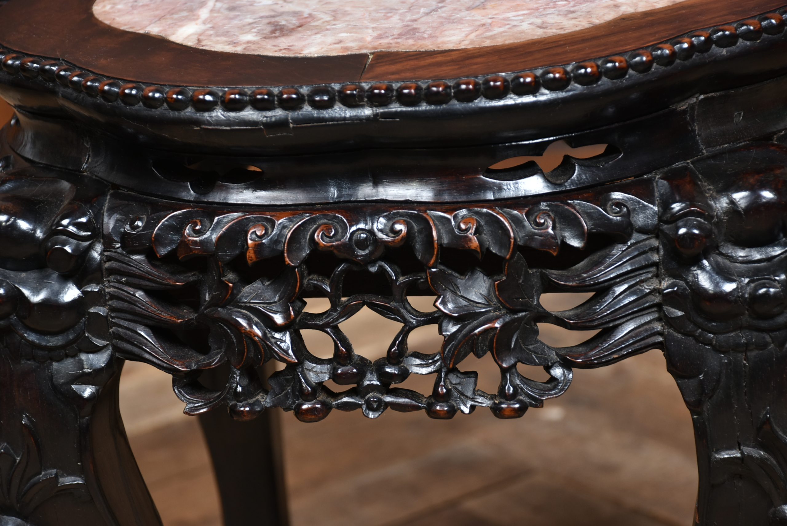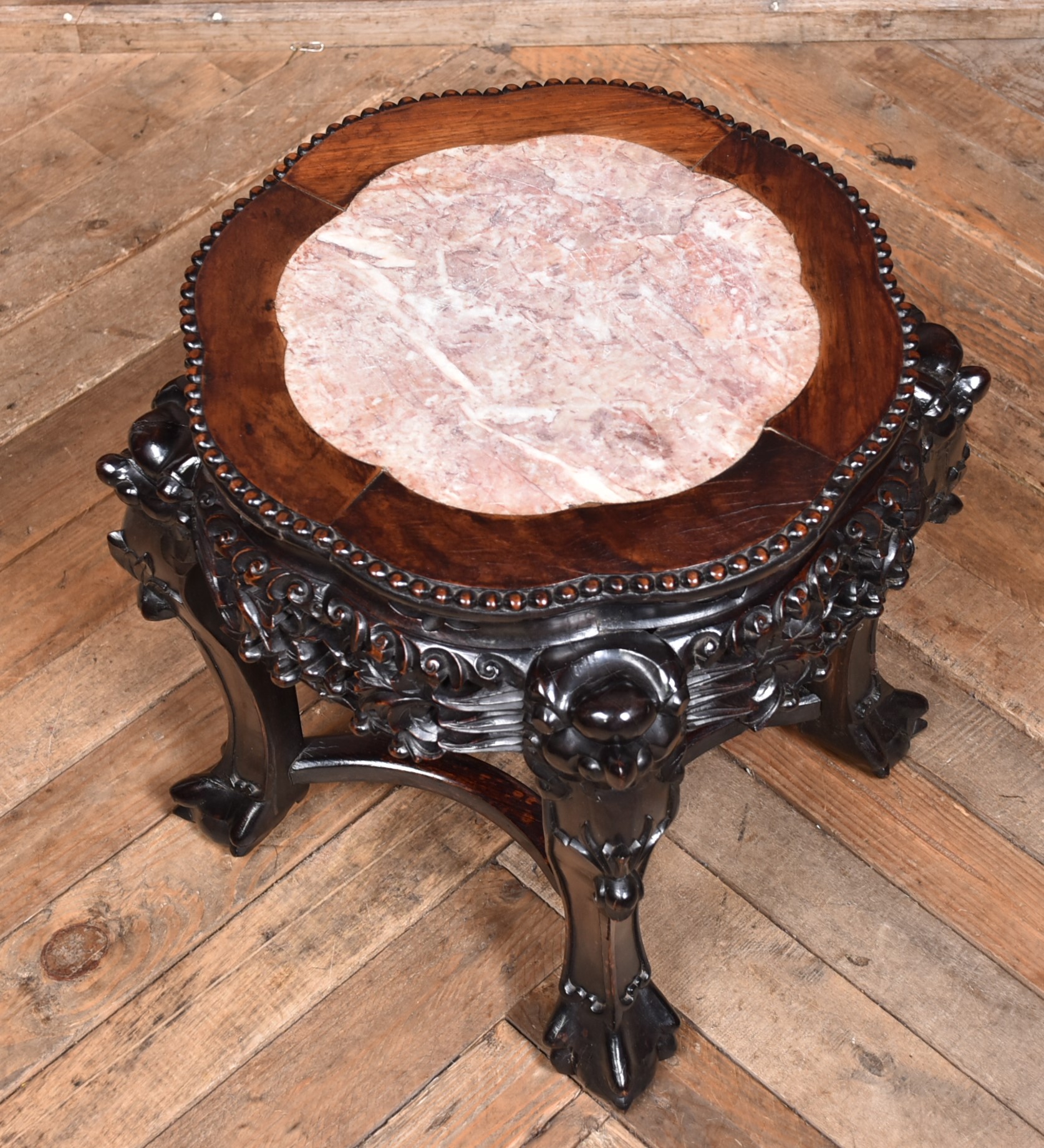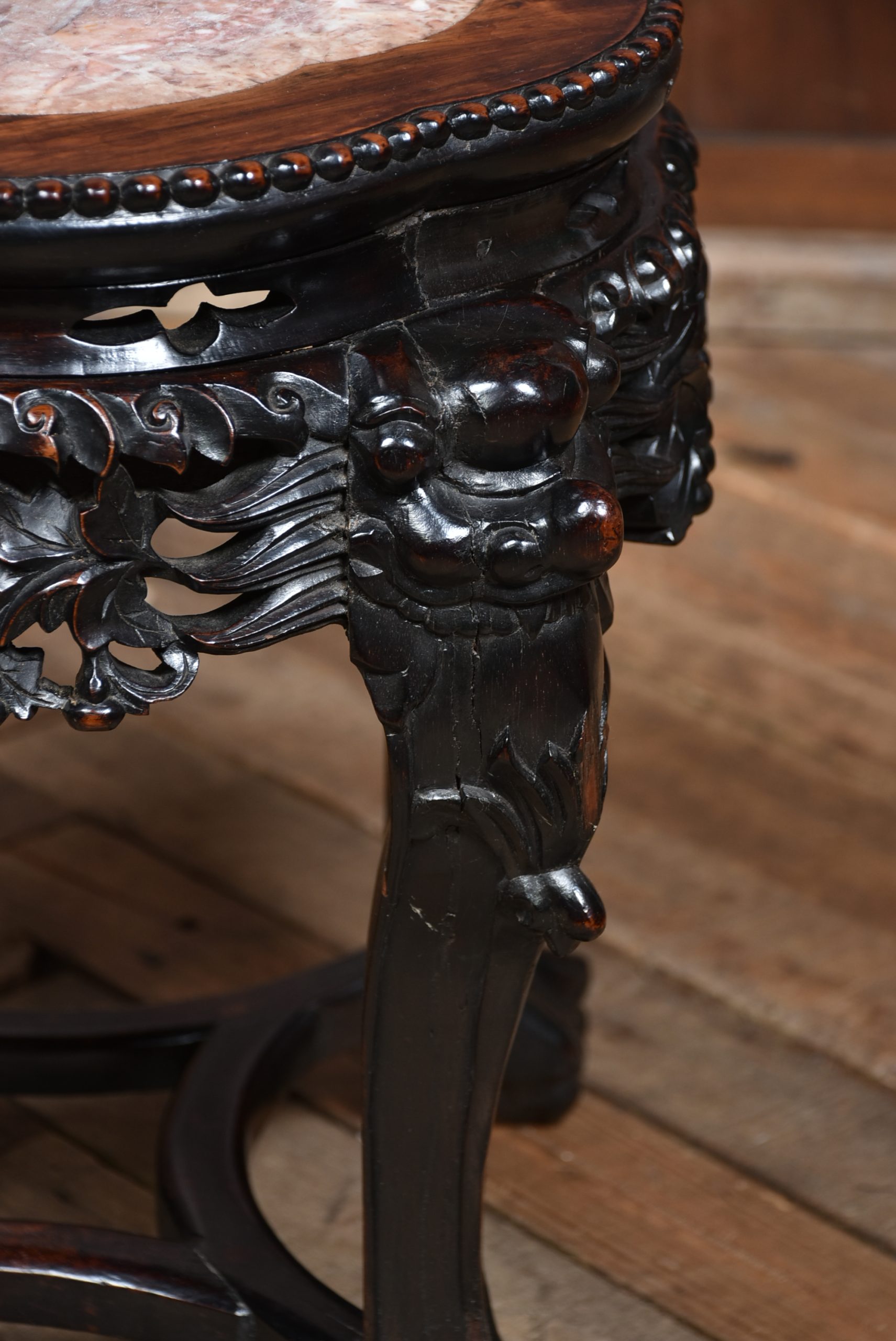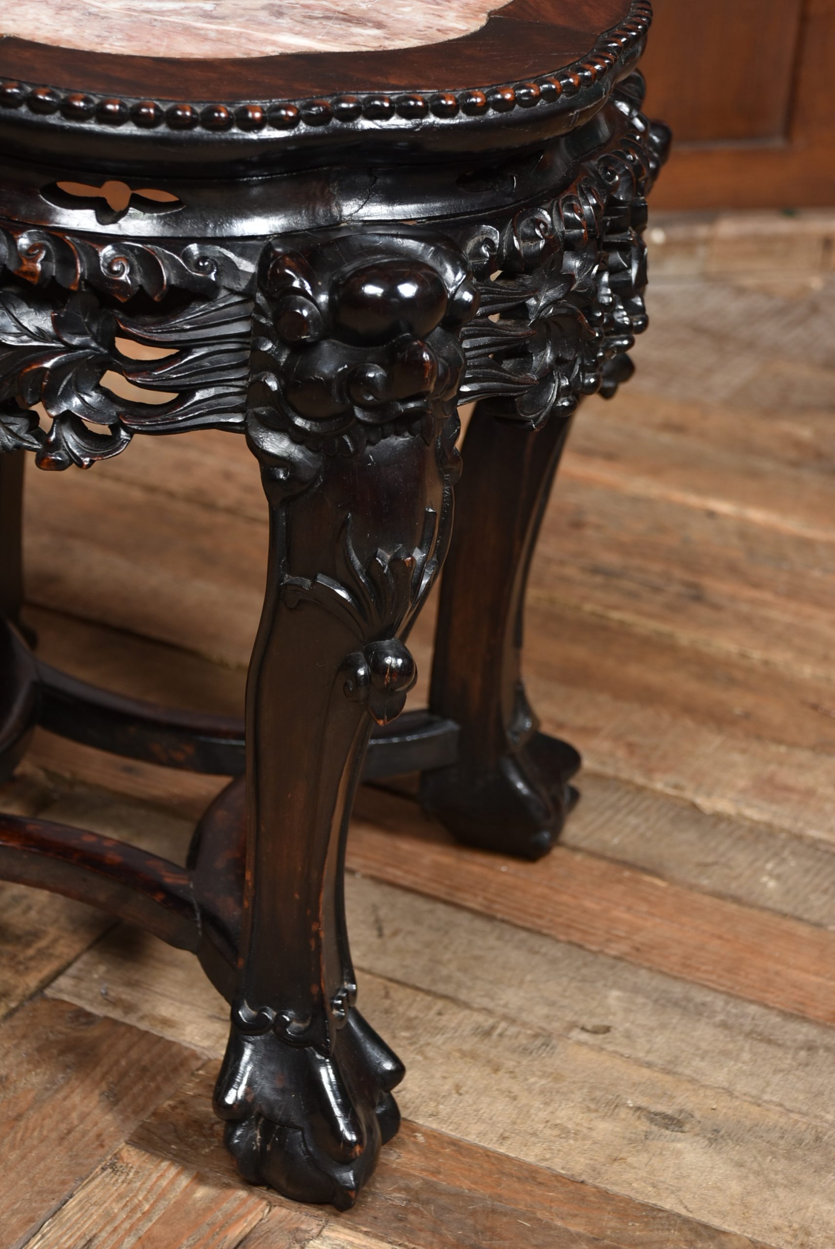 A superb 19th century Chinese plant stands or lamp tables, beautifully crafted in solid hardwood in excellent antique condition. The top features a petal-shaped top with a finely carved beaded edge, inset with beautifully variegated pink marble inserts that echo the organic form of the design. Beneath the top, the shaped apron is enriched with a deeply carved foliated frieze on all sides, showcasing exceptional carving skill and lively decorative rhythm. Raised on four shapely leg with faces at the top leading down to claw and ball feet united by an interlocking cross stretcher. With its rich colour, graceful form, and refined ornamentation, this versatile piece offer striking character and timeless elegance, whether used as accent tables, display stands, or statement pieces in any interior.