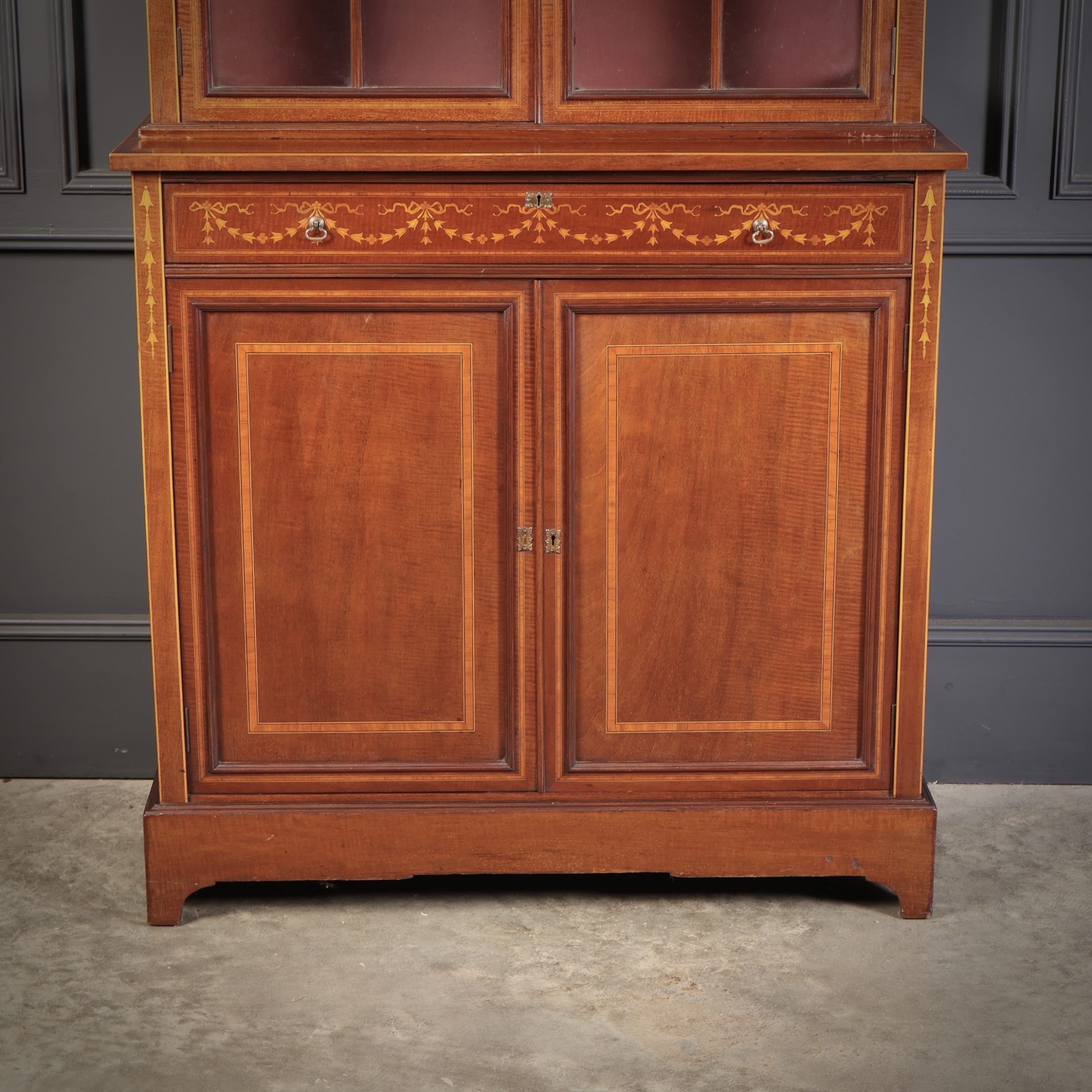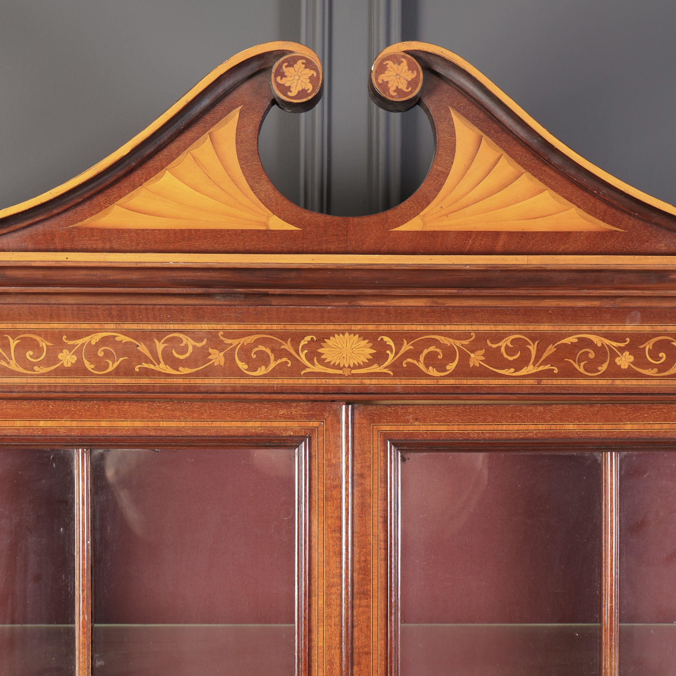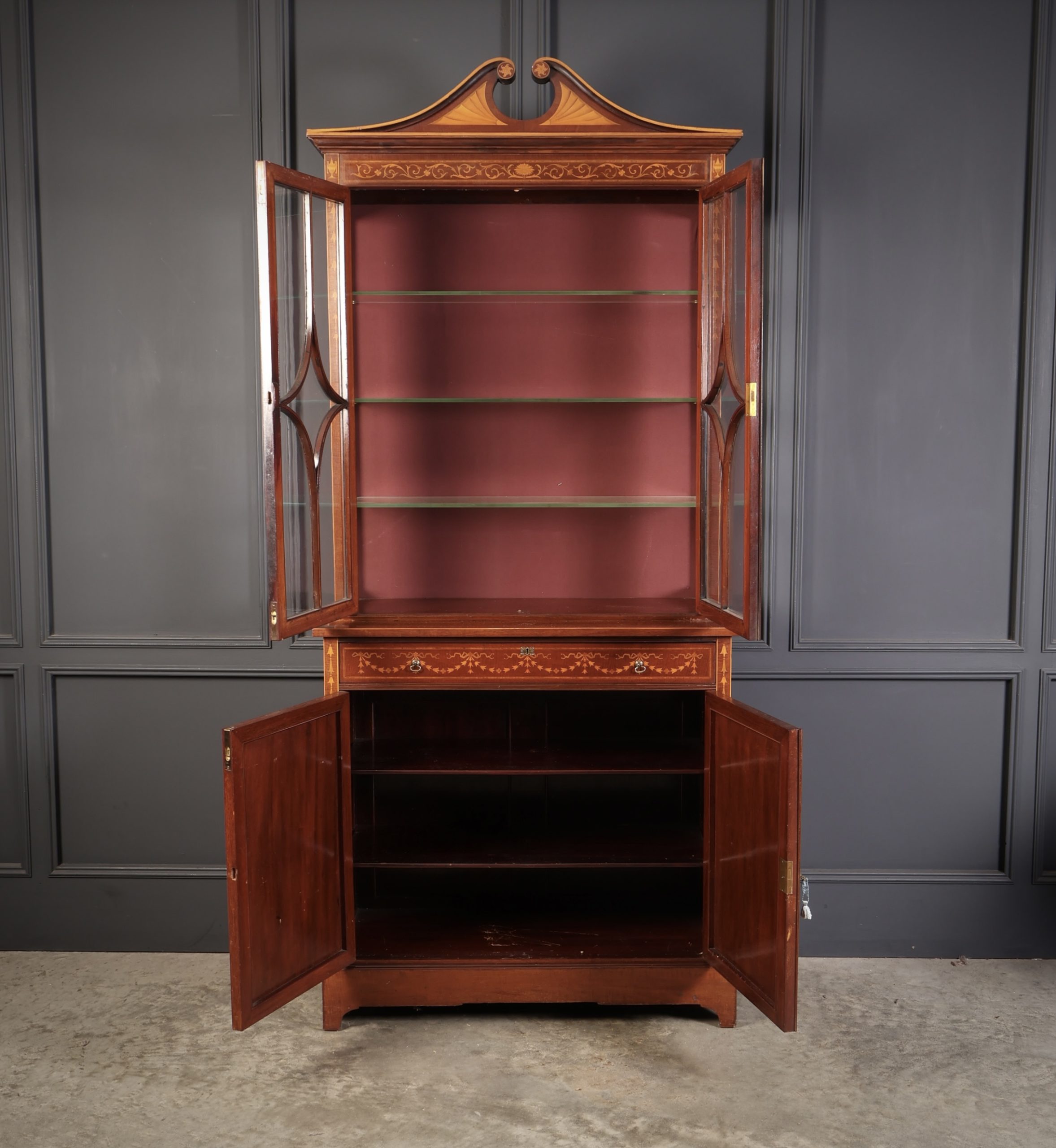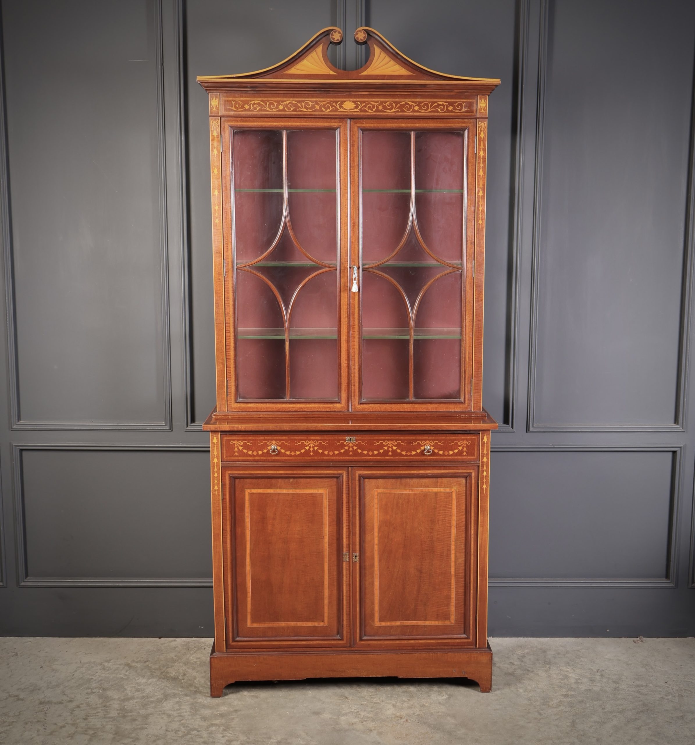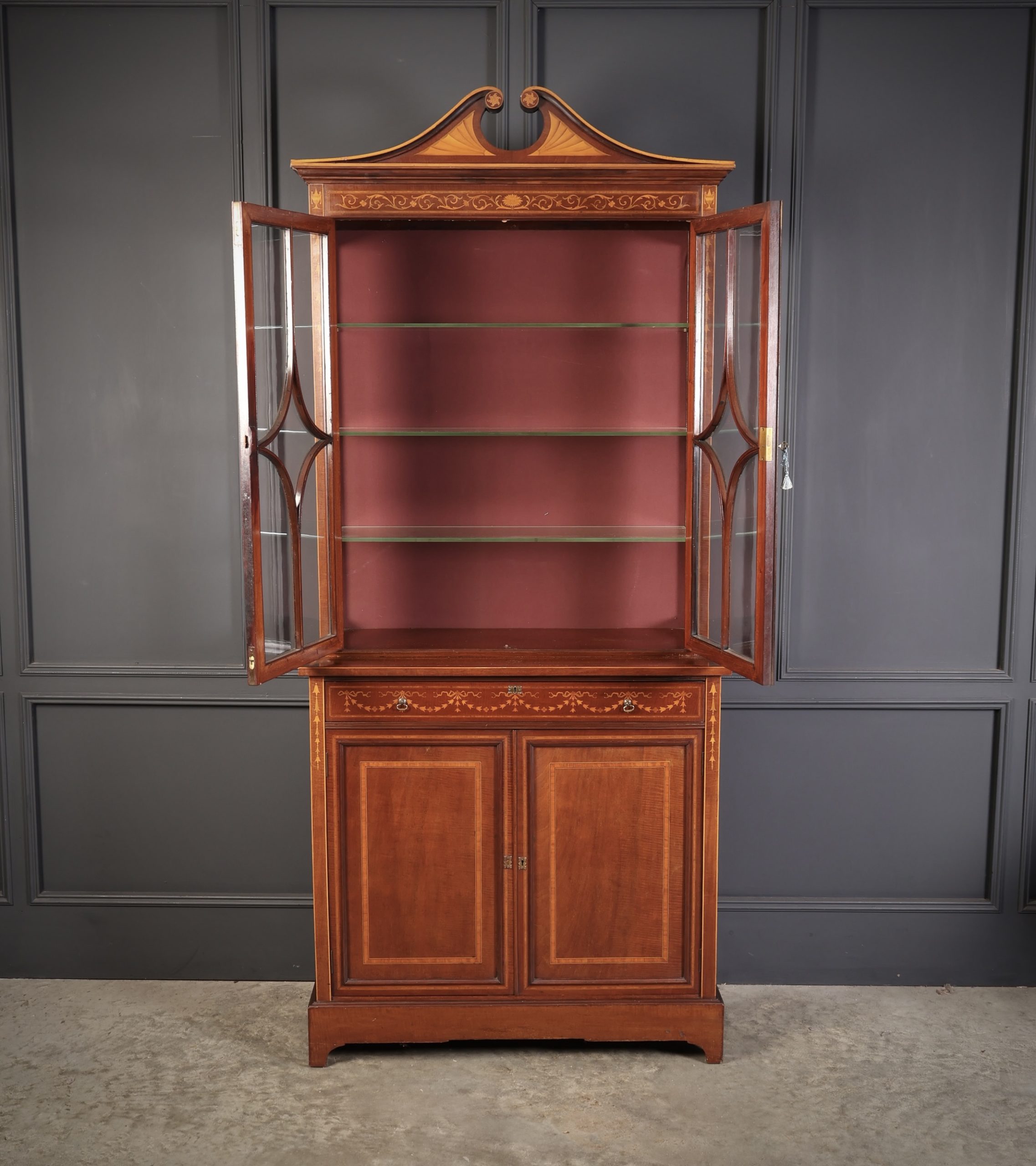 The upper section features a decorative pediment above 2 astragal glazed doors, opening to 3 glass shelves, ideal for display. Below, a beautifully inlaid frieze drawer sits above a pair of panelled cupboard doors, all decorated with delicate marquetry detail. Retaining its original locks and working key.