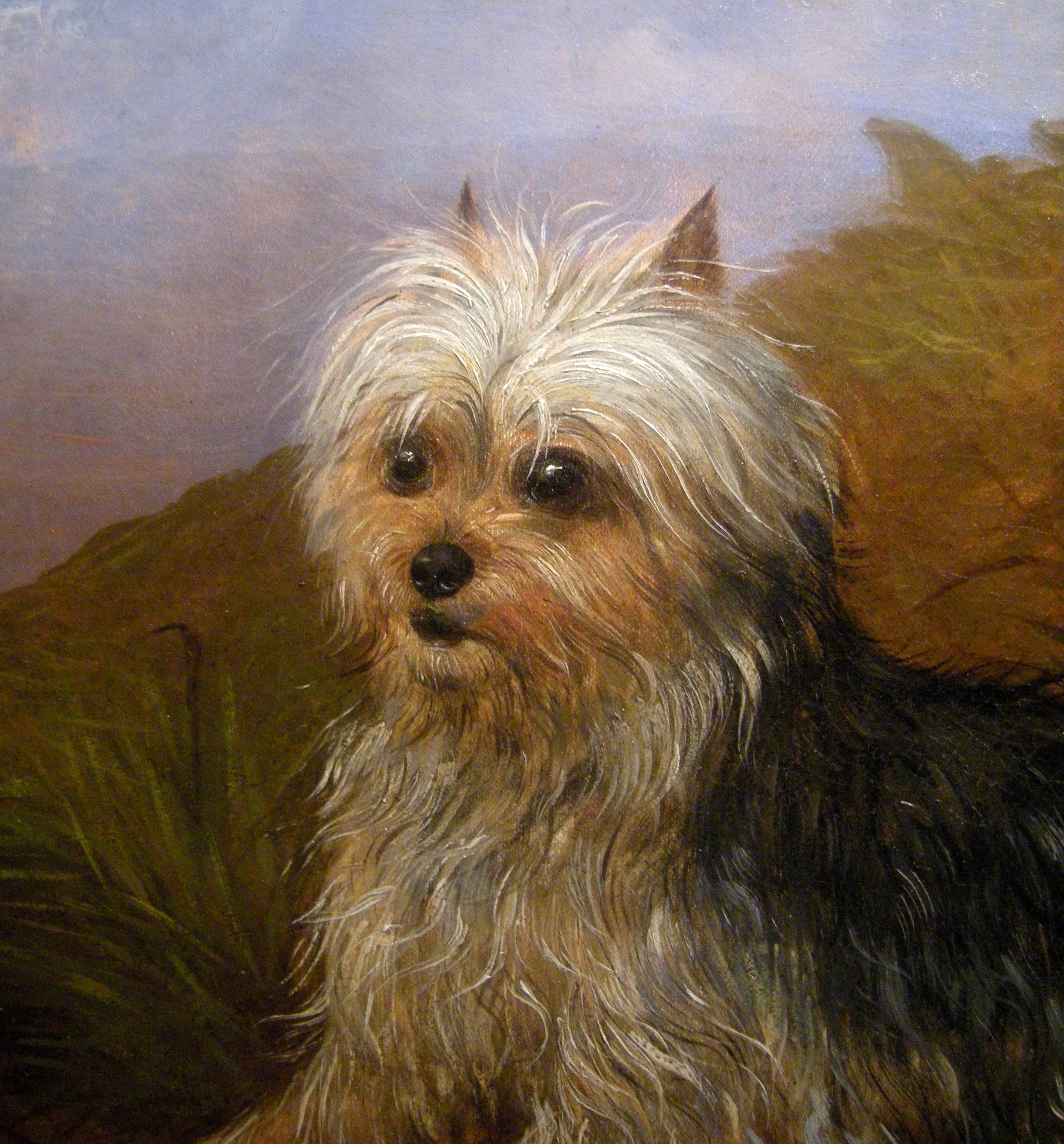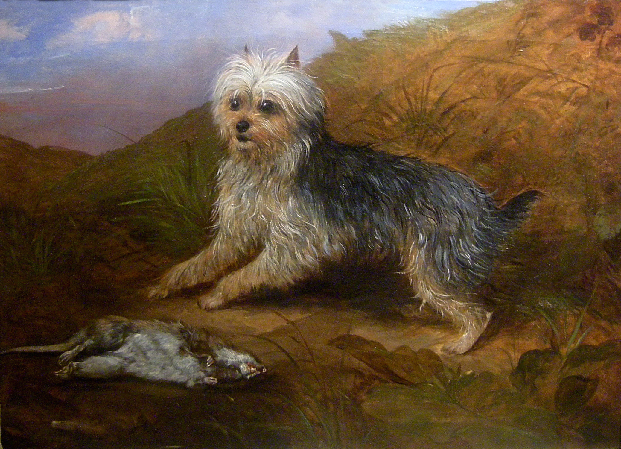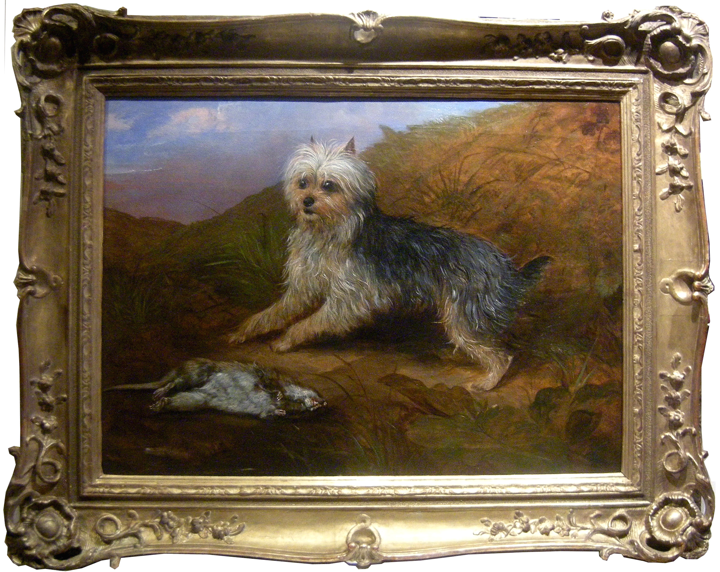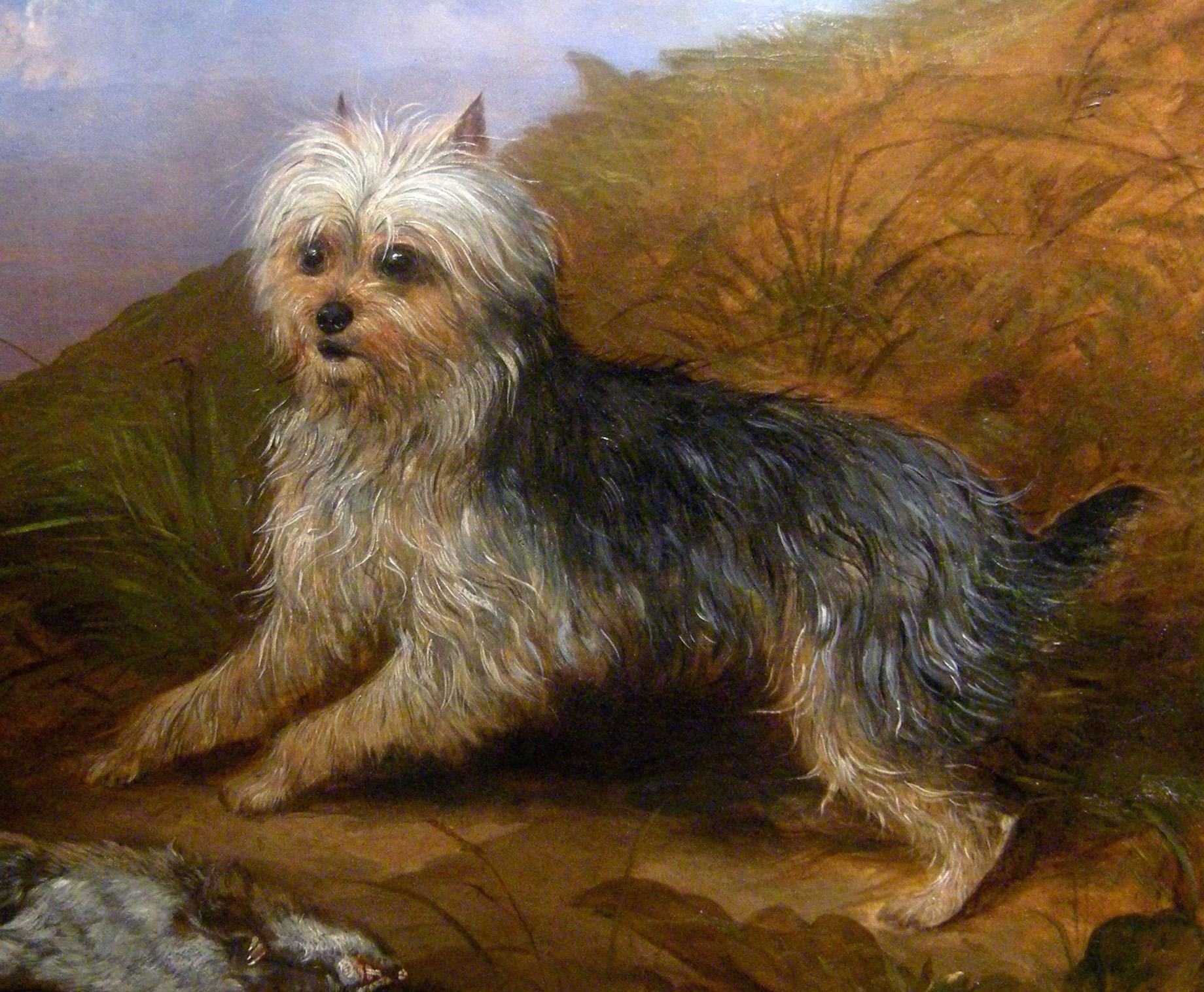 Masterfully animal painting with a yorkshere terrier and his trophy was executed in 1862 by famous represantative of British animalistic school of 19th century Martin Theodore Ward (1799 – 1874). Here is description from the wikipedia: “..The Yorkshire Terrier originated in Yorkshire, a rugged region in northern England, In the mid-19th century, workers from Scotland came to Yorkshire in search of work and brought with them several different varieties of small terriers. The duties of the Yorkshire Terrier were to keep the cities purely from RATS and MICE, but was also used to – illegal -. hunting rabbits . It is believed that through intersection several breeds emerged, under which was the most frequently represented Skye Terrier, possibly with additional participation of the Maltese. The Yorkshire Terrier is up to 3.2 kg, a compact companion dog. Typical is the fine, lustrous long, not curly or wavy hair…”