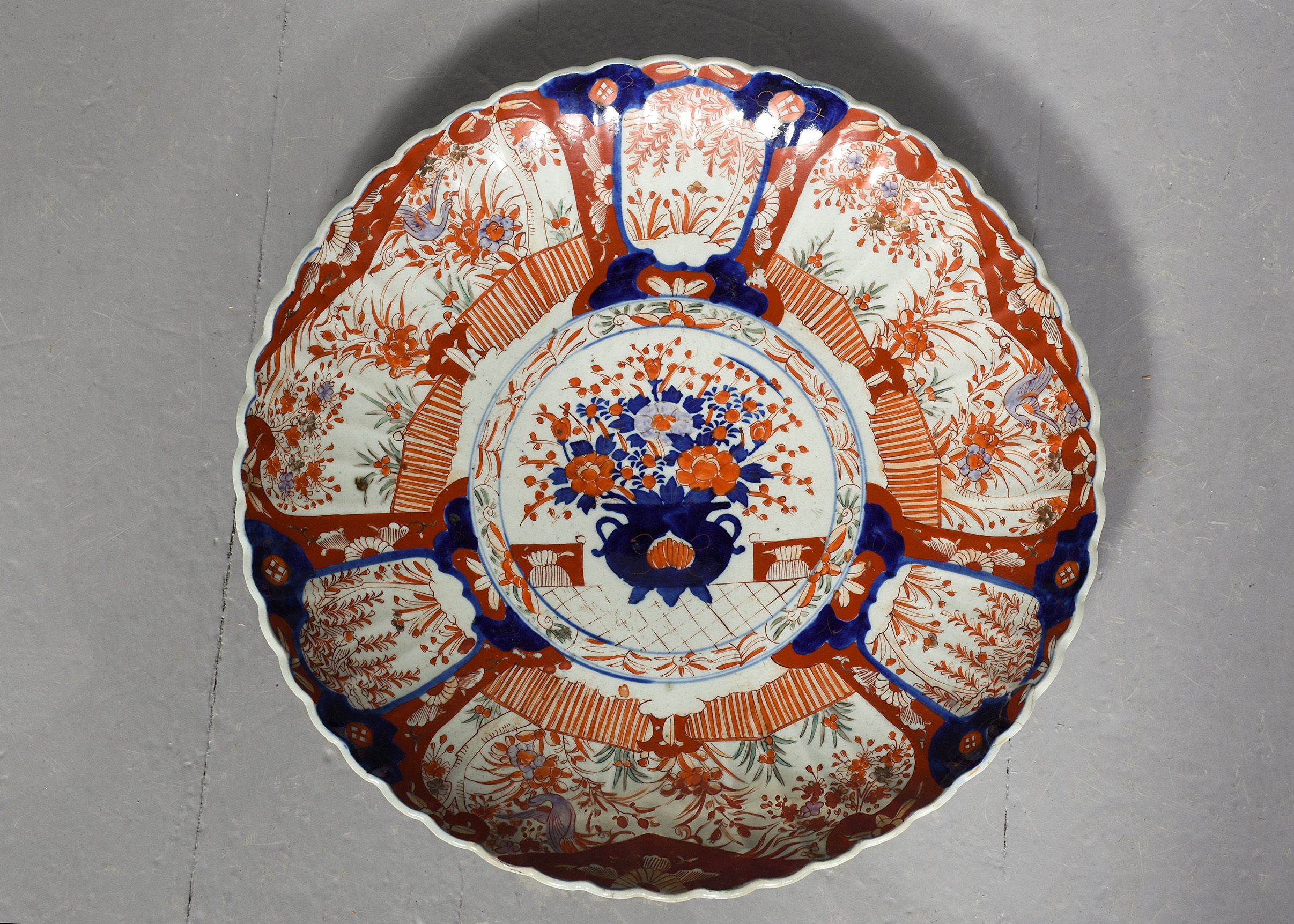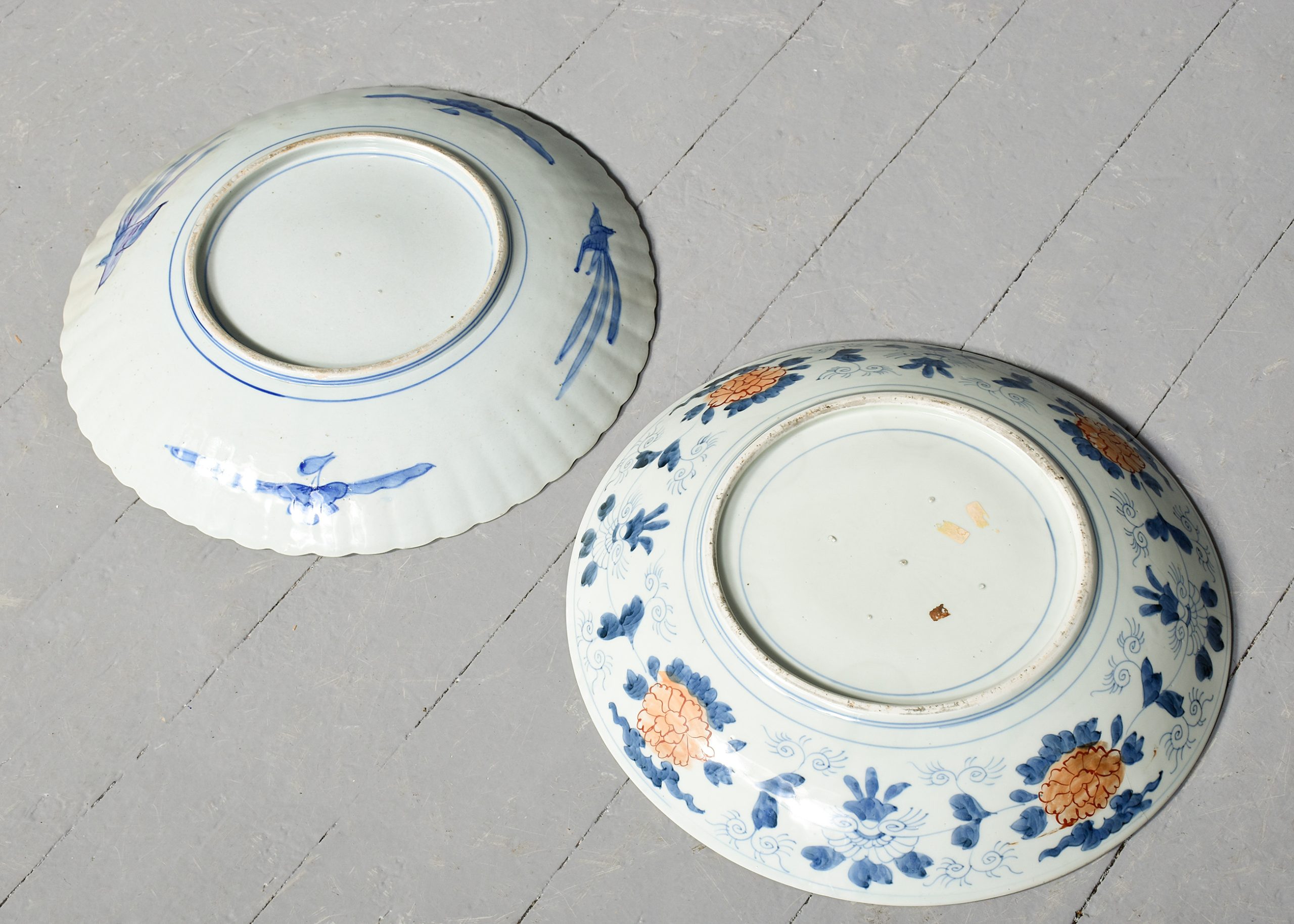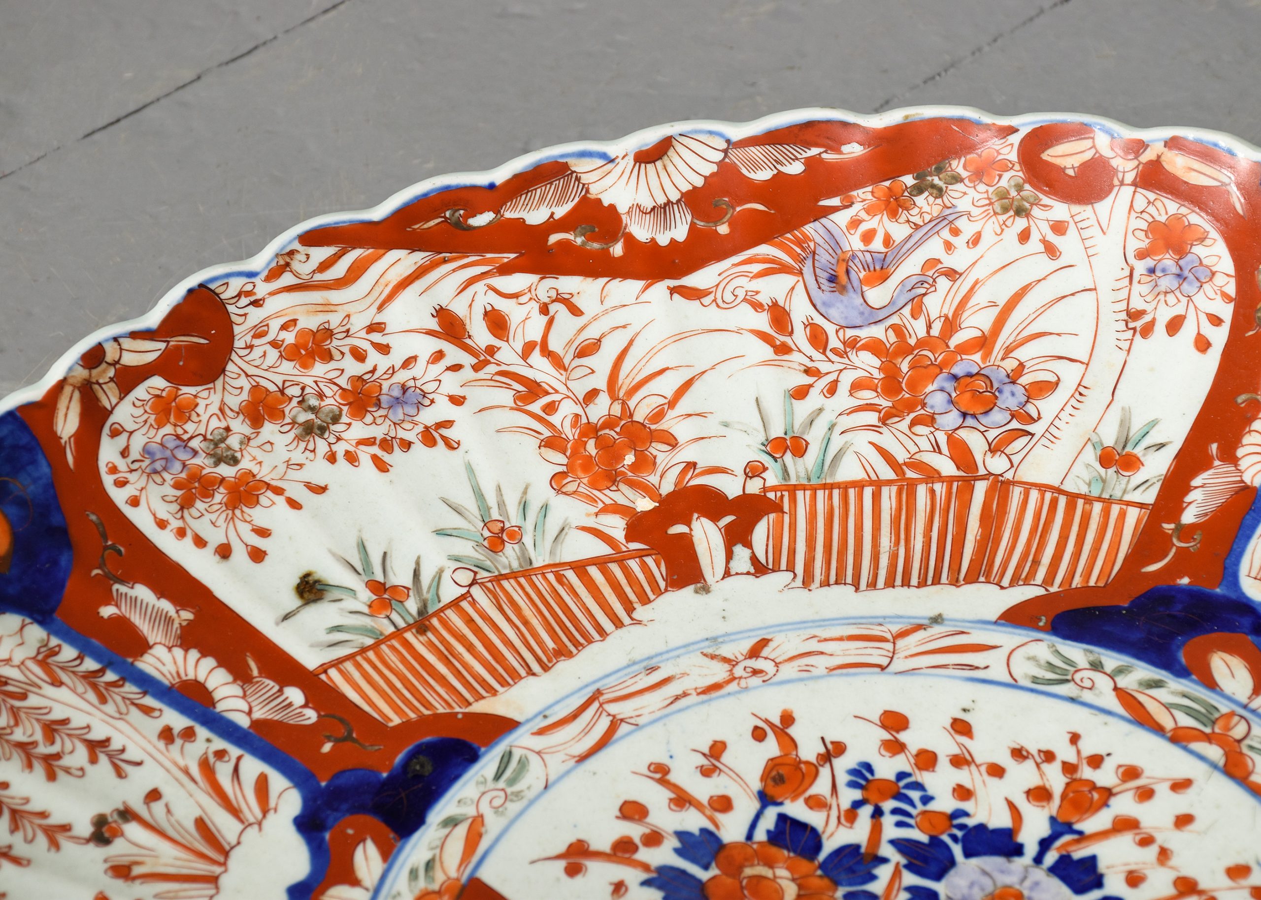 Circa 1890. Two similar Meiji period Japanese Imari platters, one with a wavy edge and ribbing to the body, painted with the classic Imari colours of cobalt blue and red with small patterns throughout, the other with simple rim with painted panels including birds, flowers, and trees in mellow colours