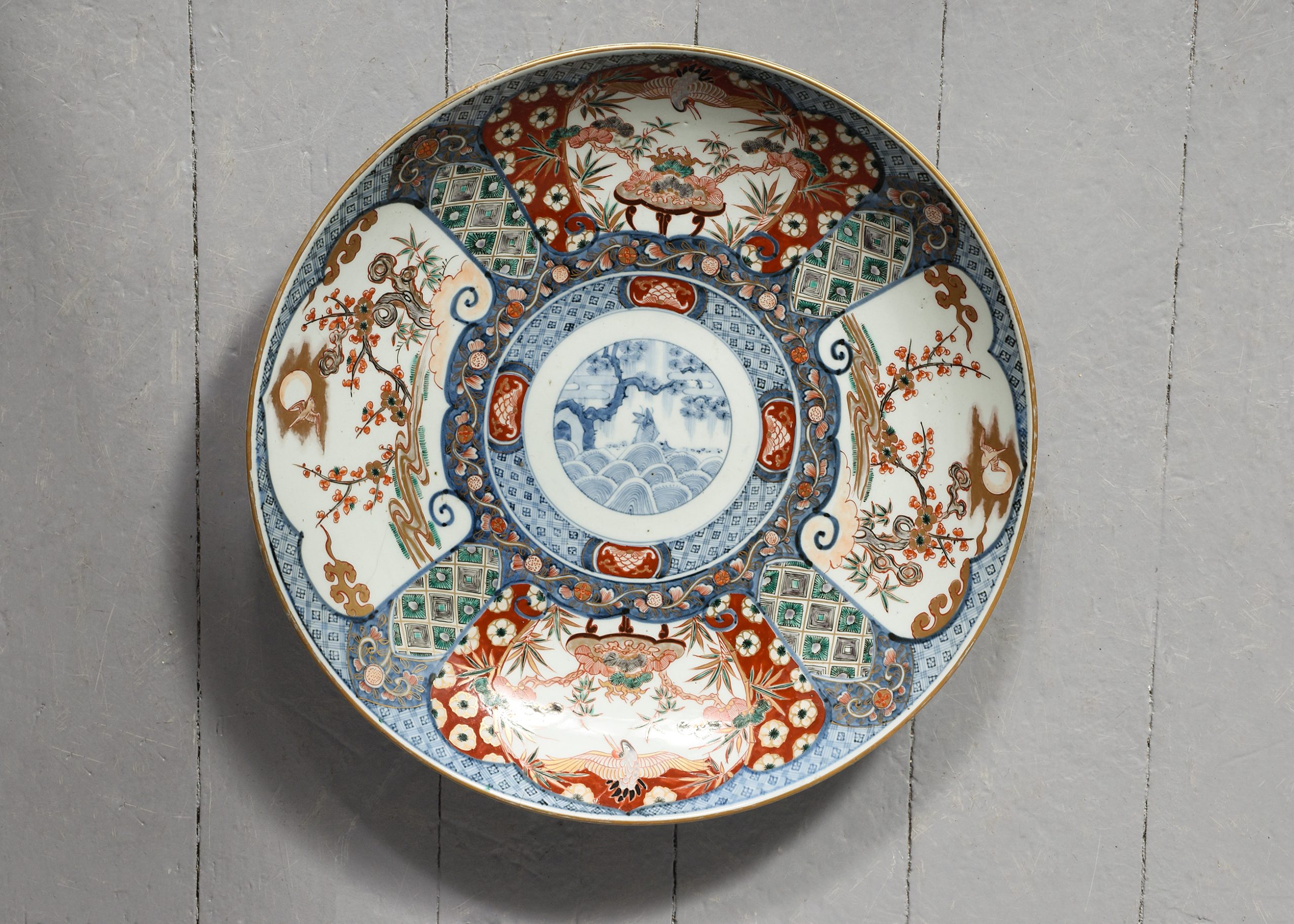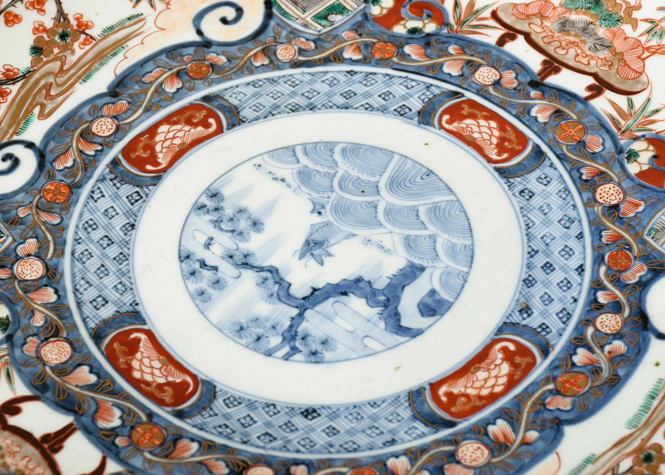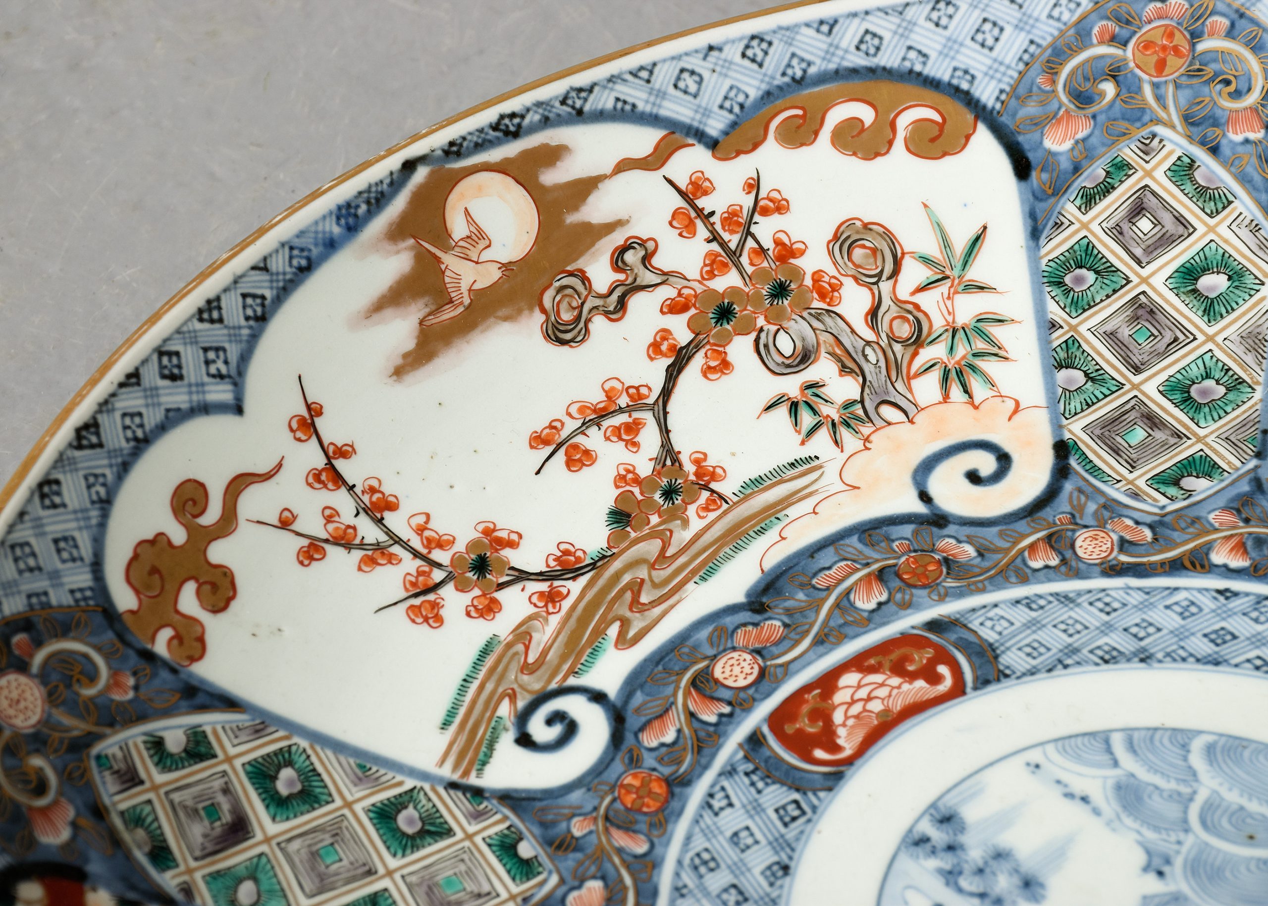 Circa 1890. Two similar Meiji period Japanese Imari platters, one with a wavy edge and ribbing to the body, painted with the classic Imari colours of cobalt blue and red with small patterns throughout, the other with simple rim with painted panels including birds, flowers, and trees in mellow colours