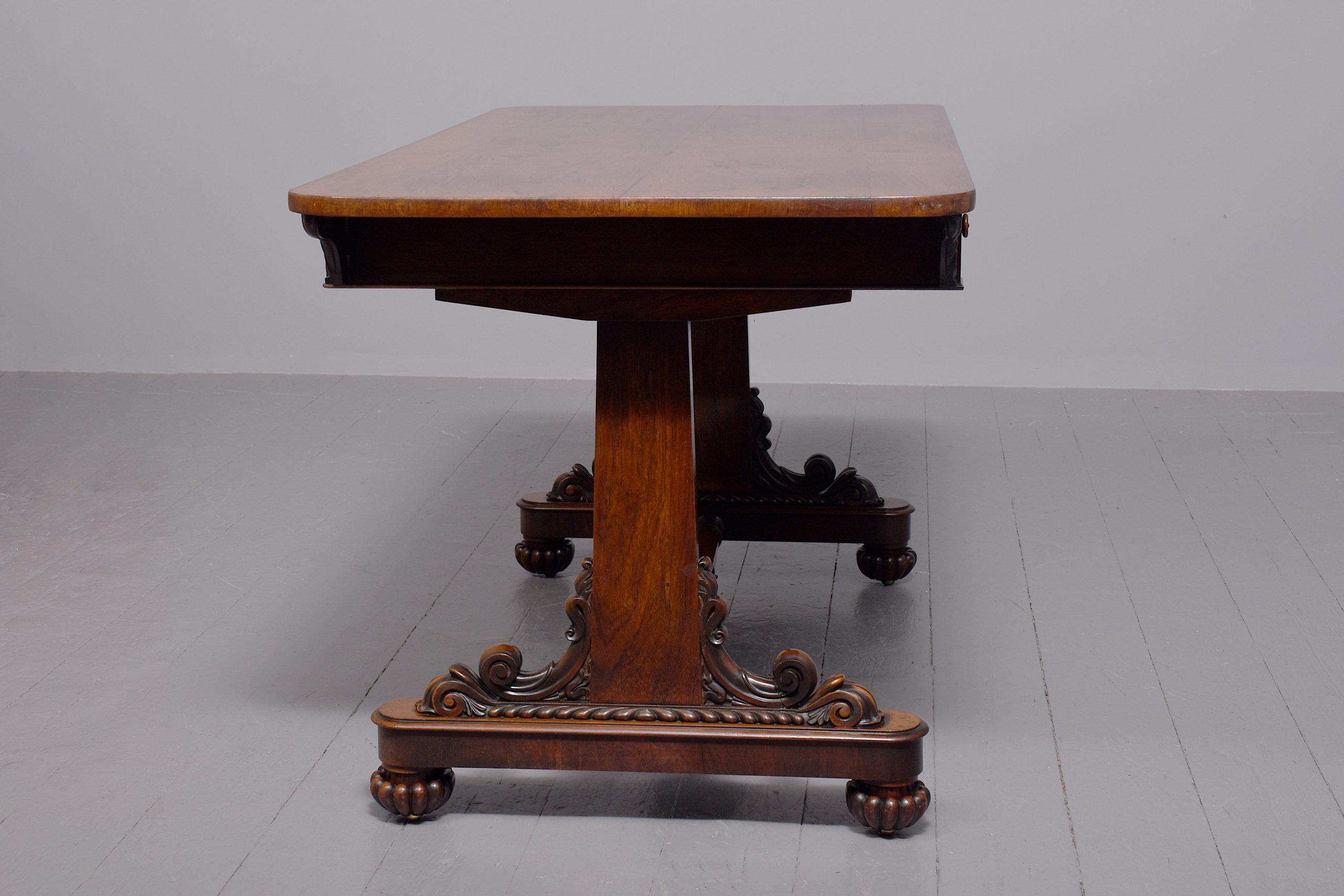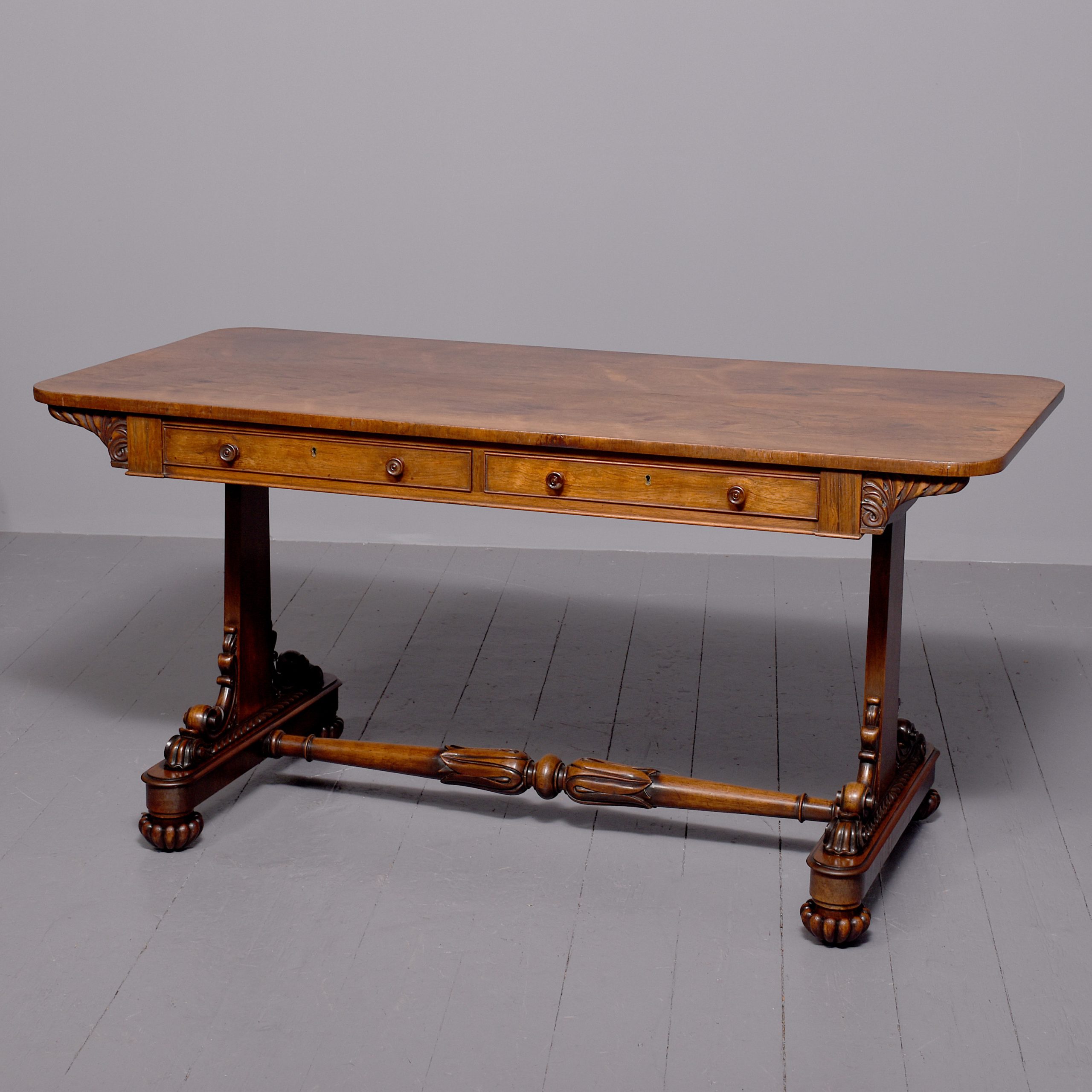 Circa 1815. A rosewood freestanding library table probably by ‘James Mein of Kelso’, the rectangular top with rounded corners in book matched rosewood, the frieze with a pair of drawers on one side and faux drawers on the other side, the overlapping top with foliate carved brackets, supported on a pair of tapering trestles with foliate carving, with buttresses and classic dragooning, all resting on a platform base with rounded corners, simple moulding with a polished frieze sitting on four fluted feet with original concealed castors.