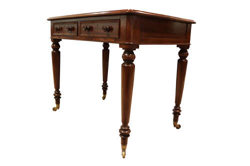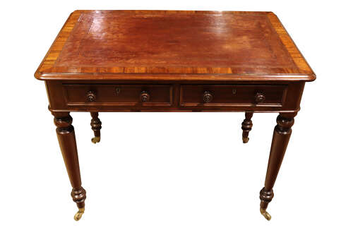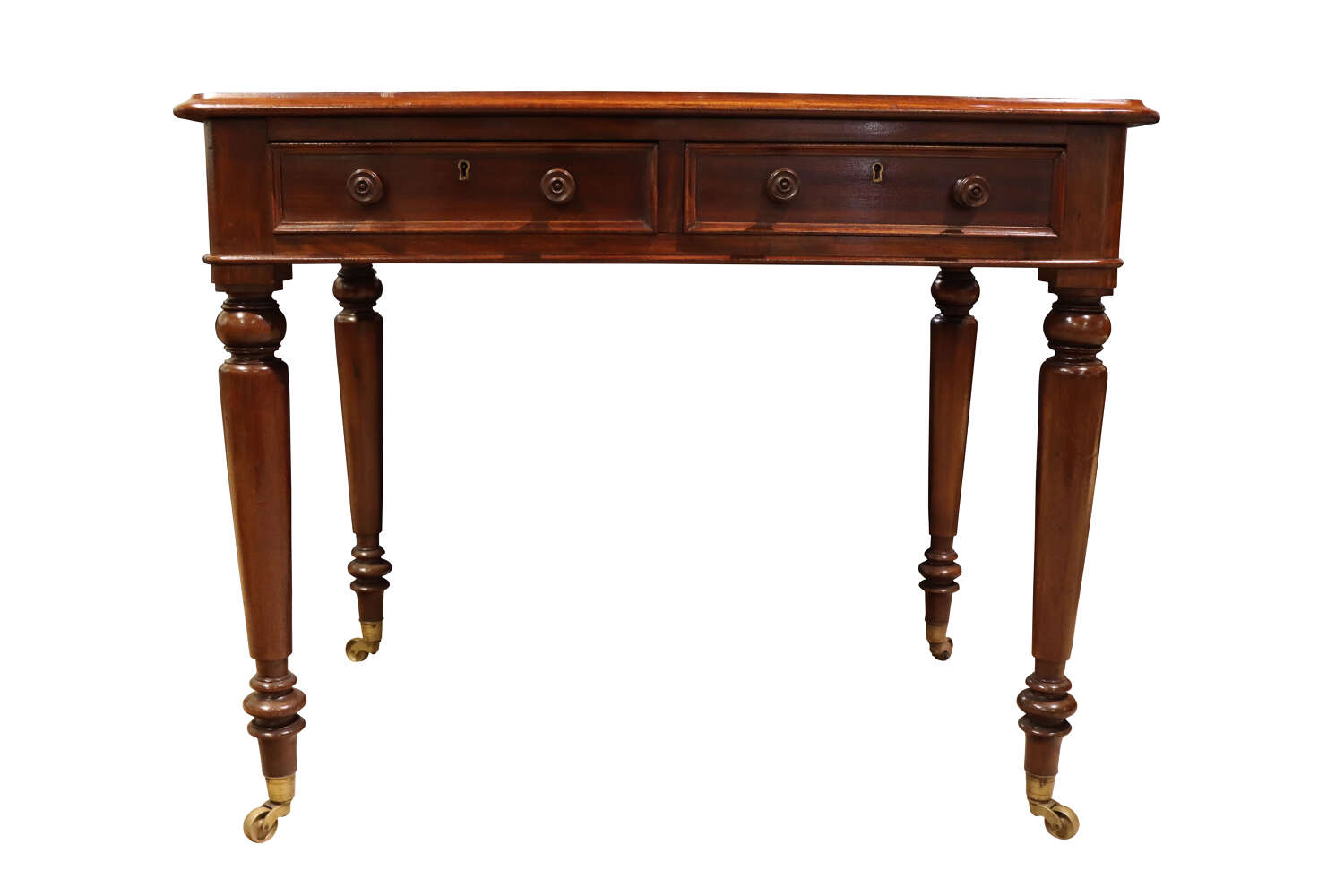 A charming mid-19th century mahogany writing table of smaller, highly usable proportions, dating to circa 1850. The rectangular top retains its original tooled leather inset, beautifully worn and characterful, framed by a crossbanded mahogany border with rounded corners.