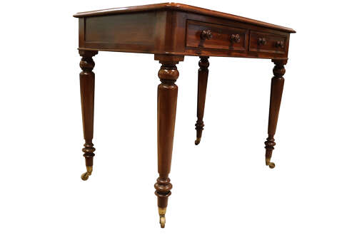 The frieze houses two drawers with turned knob handles and original brass escutcheons. The table stands on elegant tapering turned legs terminating in brass cup castors, giving the piece both movement and refinement.