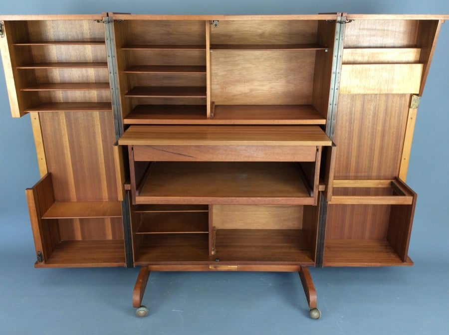 A mid century teak ‘desk in a box’ also named ‘magic box’ c1960’s. Manufactured by London based Newcraft Ltd and inspired by the original designers Mummenthaler & Meier of Switzerland. The cupboard opens to reveal a workstation with fitted interior, having a sliding desktop with dropleaf side extensions, large front drawer, pull-out keyboard slide along with many shelves and organisers. Once folded away the cupboard has an attractive teak grain, stands on casters and has the original lock and key. In very good condition.