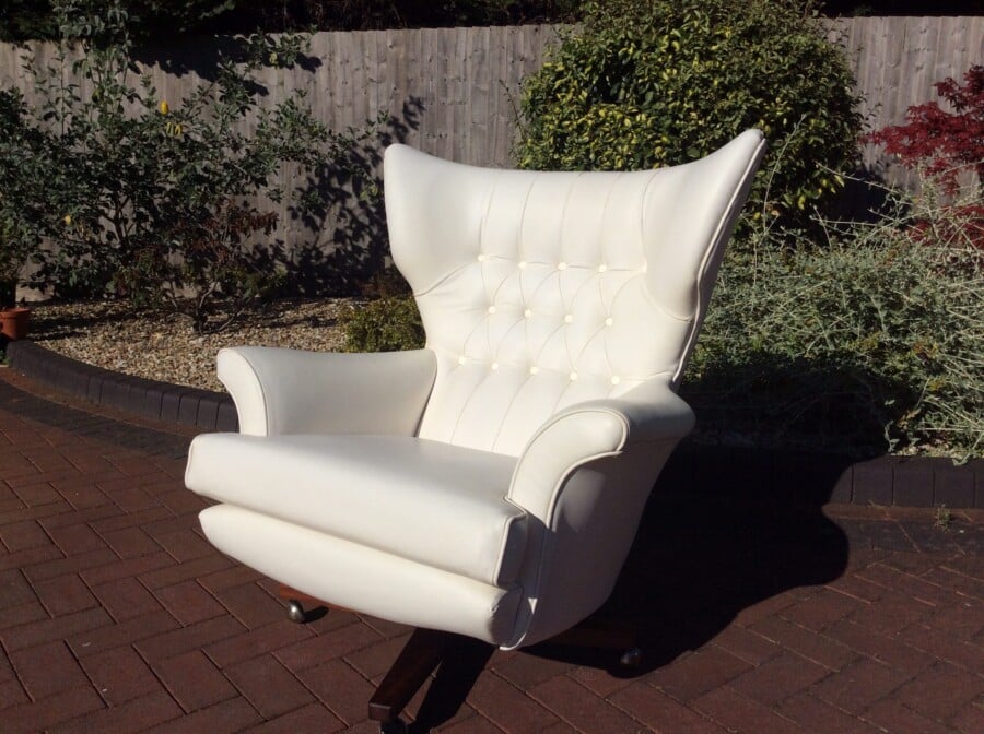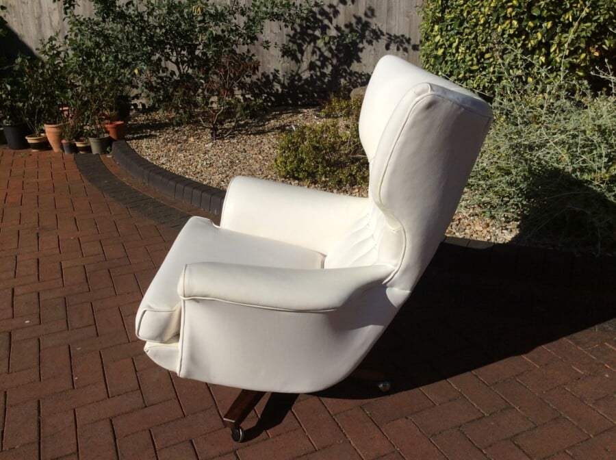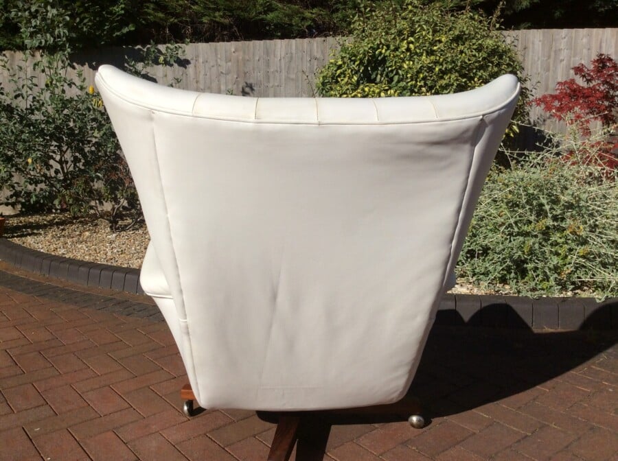 Model 6250 chair by G Plan, designed in 1962 and known as “The World’s Most Comfortable Chair”. Used by the James Bond villain “Blofeld” in the 1967 film “You Only Live Twice”. Upholstered in full leather, having a winged design, deeply buttoned back, a generous seating area with a rocking and swivel feature. It sits on a rosewood base and rolls on casters. In good condition, with light wear consistent with age, no rips or tears.