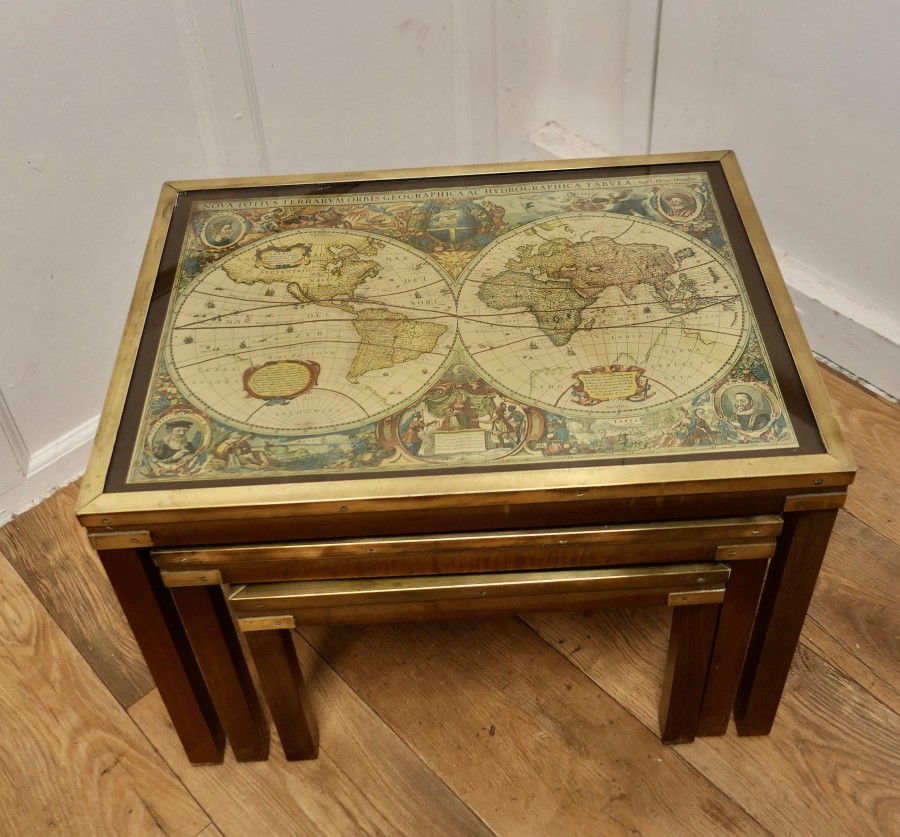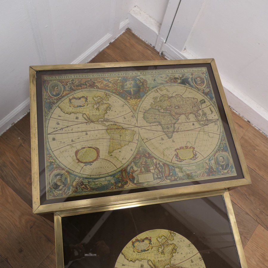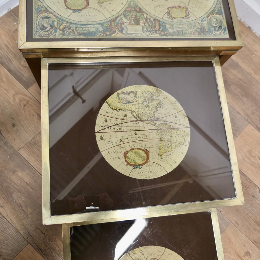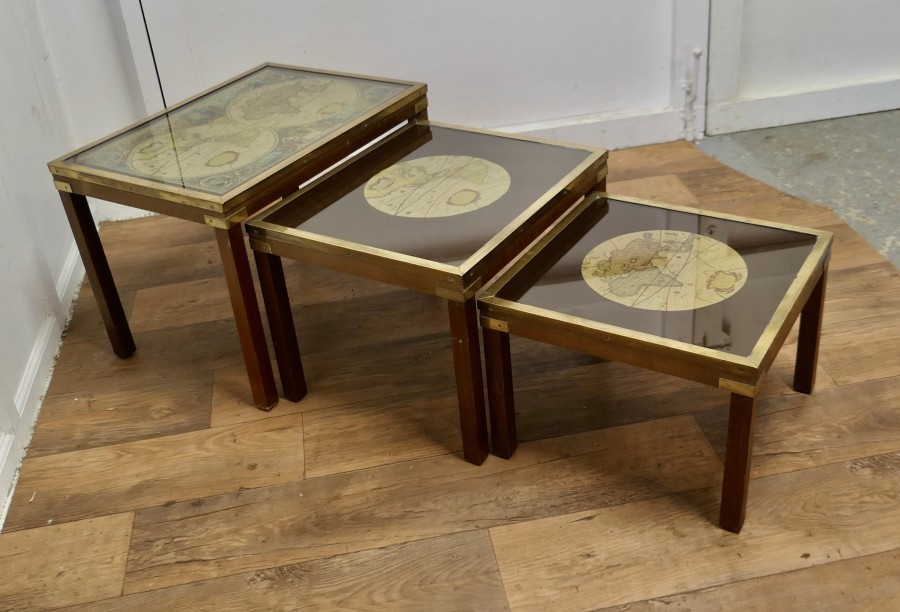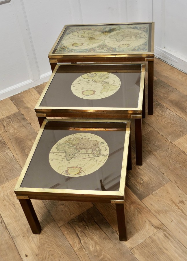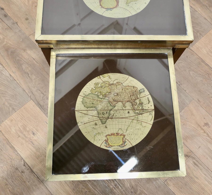 Mid-century Maison Jansen Campaign Style Nest of 3 Tables Nest of 3 Tables, the table tops have brass trim with brass inlay to the Legs and early world maps on black glass These are Classic English drawings, this superb classic trio would suit a high end interior design or possible nautical furnishing The largest table is 18” tall and 25” x 11” TSC181 Manufacture Date : 1960 Materials : Glass